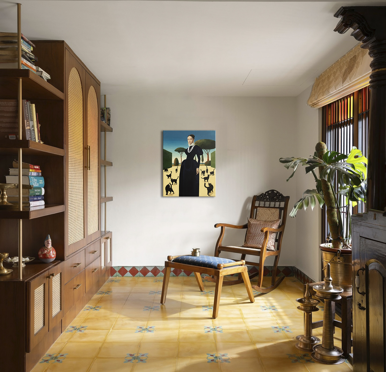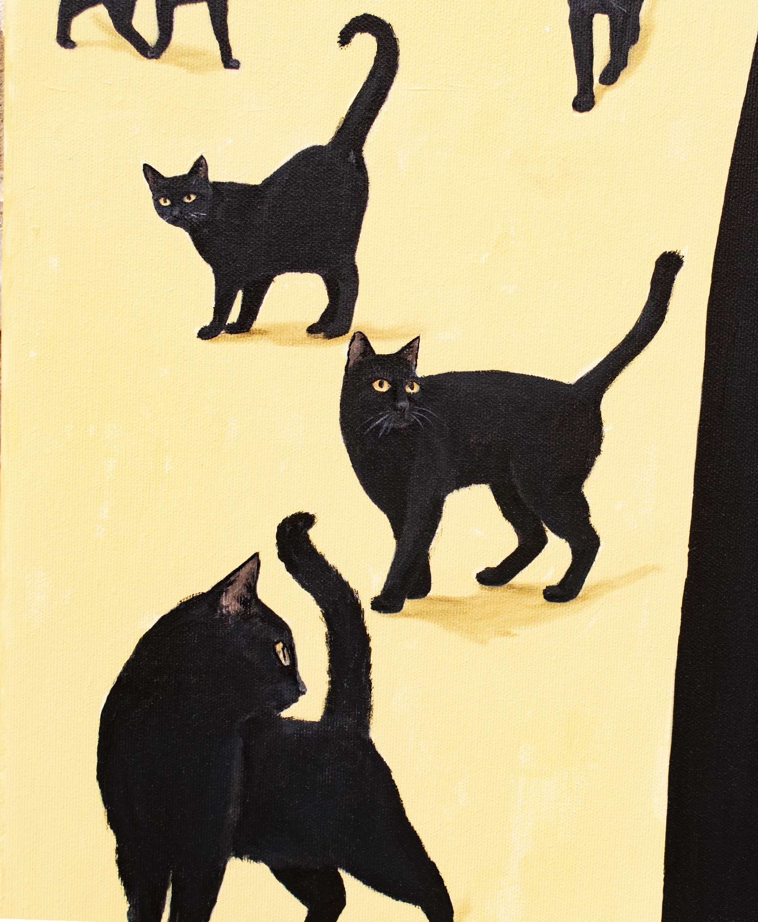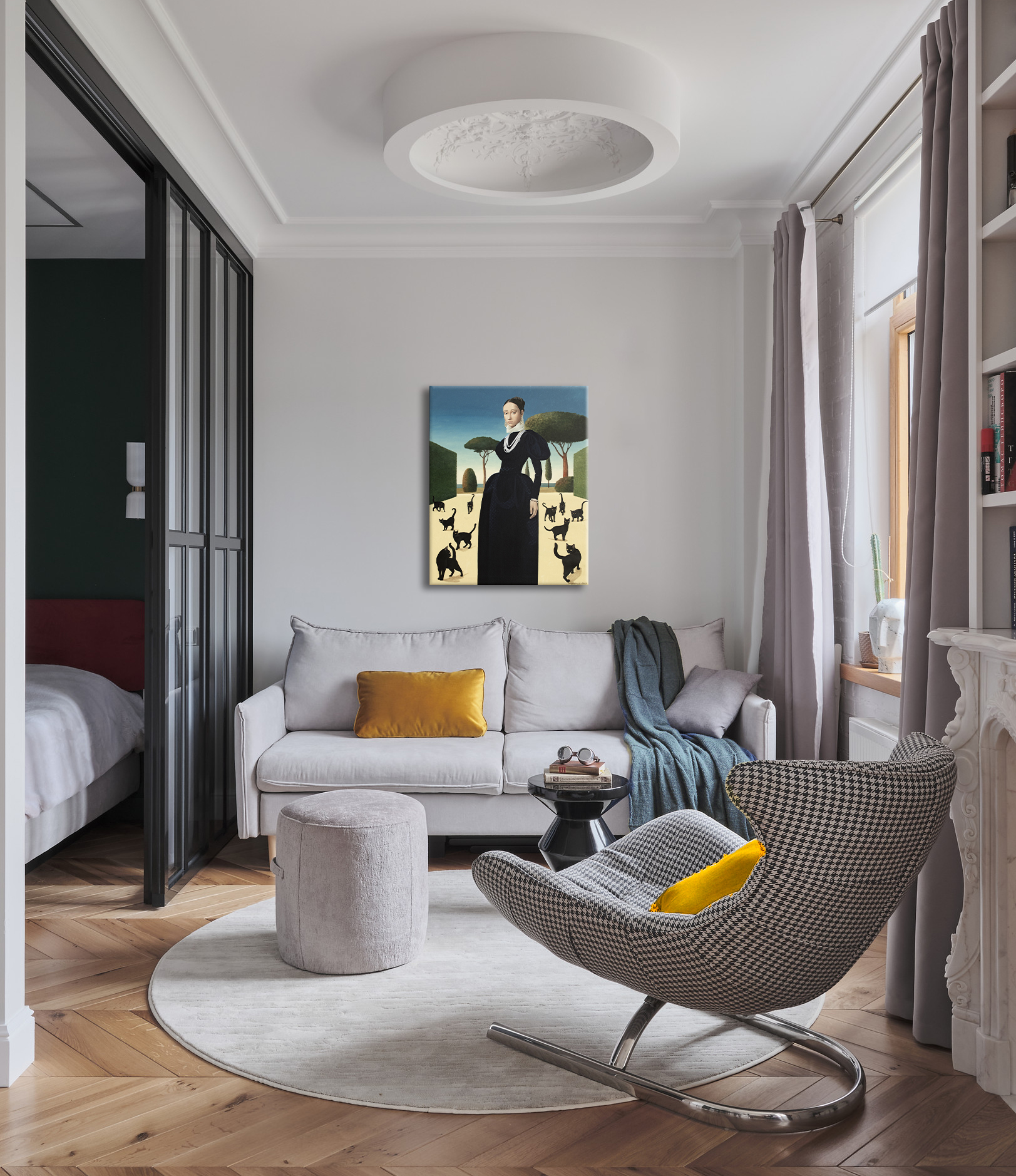 Na obrazie widzimy elegancko ubraną kobietę stojącą w otoczeniu czarnych kotów. Scena jest pełna kontrastów — intensywny błękit nieba i ciemna suknia bohaterki tworzą intrygujący efekt. Drzewa na horyzoncie mają nietypowe, kuliste kształty, co nadaje całemu krajobrazowi nieco surrealistycznego charakteru. Koty, z ogonkami uniesionymi do góry, wydają się być zaintrygowane obecnością kobiety. Obraz emanuje pewnym tajemniczym spokojem. Styl nawiązuje do klasycznych portretów renesansowych, ale ma w sobie coś współczesnego. Technika wydaje się być precyzyjna, z dużym naciskiem na detale — jakby artysta chciał nam coś important przekazać, coś ukrytego między liniami i cieniami. Można się zastanawiać, o czym myśli ta kobieta. Czy te koty to zwykłe, ciekawskie futrzaki czy może symbol czegoś głębszego? Obraz może budzić różne emocje, od fascynacji po lekki niepokój. Czuję, że ten obraz mówi o samotności, ale w taki piękny sposób, że aż chce się go oglądać bez końca. Można się w nim łatwo zatracić, jak w dobrej książce, gdzie każdy detal ma znaczenie. Do stworzenia obrazu użyto holenderskich farb akrylowych Amsterdam™ oraz włoskiego płótna marki Unico. Powierzchnię zabezpieczono satynowym werniksem, a boki zostały pomalowane w kolorze tła. Obraz powstał na naciągniętym płótnie na drewnianej ramie, jest sygnowany i opatrzony certyfikatem autentyczności. Starannie zapakowany – owinięty w folię bąbelkową i umieszczony w kartonowym pudełku – gotowy, by wyruszyć w swoją własną podróż.