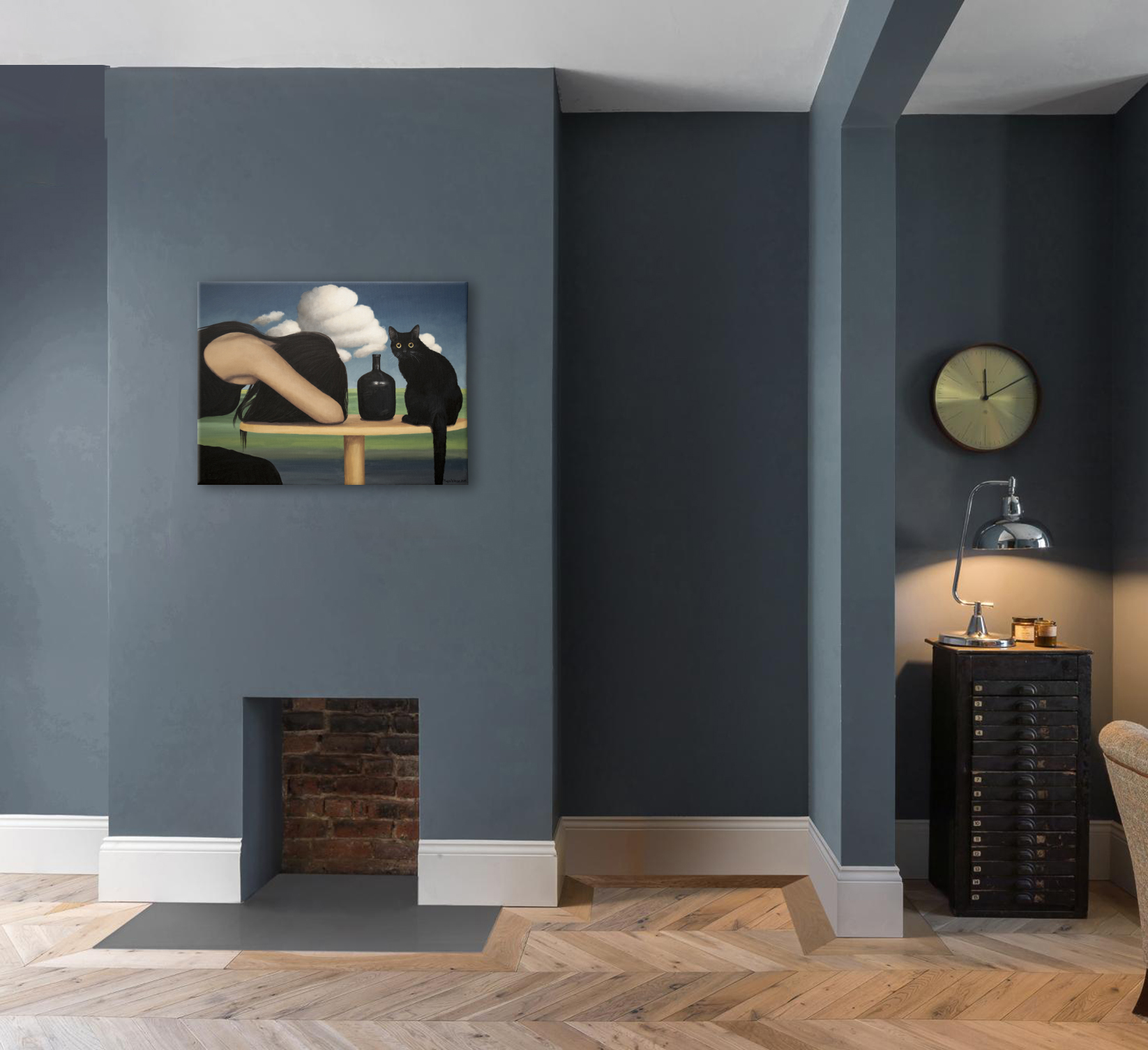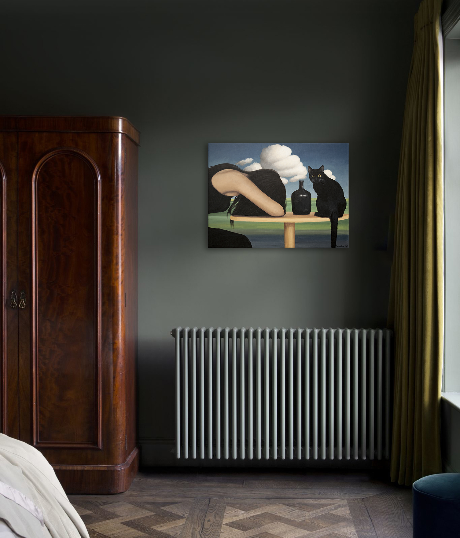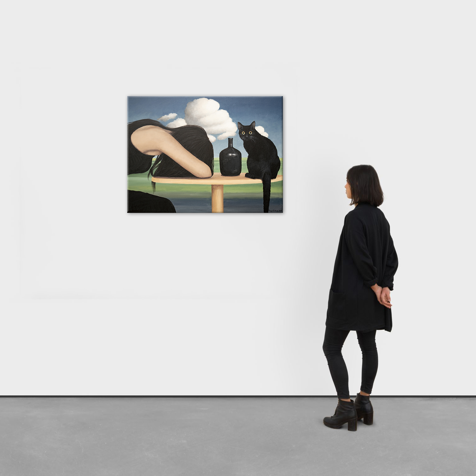 Obraz zaprasza widza do cichego, nieco surrealistycznego momentu zawieszonego między rzeczywistością a snem. Młoda kobieta, ubrana w czerń, pochyla się nad okrągłym drewnianym stołem — jej postura sugeruje zmęczenie, zadumę albo poszukiwanie wewnętrznego schronienia. Obok niej siedzi lśniący czarny kot o złotych, świetlistych oczach, jakby jedynie on potrafił spojrzeć poza kadr i dostrzec niewypowiedziane myśli widza. Nad całą sceną rozciąga się rozległe niebo, a chmury przesuwają się jak lekkie, bezwładne rzeźby. Butelka stojąca na stole staje się symbolicznym punktem zakotwiczenia — naczyniem ukrytych historii, niewylanych emocji lub po prostu cichym towarzyszem tej intymnej chwili. Kompozycja subtelnie operuje kontrastem: zaokrąglona sylwetka kobiety współgra z formą stołu, natomiast wyprostowana postawa kota wprowadza stabilizującą pionowość. Ta równowaga prowadzi wzrok i pozwala widzowi utożsamić się z napięciem między odpoczynkiem a czujnością. Obraz został stworzony, by wywołać poczucie introspektywnego spokoju. Przemawia do kolekcjonerów poszukujących głębi, narracji oraz dzieł, które z czasem odsłaniają kolejne znaczenia, zapraszając do wielokrotnego powrotu i nowych interpretacji. Użyto holenderskich farb akrylowych Amsterdam™ oraz włoskiego płótna Unico. Wykończenie — satynowy werniks; boki zamalowane w kolorze tła. Praca powstała na naciągniętym na drewnianą ramę płótnie. Obraz jest starannie zapakowany w kartonowe pudełko z kilkoma warstwami folii bąbelkowej. Podpisany przez autorkę i dołączony jest certyfikat autentyczności.