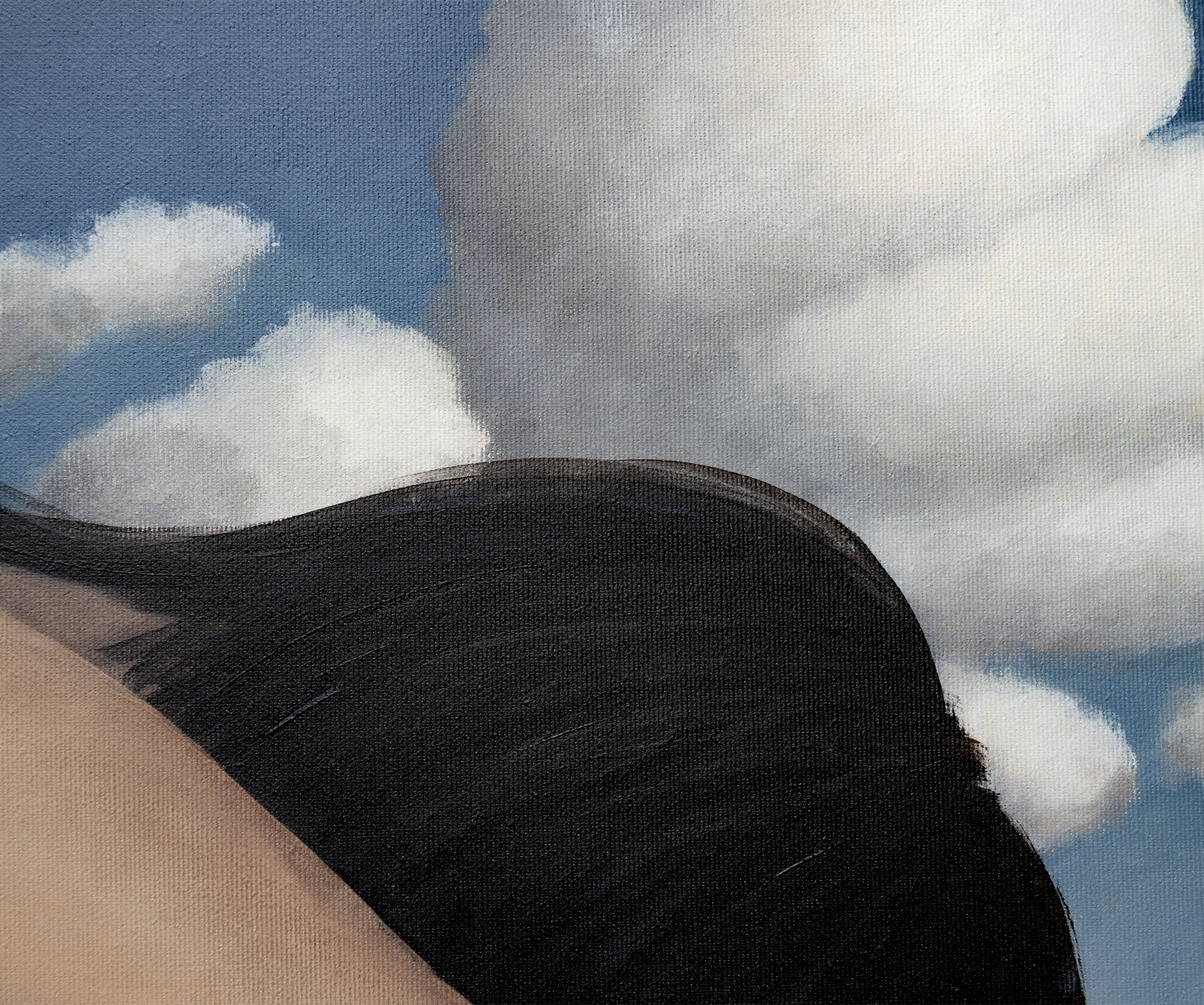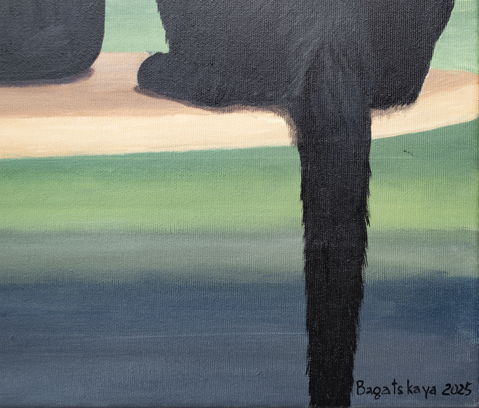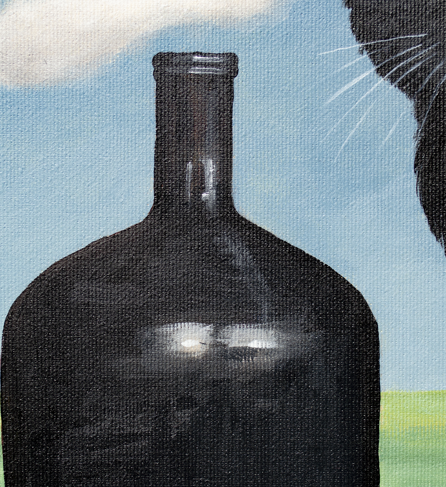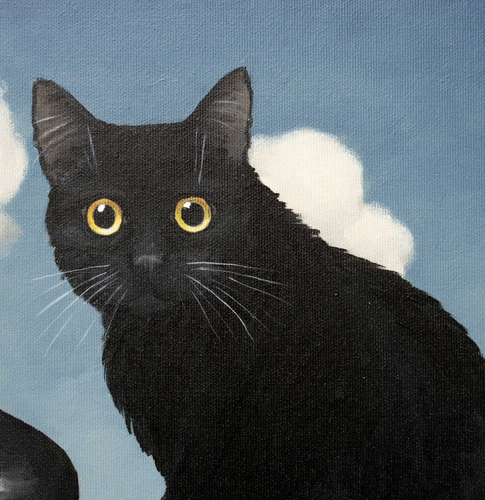 Obraz zaprasza widza do cichego, nieco surrealistycznego momentu zawieszonego między rzeczywistością a snem. Młoda kobieta, ubrana w czerń, pochyla się nad okrągłym drewnianym stołem — jej postura sugeruje zmęczenie, zadumę albo poszukiwanie wewnętrznego schronienia. Obok niej siedzi lśniący czarny kot o złotych, świetlistych oczach, jakby jedynie on potrafił spojrzeć poza kadr i dostrzec niewypowiedziane myśli widza. Nad całą sceną rozciąga się rozległe niebo, a chmury przesuwają się jak lekkie, bezwładne rzeźby. Butelka stojąca na stole staje się symbolicznym punktem zakotwiczenia — naczyniem ukrytych historii, niewylanych emocji lub po prostu cichym towarzyszem tej intymnej chwili. Kompozycja subtelnie operuje kontrastem: zaokrąglona sylwetka kobiety współgra z formą stołu, natomiast wyprostowana postawa kota wprowadza stabilizującą pionowość. Ta równowaga prowadzi wzrok i pozwala widzowi utożsamić się z napięciem między odpoczynkiem a czujnością. Obraz został stworzony, by wywołać poczucie introspektywnego spokoju. Przemawia do kolekcjonerów poszukujących głębi, narracji oraz dzieł, które z czasem odsłaniają kolejne znaczenia, zapraszając do wielokrotnego powrotu i nowych interpretacji. Użyto holenderskich farb akrylowych Amsterdam™ oraz włoskiego płótna Unico. Wykończenie — satynowy werniks; boki zamalowane w kolorze tła. Praca powstała na naciągniętym na drewnianą ramę płótnie. Obraz jest starannie zapakowany w kartonowe pudełko z kilkoma warstwami folii bąbelkowej. Podpisany przez autorkę i dołączony jest certyfikat autentyczności.