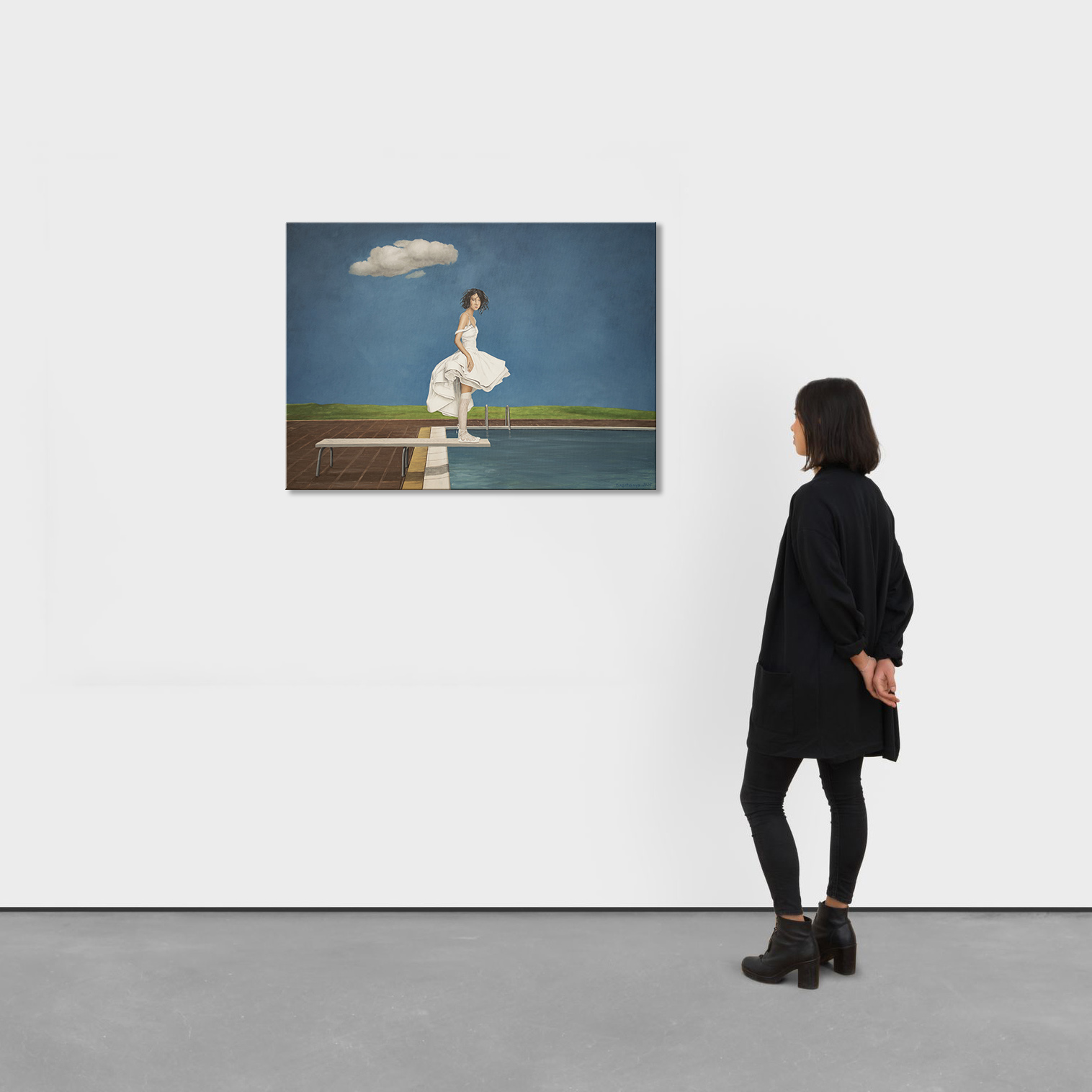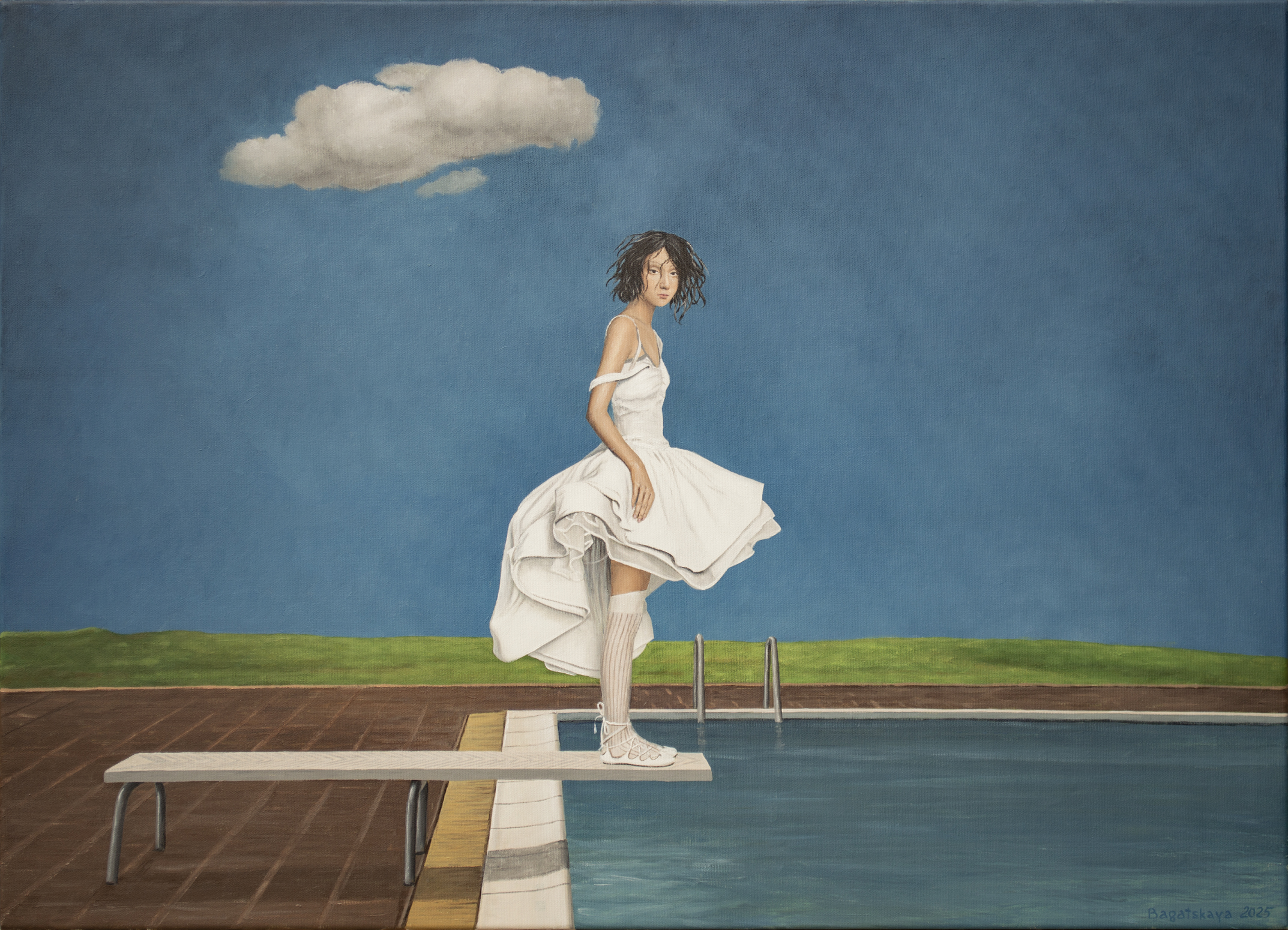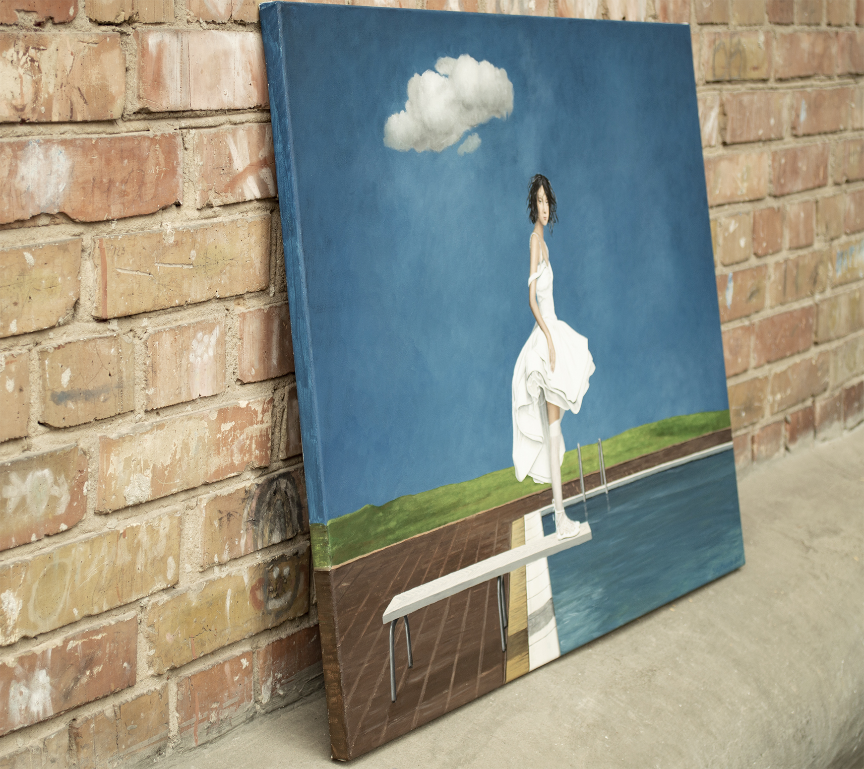 Ten obraz uchwycił moment, w którym czas wydaje się zatrzymać. Młoda kobieta stoi na krawędzi trampoliny, a jej biała sukienka delikatnie porusza się na lekkim wietrze. Rozległe kobaltowe niebo, przerwane jedynie przez pojedynczą unoszącą się chmurę, potęguje wokół niej poczucie spokoju. Wydaje się zawieszona między wahaniem a odwagą, przygotowując się nie tylko do skoku, lecz także do symbolicznego kroku w nieznane. Delikatne pochylenie ciała, cicha koncentracja w jej postawie i miękkie światło padające na fałdy sukienki wciągają widza w jej emocjonalną przestrzeń. To połączenie przemienia scenę w refleksję nad naszymi własnymi momentami przejścia — spokojem przed zmianą, pięknem niepewności i cichą siłą potrzebną do ruszenia naprzód. Minimalistyczna kompozycja pozwala, aby każdy szczegół wyróżniał się wyraźnie. Krystalicznie białe elementy, rzeźbiarski przepływ tkaniny i czyste linie przy basenie tworzą zrównoważoną harmonię między realizmem a subtelnym surrealizmem. Ta prostota zachęca widzów do projektowania własnych historii na tej scenie, czyniąc dzieło zarówno wizualnie pociągającym, jak i osobiście rezonującym. Efekt końcowy to nie tylko obraz, lecz narracja, która rozwija się w czasie. Do stworzenia obrazu użyto holenderskich farb akrylowych Amsterdam TM oraz włoskiego płótna firmy Unico. Wykończenie jest w satynowym werniksie, a krawędzie pomalowane są kolorem tła. Obraz został namalowany na płótnie naciągniętym na drewnianą ramę. Jest starannie zapakowany w karton z warstwami folii bąbelkowej. Dzieło jest podpisane i opatrzone certyfikatem autentyczności.