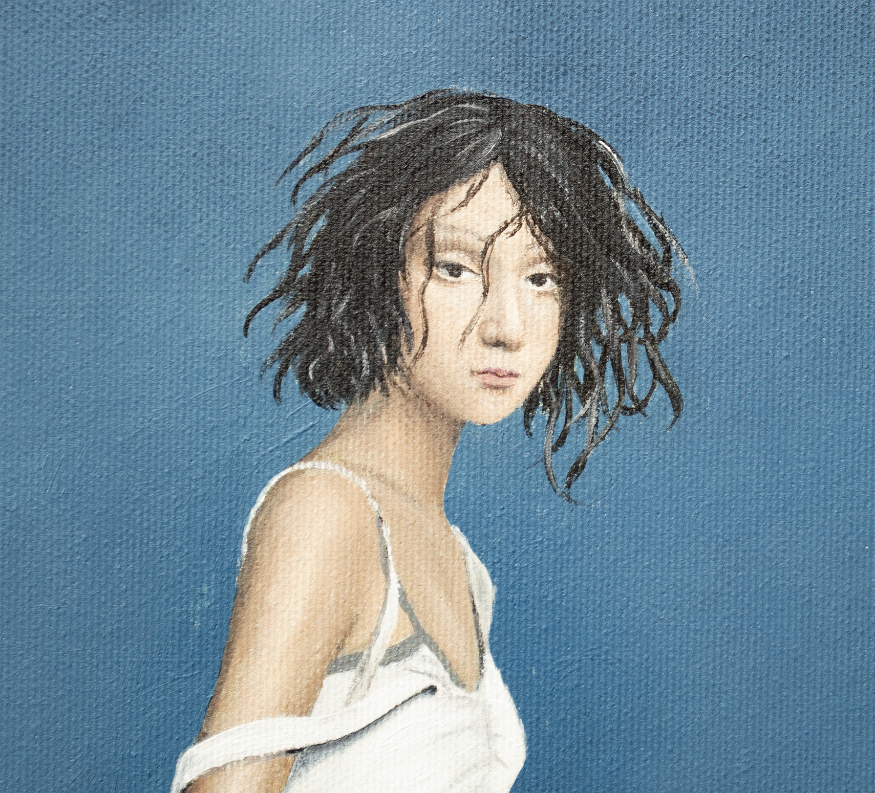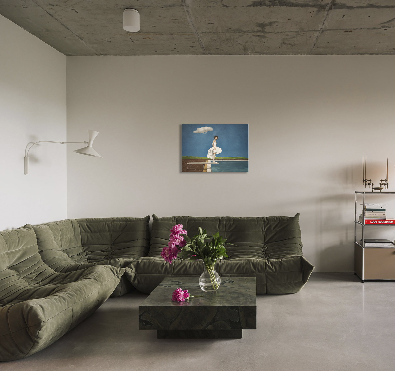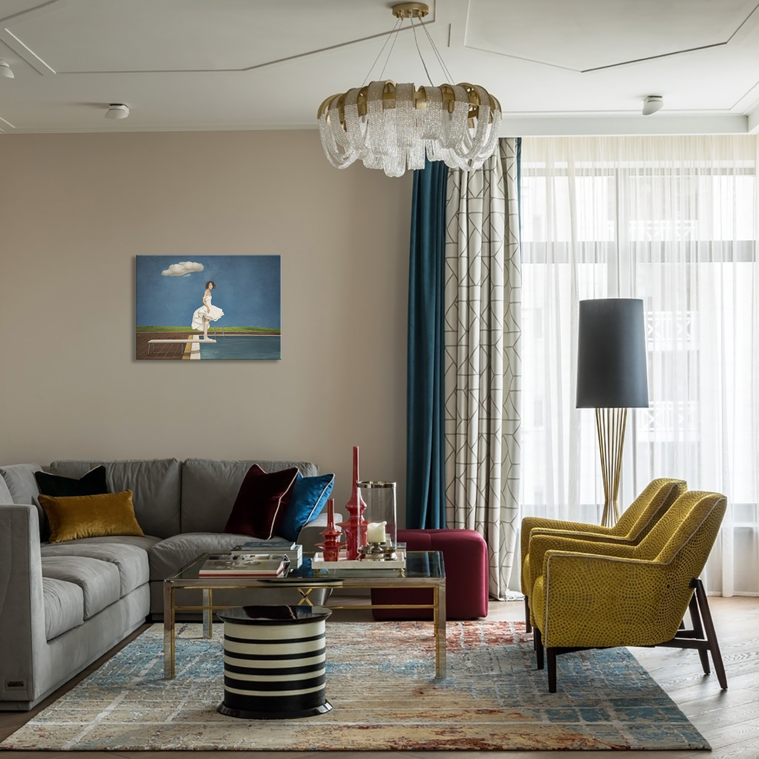 Ten obraz uchwycił moment, w którym czas wydaje się zatrzymać. Młoda kobieta stoi na krawędzi trampoliny, a jej biała sukienka delikatnie porusza się na lekkim wietrze. Rozległe kobaltowe niebo, przerwane jedynie przez pojedynczą unoszącą się chmurę, potęguje wokół niej poczucie spokoju. Wydaje się zawieszona między wahaniem a odwagą, przygotowując się nie tylko do skoku, lecz także do symbolicznego kroku w nieznane. Delikatne pochylenie ciała, cicha koncentracja w jej postawie i miękkie światło padające na fałdy sukienki wciągają widza w jej emocjonalną przestrzeń. To połączenie przemienia scenę w refleksję nad naszymi własnymi momentami przejścia — spokojem przed zmianą, pięknem niepewności i cichą siłą potrzebną do ruszenia naprzód. Minimalistyczna kompozycja pozwala, aby każdy szczegół wyróżniał się wyraźnie. Krystalicznie białe elementy, rzeźbiarski przepływ tkaniny i czyste linie przy basenie tworzą zrównoważoną harmonię między realizmem a subtelnym surrealizmem. Ta prostota zachęca widzów do projektowania własnych historii na tej scenie, czyniąc dzieło zarówno wizualnie pociągającym, jak i osobiście rezonującym. Efekt końcowy to nie tylko obraz, lecz narracja, która rozwija się w czasie. Do stworzenia obrazu użyto holenderskich farb akrylowych Amsterdam TM oraz włoskiego płótna firmy Unico. Wykończenie jest w satynowym werniksie, a krawędzie pomalowane są kolorem tła. Obraz został namalowany na płótnie naciągniętym na drewnianą ramę. Jest starannie zapakowany w karton z warstwami folii bąbelkowej. Dzieło jest podpisane i opatrzone certyfikatem autentyczności.