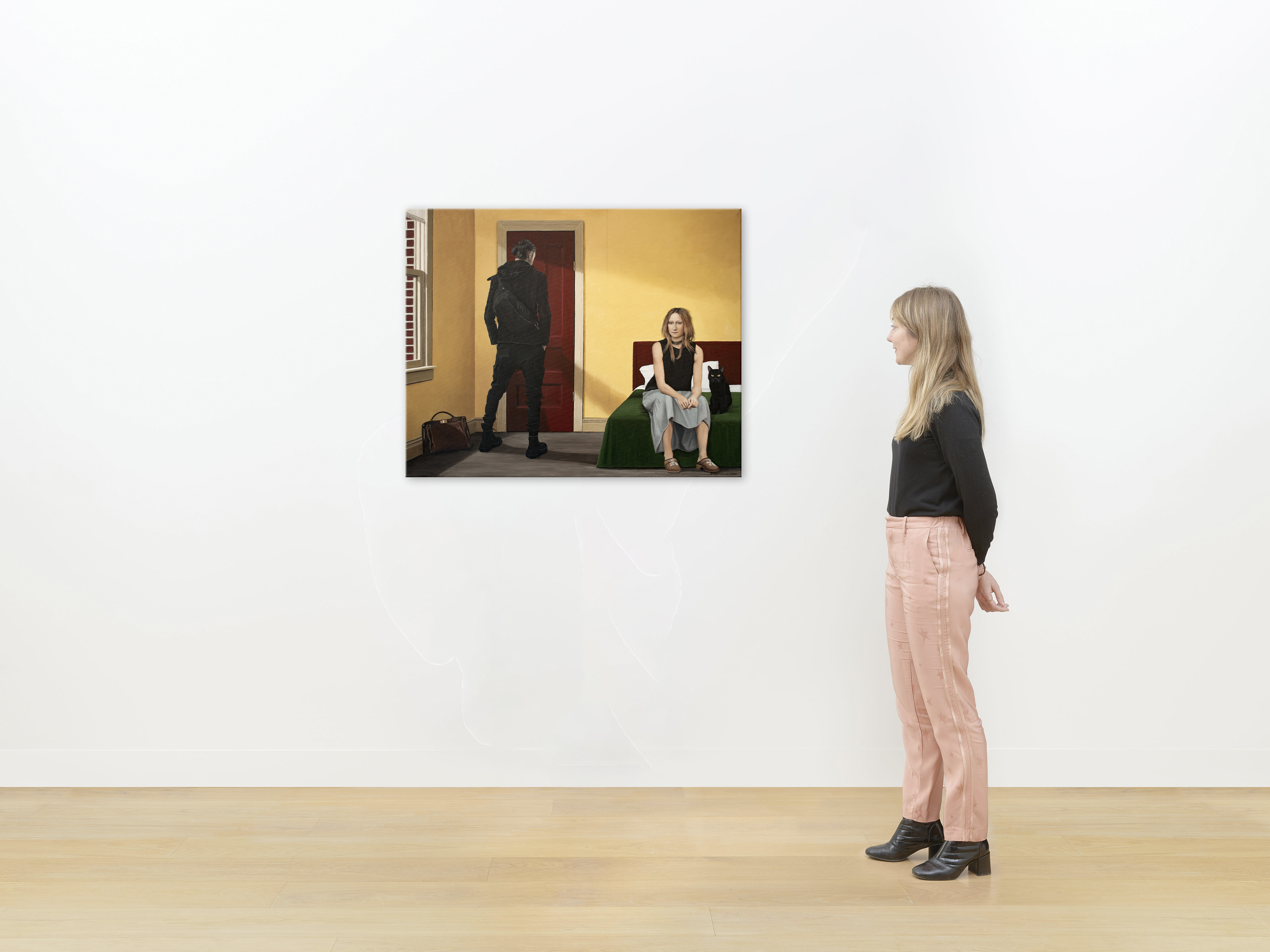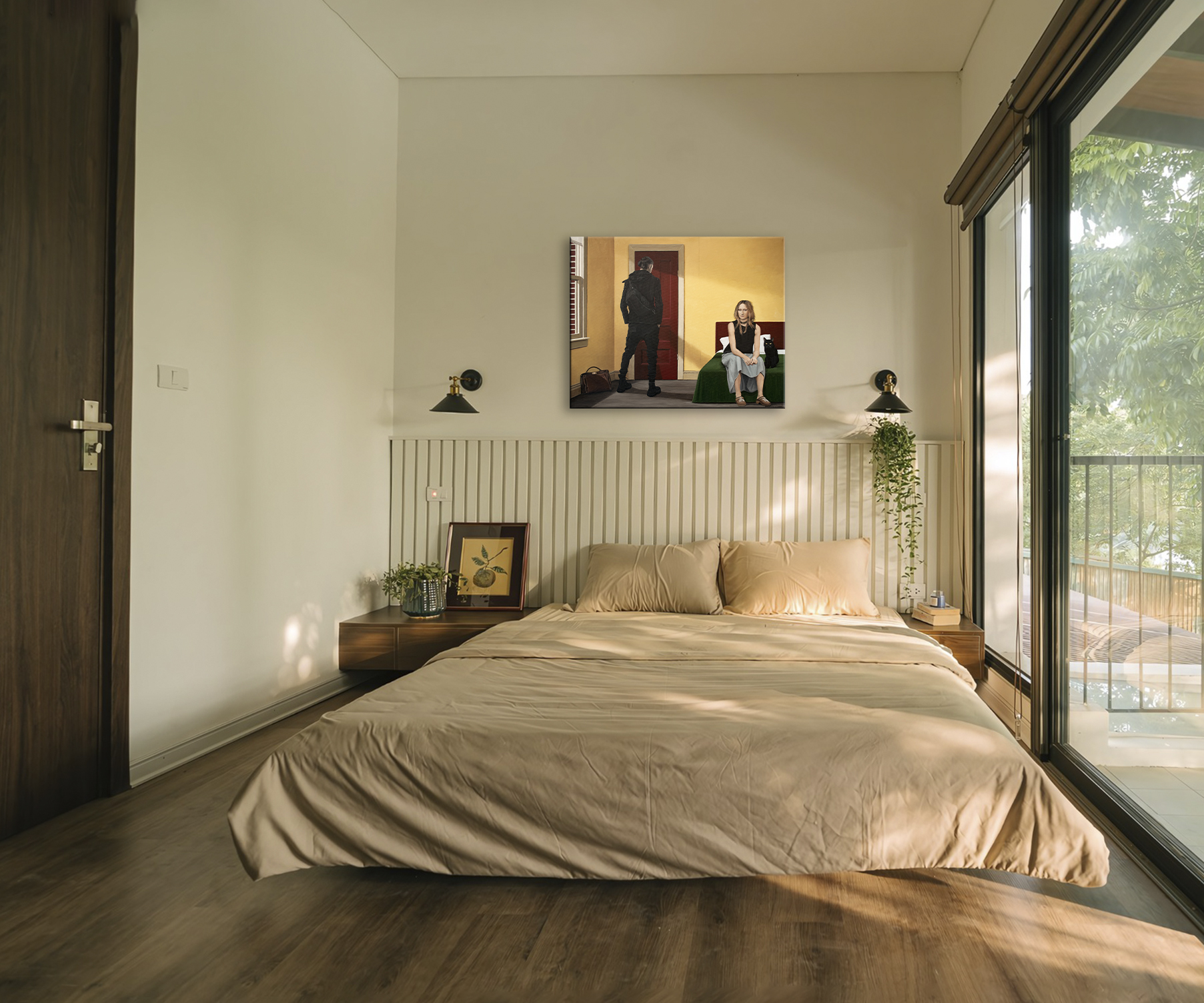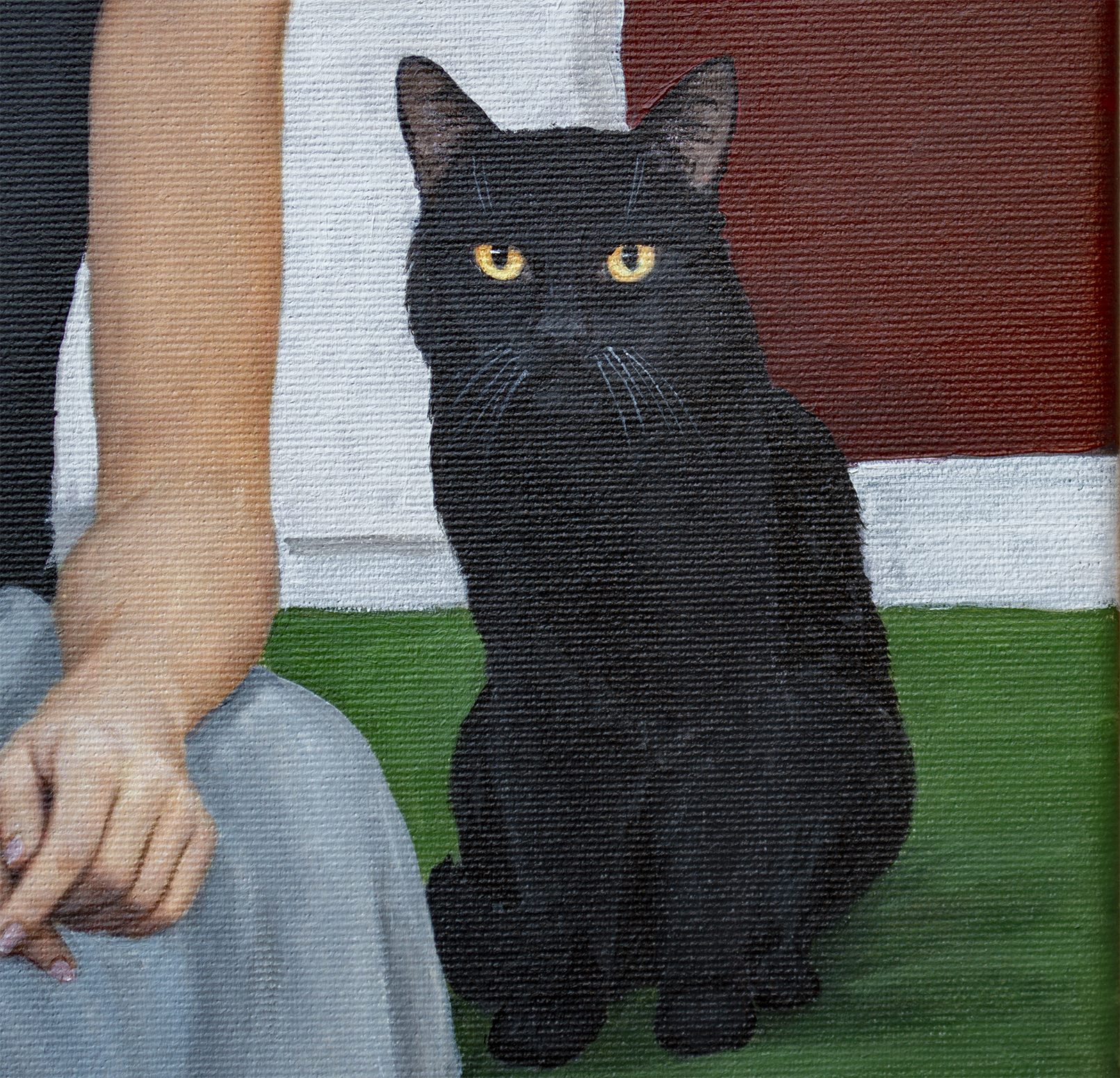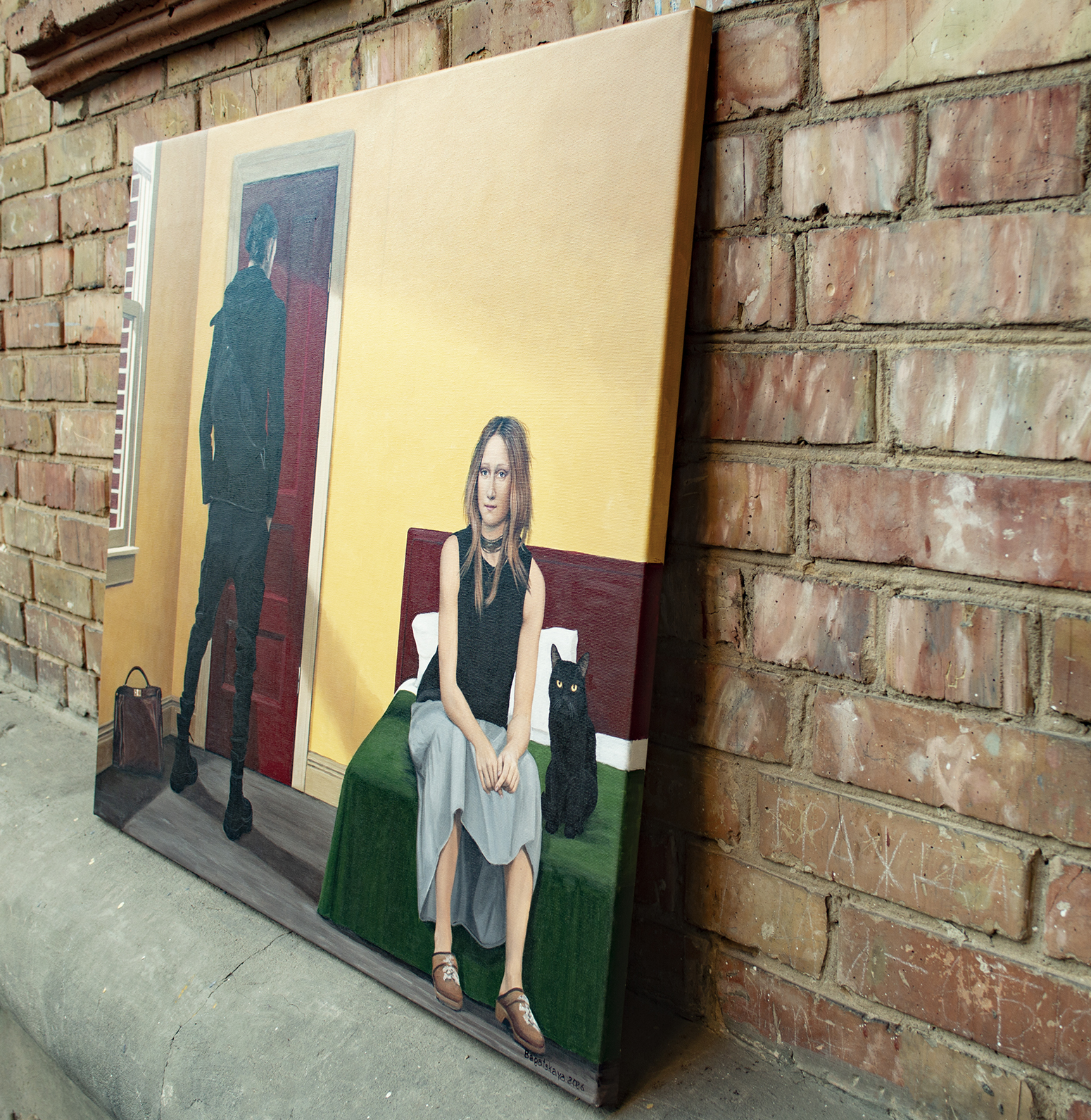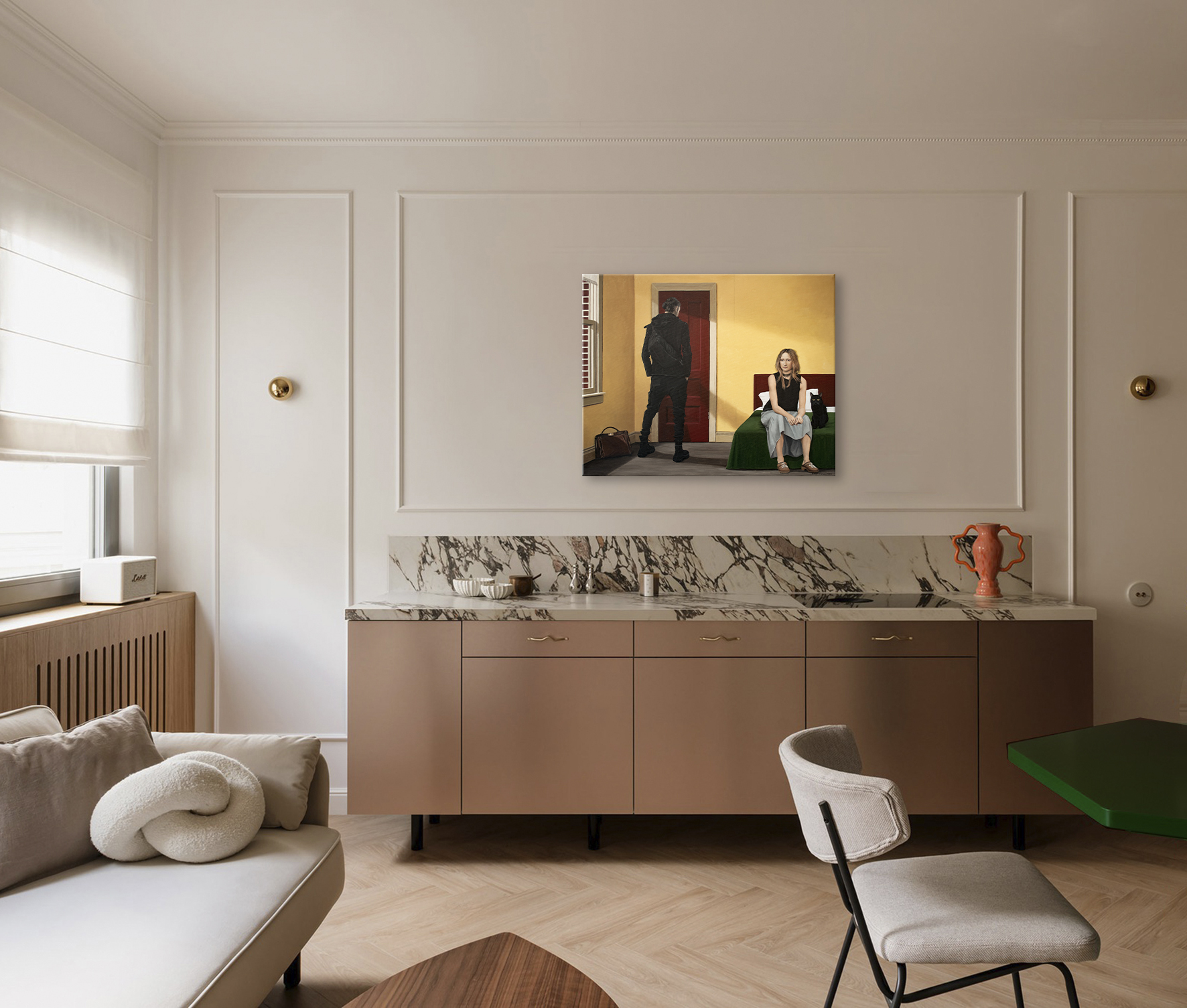 W centrum obrazu kobieta opiera się o stół z turkusowym obrusem, a obok niej siedzi czarny kot. Oboje mają srebrzyste kaptury i maski z czerwonymi akcentami, jak ostatnia linia obrony. Ich spojrzenia i obecność tworzą napięcie — subtelne, a jednocześnie przenikliwe. Tło stanowi ogromne okno podzielone na geometryczne prostokąty, dwa skrzydła uchylone, zza nich wisi ciężkie, dymne niebo. Paleta barw jest chłodna i przygaszona: grafity, stal, brudny beż, a czerwień przebija wszystko niczym alarm. Precyzyjne światło nadaje scenie kinowy charakter — realistyczny, a zarazem symboliczną głębię. Obraz emanuje niepokojem i ciszą, jakby był momentem wstrzymanego oddechu przed czymś większym. Kot wprowadza lekki element humoru i instynktowną mądrość, tworząc sojusz z ludzką obecnością. To dzieło opowiada o odporności, refleksji i codzienności w świecie pełnym niepewności. Łączy realizm narracyjny z symboliką i psychologiczną głębią, idealne dla kolekcjonerów, którzy szukają obrazów poruszających, a jednocześnie pozostawiających przestrzeń do własnej interpretacji. Do wykonania użyto holenderskich farb akrylowych Amsterdam™ oraz włoskiego płótna marki Unico. Wykończenie w satynowym lakierze, krawędzie pomalowane kolorem tła. Obraz powstał na płótnie naciągniętym na drewnianą ramę, jest podpisany i posiada certyfikat autentyczności.