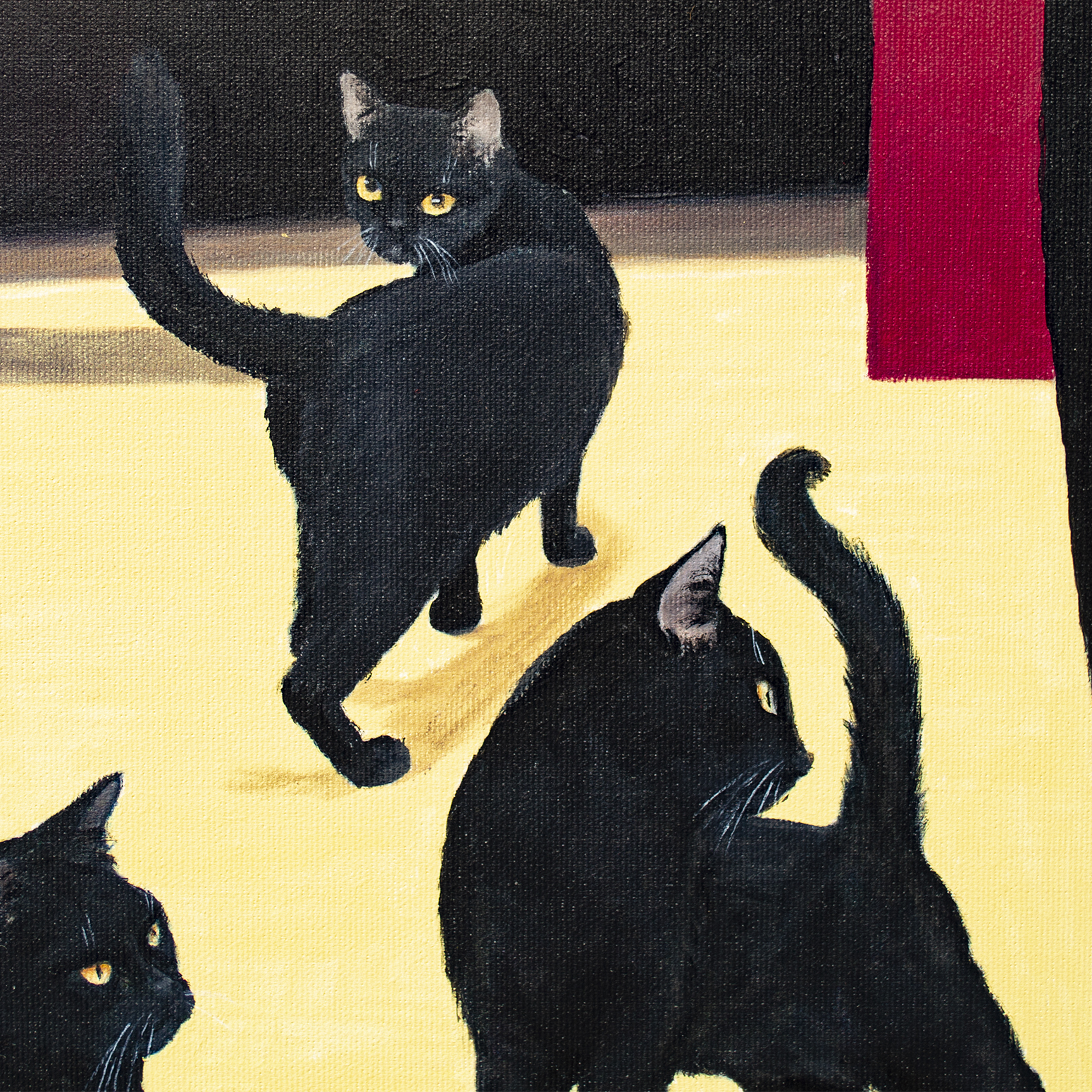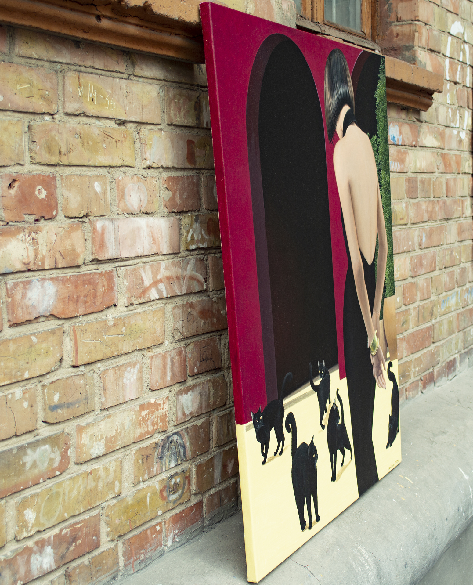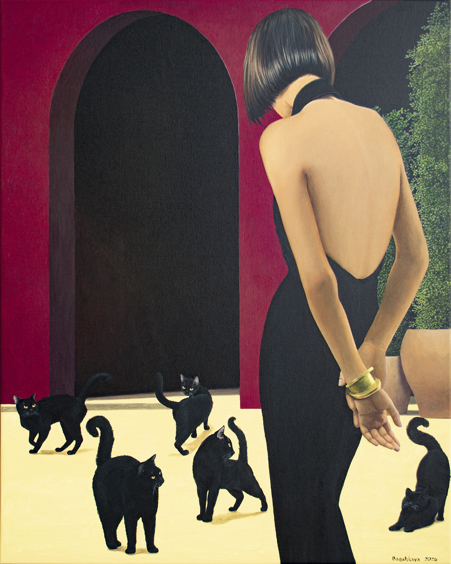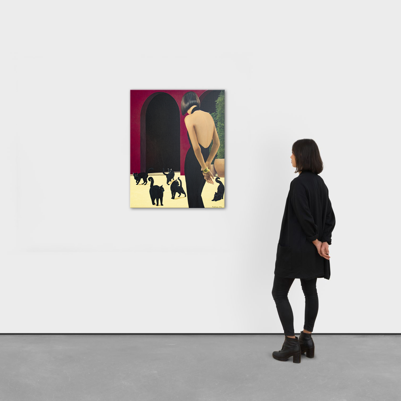 Na obrazie dominuje głęboka czerwień ścian, przetykana monumentalnymi czarnymi arkadami, które wyglądają jak wejścia w noc. Na jasnej, niemal kremowej posadzce poruszają się niezależnie czarne koty — ich futro matowe, oczy świecące żółtawo jak małe lampki. Z prawej strony stoi kobieta w obcisłej, rzeźbiarskiej czarnej sukni z odkrytymi plecami. Jej dłonie swobodnie skrzyżowane z tyłu tworzą gest jednocześnie opanowany i intrygujący. Złota bransoleta dodaje subtelnego blasku i podkreśla elegancję sceny. Kompozycja jest prosta, a jednocześnie napięta — jakby zaraz miało się coś wydarzyć. Kontrast między aksamitną czernią postaci i kotów a nasyconą czerwienią ścian tworzy magnetyczny efekt wizualny. Koty pełnią funkcję psychologicznych luster — uosabiają instynkt, intuicję i cichy osąd. Widz nie tylko obserwuje scenę, lecz staje się jej uczestnikiem, wchodząc w atmosferę ciszy pełnej napięcia i tajemnicy. Styl obrazu przypomina precyzyjny realizm z gładkimi przejściami światła i cienia. Nastrój jest cichy, elegancki, z lekką nutą niepokoju, pozostawiający przestrzeń do własnej interpretacji. Dzieło przemawia do kolekcjonerów ceniących realizm narracyjny wzbogacony symboliką, łączący wyrafinowanie z subtelną grą emocji, powściągliwość z intrygą. Obraz to wyrazisty punkt centralny każdego wnętrza — elegancki, subtelnie ironiczny, idealny dla kolekcjonera doceniającego wyrafinowanie, psychologiczną głębię i sugestywną opowieść. Do wykonania użyto holenderskich farb akrylowych Amsterdam™ oraz włoskiego płótna marki Unico. Wykończenie w satynowym lakierze, krawędzie pomalowane kolorem tła. Obraz powstał na płótnie naciągniętym na drewnianą ramę, starannie zapakowany w karton z folią bąbelkową, podpisany i opatrzony certyfikatem autentyczności.