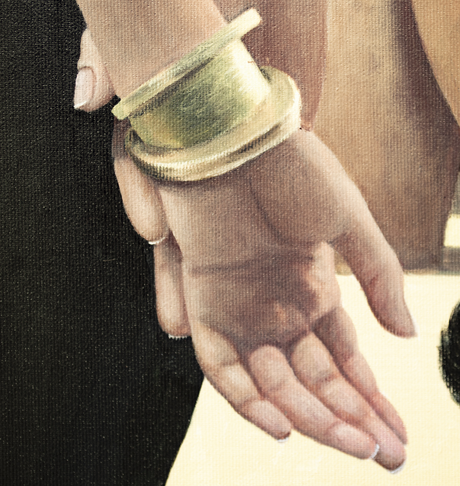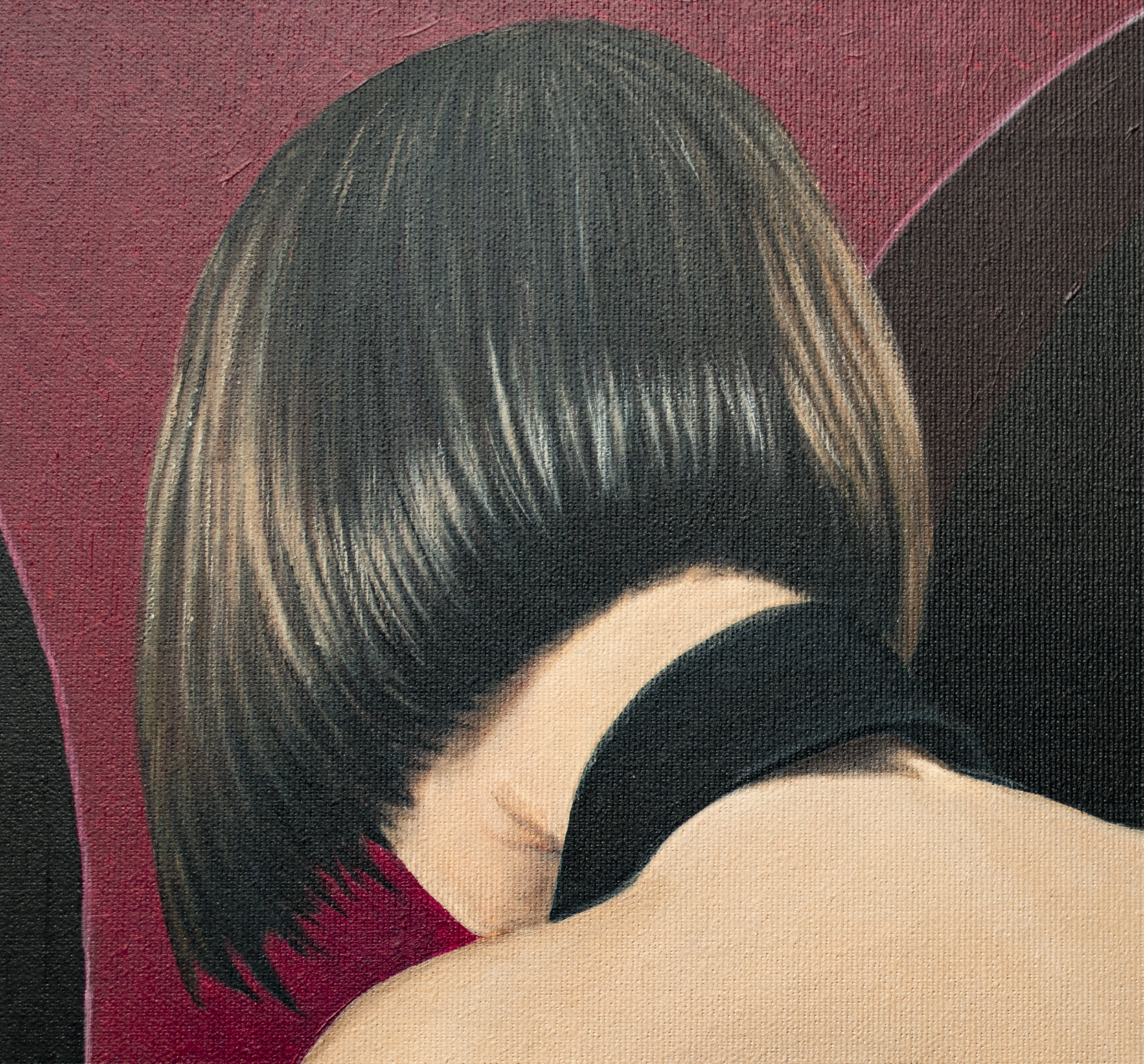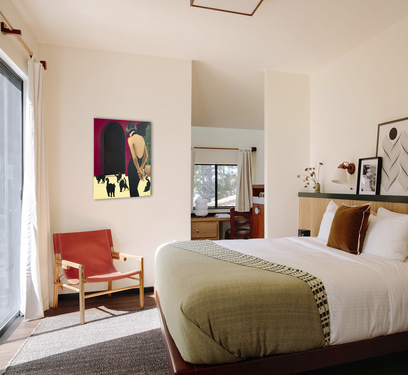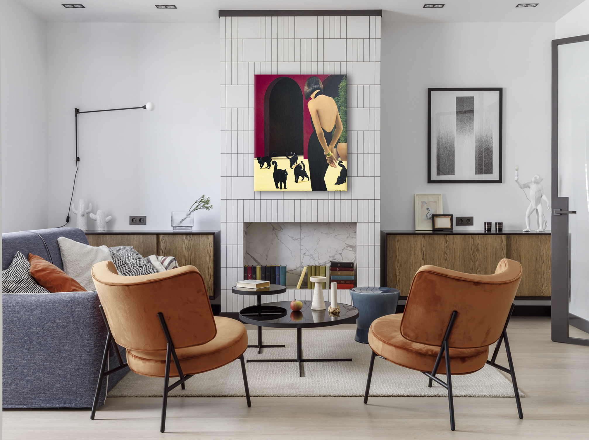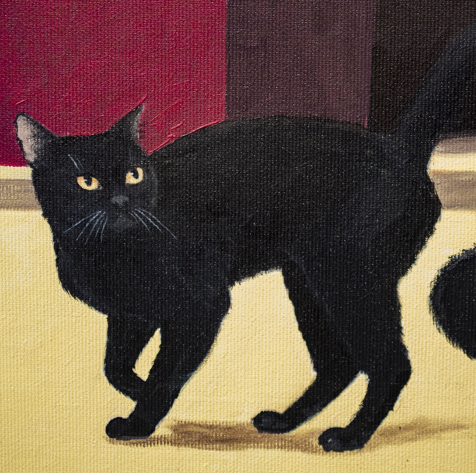 Na obrazie dominuje głęboka czerwień ścian, przetykana monumentalnymi czarnymi arkadami, które wyglądają jak wejścia w noc. Na jasnej, niemal kremowej posadzce poruszają się niezależnie czarne koty — ich futro matowe, oczy świecące żółtawo jak małe lampki. Z prawej strony stoi kobieta w obcisłej, rzeźbiarskiej czarnej sukni z odkrytymi plecami. Jej dłonie swobodnie skrzyżowane z tyłu tworzą gest jednocześnie opanowany i intrygujący. Złota bransoleta dodaje subtelnego blasku i podkreśla elegancję sceny. Kompozycja jest prosta, a jednocześnie napięta — jakby zaraz miało się coś wydarzyć. Kontrast między aksamitną czernią postaci i kotów a nasyconą czerwienią ścian tworzy magnetyczny efekt wizualny. Koty pełnią funkcję psychologicznych luster — uosabiają instynkt, intuicję i cichy osąd. Widz nie tylko obserwuje scenę, lecz staje się jej uczestnikiem, wchodząc w atmosferę ciszy pełnej napięcia i tajemnicy. Styl obrazu przypomina precyzyjny realizm z gładkimi przejściami światła i cienia. Nastrój jest cichy, elegancki, z lekką nutą niepokoju, pozostawiający przestrzeń do własnej interpretacji. Dzieło przemawia do kolekcjonerów ceniących realizm narracyjny wzbogacony symboliką, łączący wyrafinowanie z subtelną grą emocji, powściągliwość z intrygą. Obraz to wyrazisty punkt centralny każdego wnętrza — elegancki, subtelnie ironiczny, idealny dla kolekcjonera doceniającego wyrafinowanie, psychologiczną głębię i sugestywną opowieść. Do wykonania użyto holenderskich farb akrylowych Amsterdam™ oraz włoskiego płótna marki Unico. Wykończenie w satynowym lakierze, krawędzie pomalowane kolorem tła. Obraz powstał na płótnie naciągniętym na drewnianą ramę, starannie zapakowany w karton z folią bąbelkową, podpisany i opatrzony certyfikatem autentyczności.