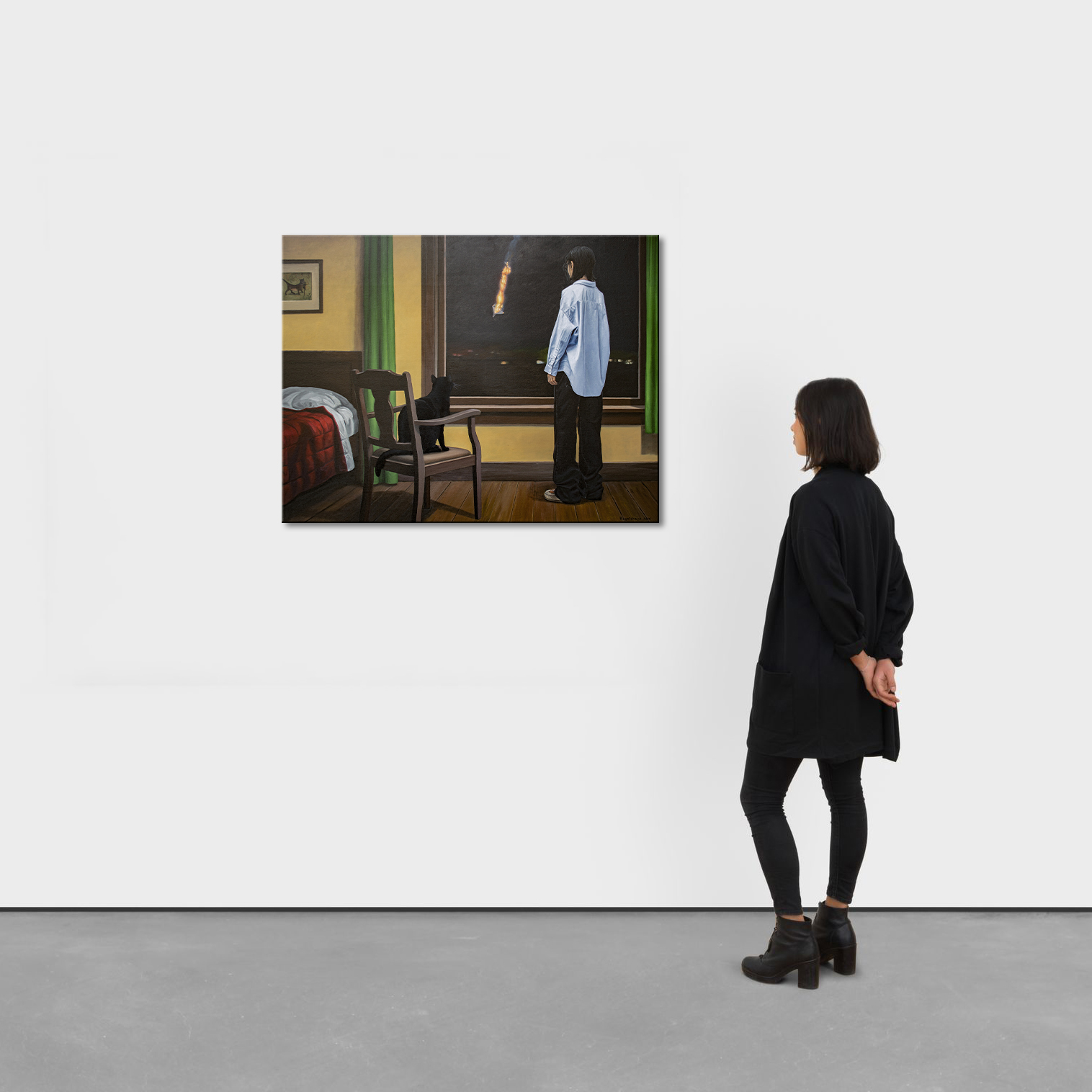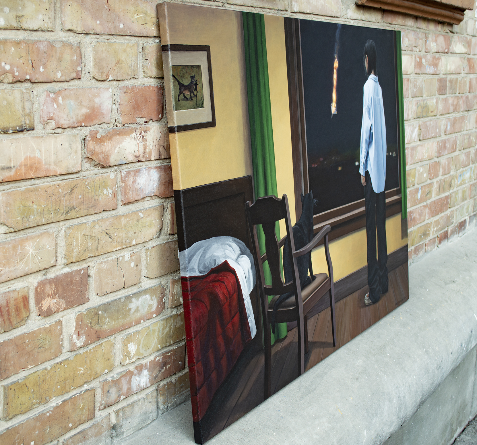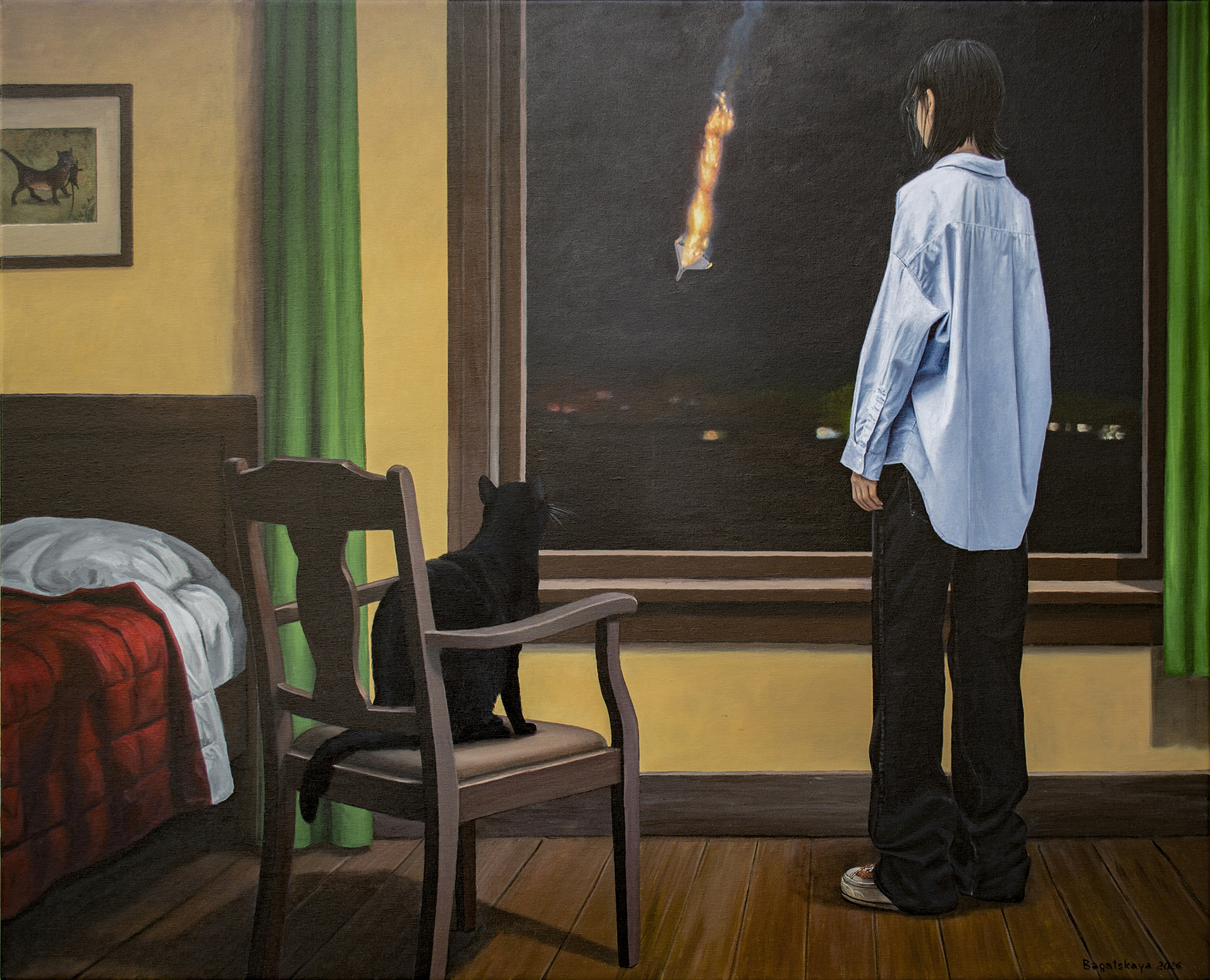 Obraz ukazuje spokojne wnętrze przerwane przez odległą rzeczywistość wojny. Młoda kobieta stoi przy oknie i obserwuje płonący obiekt spadający przez nocne niebo. Nie jest to meteor, lecz płonące szczątki zestrzelonego drona Shahed używanego w rosyjskich atakach na ukraińskie miasta. Wewnątrz pokoju wszystko pozostaje spokojne: ciepłe żółte ściany, zielone zasłony, drewniana podłoga oraz czarny kot siedzący na krześle obok okna. Spokojna, domowa atmosfera kontrastuje z dramatycznym wydarzeniem na zewnątrz, tworząc silne napięcie psychologiczne między bezpieczeństwem a zagrożeniem, bliskością a niepewnością. Widz staje się cichym świadkiem tej chwili, dzieląc tę samą ciszę i uważność co postacie przedstawione na obrazie. Praca odzwierciedla współczesną rzeczywistość, w której codzienne życie toczy się dalej, nawet gdy na nocnym niebie pojawiają się odległe ślady wojny. Filmowa kompozycja i spokojna narracja zachęcają widza do zatrzymania się i refleksji. Czarny kot wprowadza subtelną symbolikę — instynkt, cichą czujność i intuicyjne wyczuwanie zmian. Im dłużej patrzy się na obraz, tym bardziej scena się otwiera, ujawniając warstwy napięcia, wrażliwości i odporności. Kolekcjonerzy często poszukują dzieł sztuki, które niosą historię i z czasem odsłaniają nowe znaczenia. Ten obraz oferuje właśnie to: wizualnie spokojną scenę nasyconą emocjonalną głębią i historycznym kontekstem. Szczególnie zainteresuje kolekcjonerów współczesnego realizmu narracyjnego oraz psychologicznie ekspresyjnego malarstwa figuratywnego. Dzieło wprowadza do wnętrza atmosferę kontemplacji, przekształcając przestrzeń w miejsce, gdzie spotykają się pamięć, wyobraźnia i cicha refleksja. Do wykonania użyto holenderskich farb akrylowych Amsterdam™ oraz włoskiego płótna Unico. Powierzchnia została zabezpieczona satynowym werniksem, a krawędzie są zamalowane kolorem tła. Obraz powstał na naciągniętym płótnie na drewnianym blejtramie i zostanie starannie zapakowany w kartonowe pudełko z warstwami ochronnymi. Signed front and back, certified by the artist, with painted edges and secure packaging.