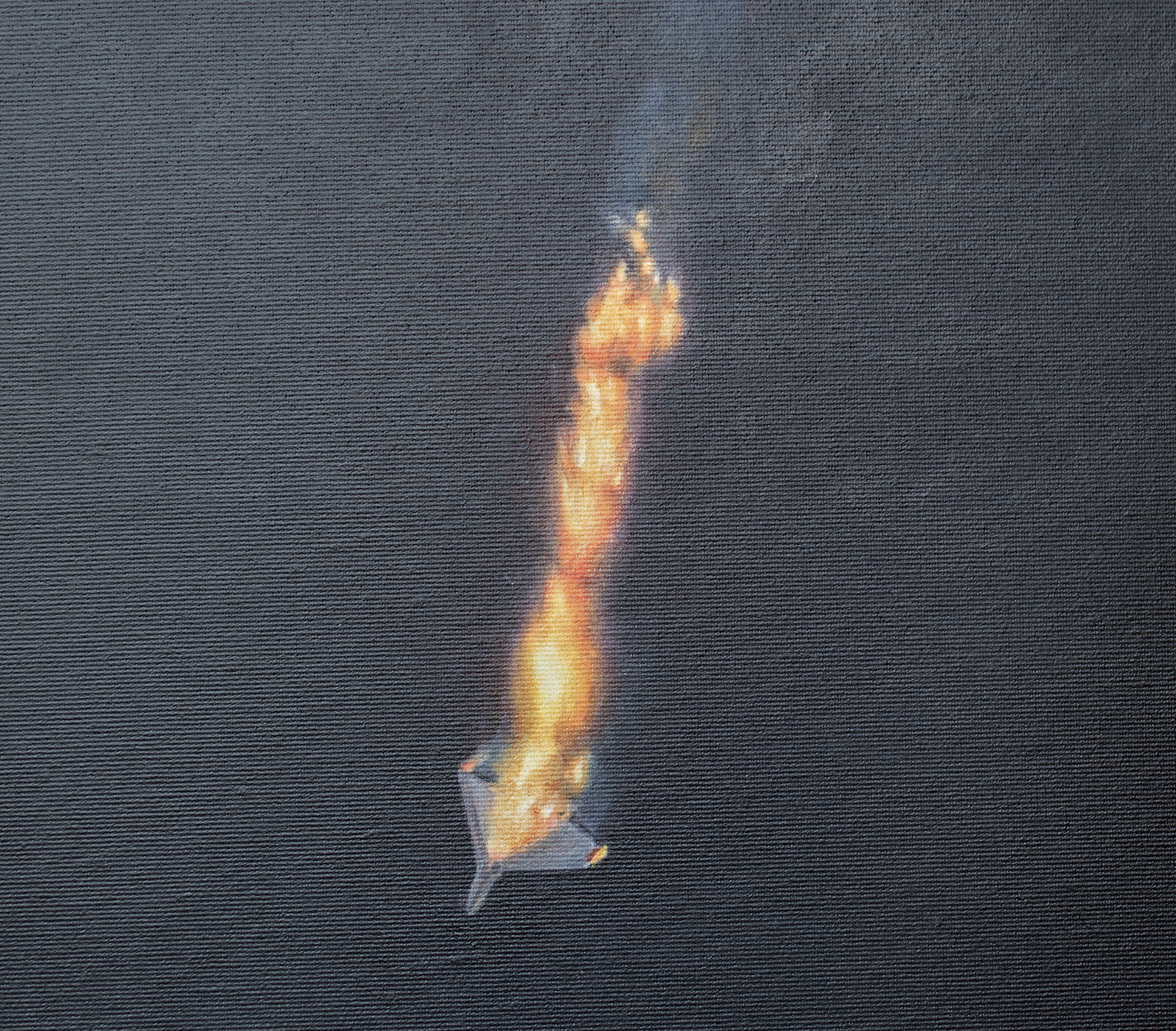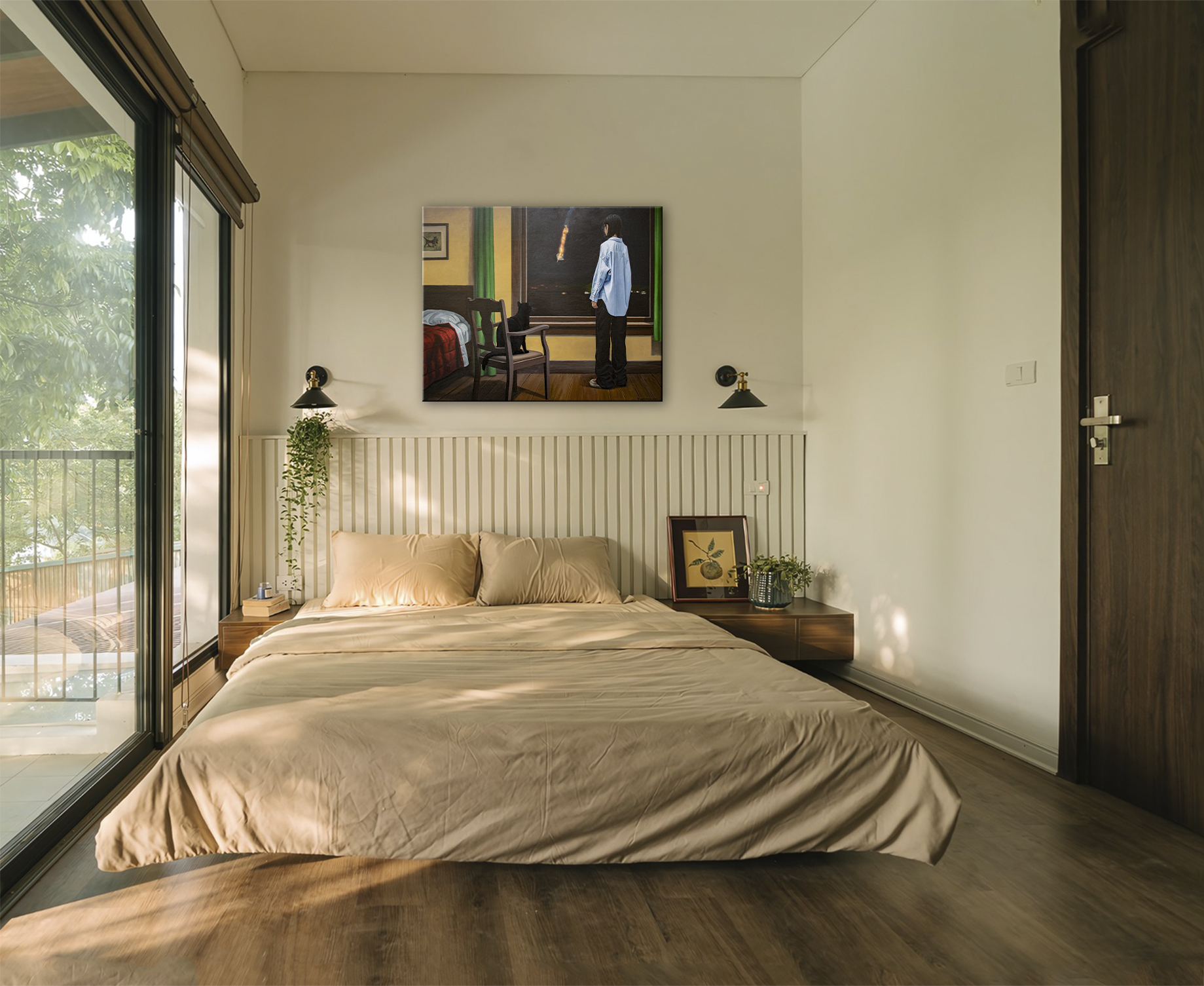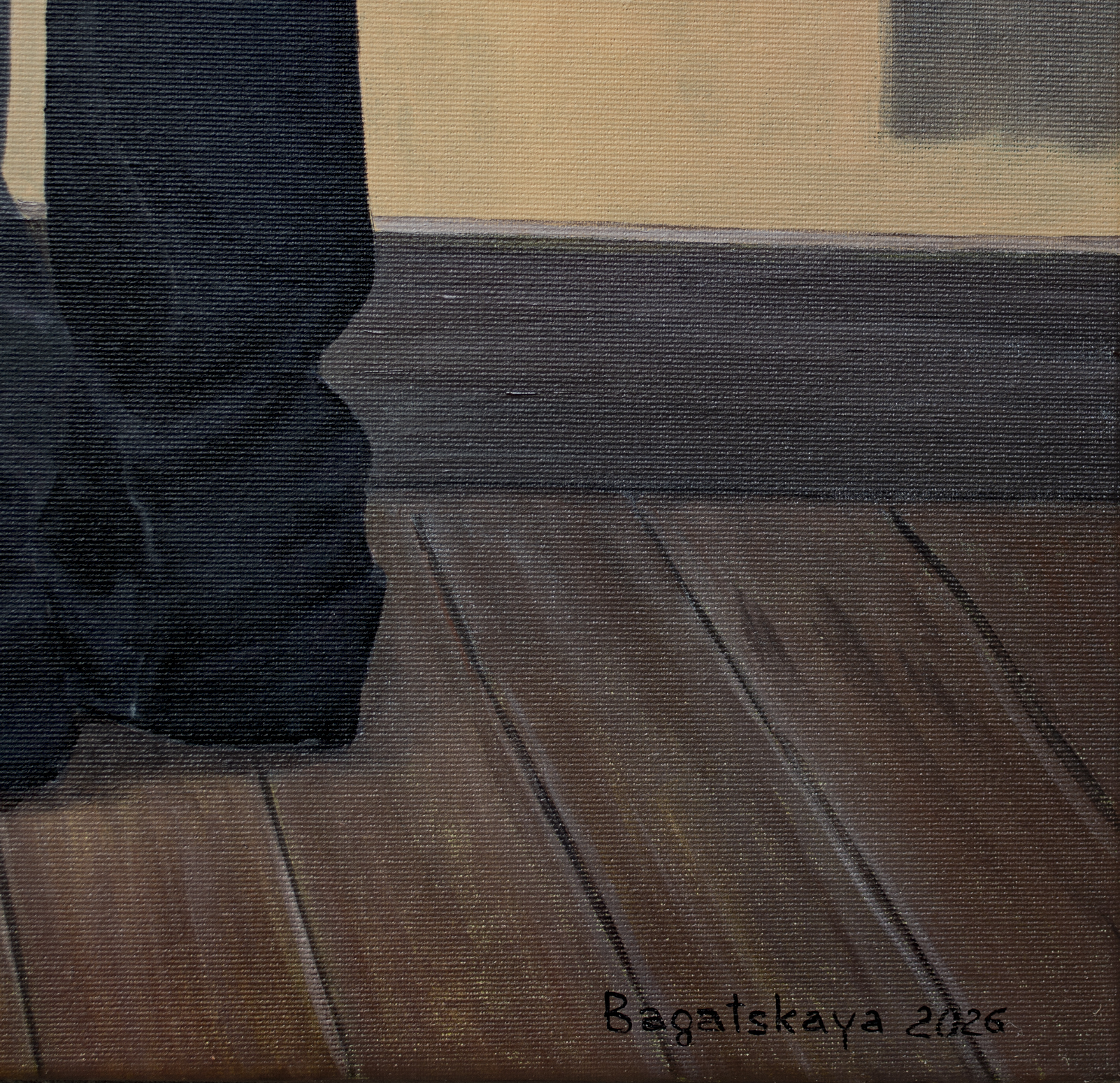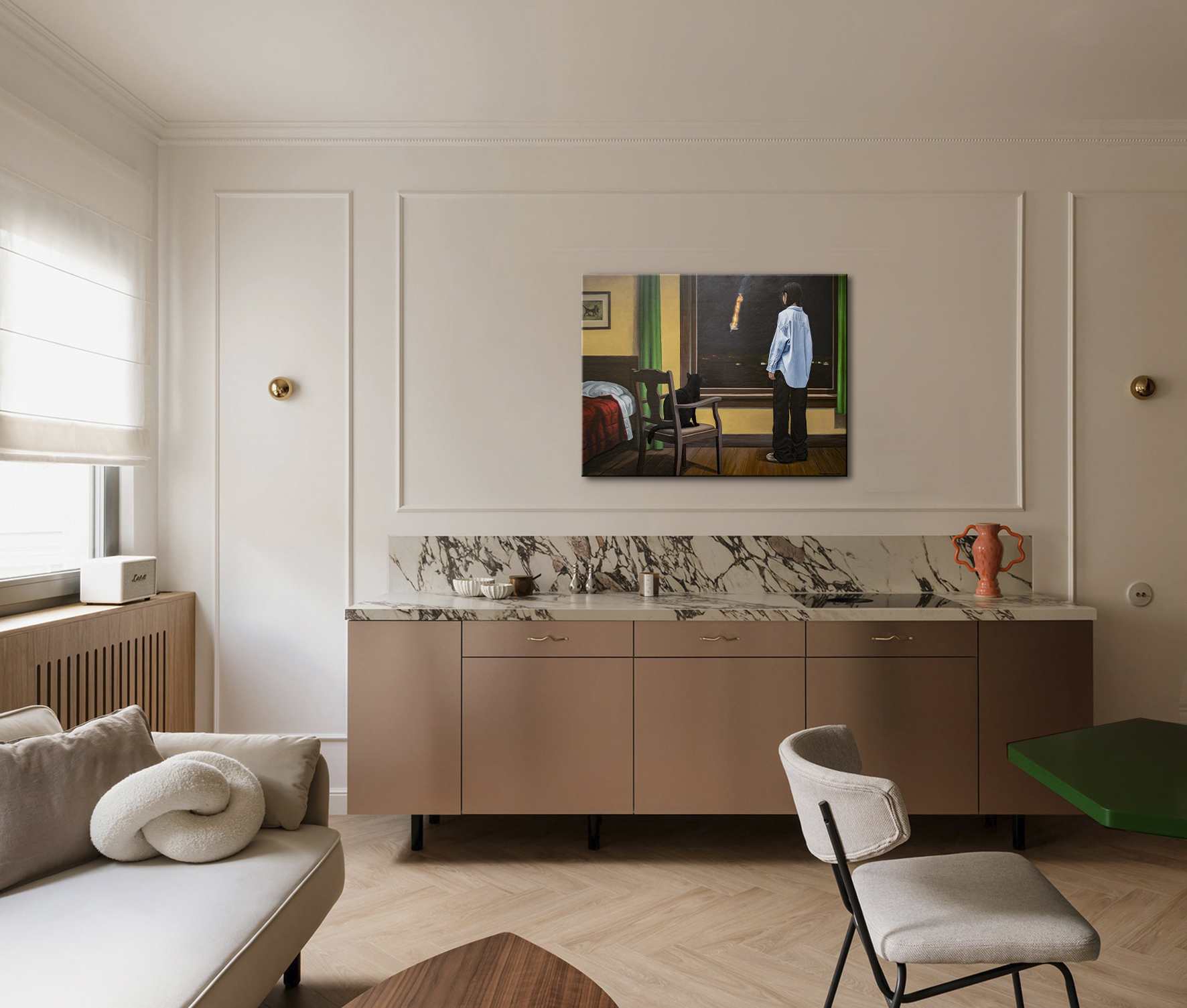 Obraz ukazuje spokojne wnętrze przerwane przez odległą rzeczywistość wojny. Młoda kobieta stoi przy oknie i obserwuje płonący obiekt spadający przez nocne niebo. Nie jest to meteor, lecz płonące szczątki zestrzelonego drona Shahed używanego w rosyjskich atakach na ukraińskie miasta. Wewnątrz pokoju wszystko pozostaje spokojne: ciepłe żółte ściany, zielone zasłony, drewniana podłoga oraz czarny kot siedzący na krześle obok okna. Spokojna, domowa atmosfera kontrastuje z dramatycznym wydarzeniem na zewnątrz, tworząc silne napięcie psychologiczne między bezpieczeństwem a zagrożeniem, bliskością a niepewnością. Widz staje się cichym świadkiem tej chwili, dzieląc tę samą ciszę i uważność co postacie przedstawione na obrazie. Praca odzwierciedla współczesną rzeczywistość, w której codzienne życie toczy się dalej, nawet gdy na nocnym niebie pojawiają się odległe ślady wojny. Filmowa kompozycja i spokojna narracja zachęcają widza do zatrzymania się i refleksji. Czarny kot wprowadza subtelną symbolikę — instynkt, cichą czujność i intuicyjne wyczuwanie zmian. Im dłużej patrzy się na obraz, tym bardziej scena się otwiera, ujawniając warstwy napięcia, wrażliwości i odporności. Kolekcjonerzy często poszukują dzieł sztuki, które niosą historię i z czasem odsłaniają nowe znaczenia. Ten obraz oferuje właśnie to: wizualnie spokojną scenę nasyconą emocjonalną głębią i historycznym kontekstem. Szczególnie zainteresuje kolekcjonerów współczesnego realizmu narracyjnego oraz psychologicznie ekspresyjnego malarstwa figuratywnego. Dzieło wprowadza do wnętrza atmosferę kontemplacji, przekształcając przestrzeń w miejsce, gdzie spotykają się pamięć, wyobraźnia i cicha refleksja. Do wykonania użyto holenderskich farb akrylowych Amsterdam™ oraz włoskiego płótna Unico. Powierzchnia została zabezpieczona satynowym werniksem, a krawędzie są zamalowane kolorem tła. Obraz powstał na naciągniętym płótnie na drewnianym blejtramie i zostanie starannie zapakowany w kartonowe pudełko z warstwami ochronnymi. Signed front and back, certified by the artist, with painted edges and secure packaging.