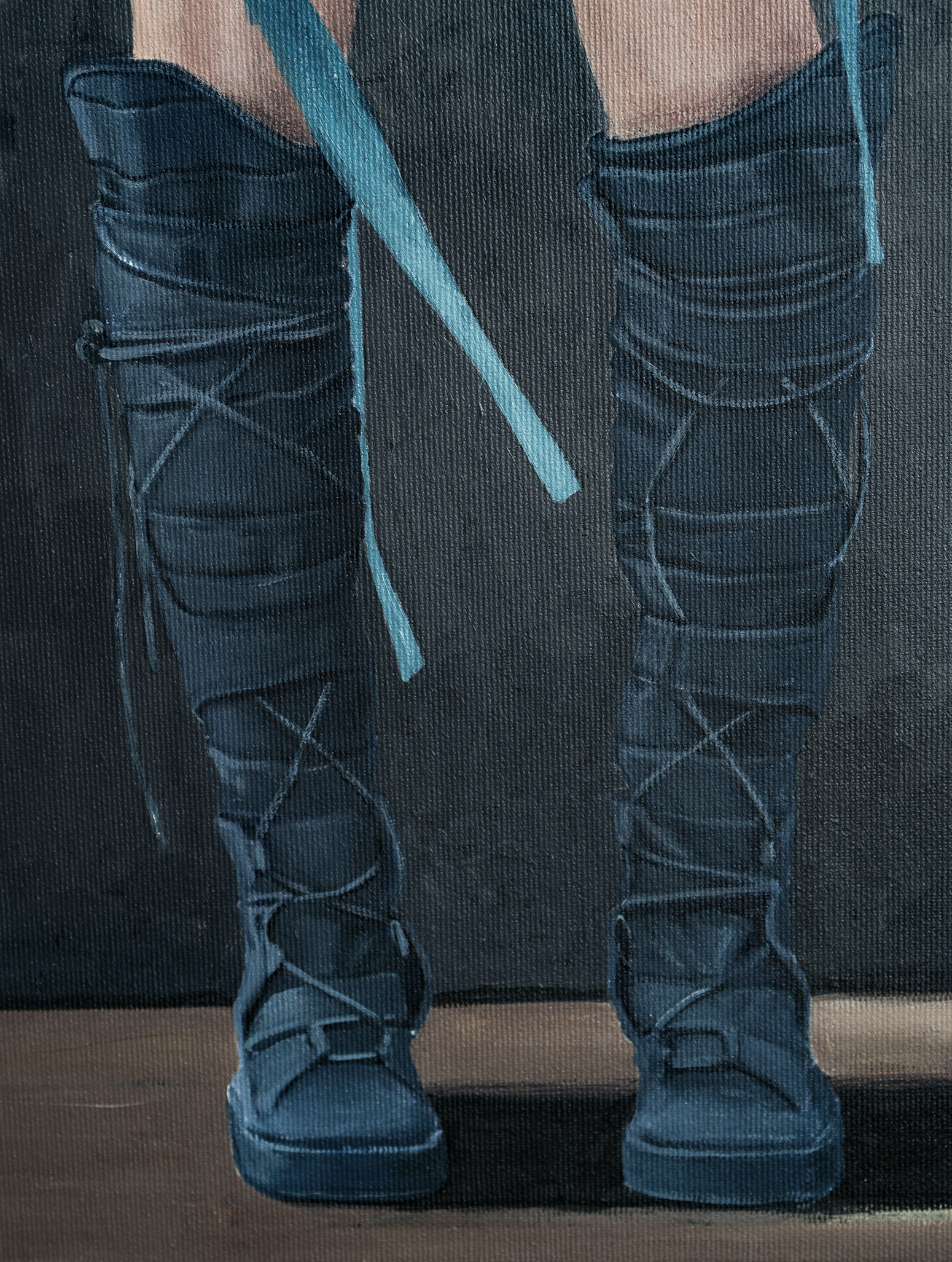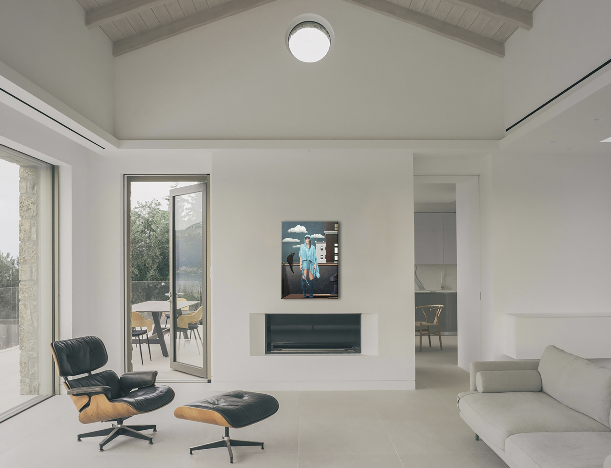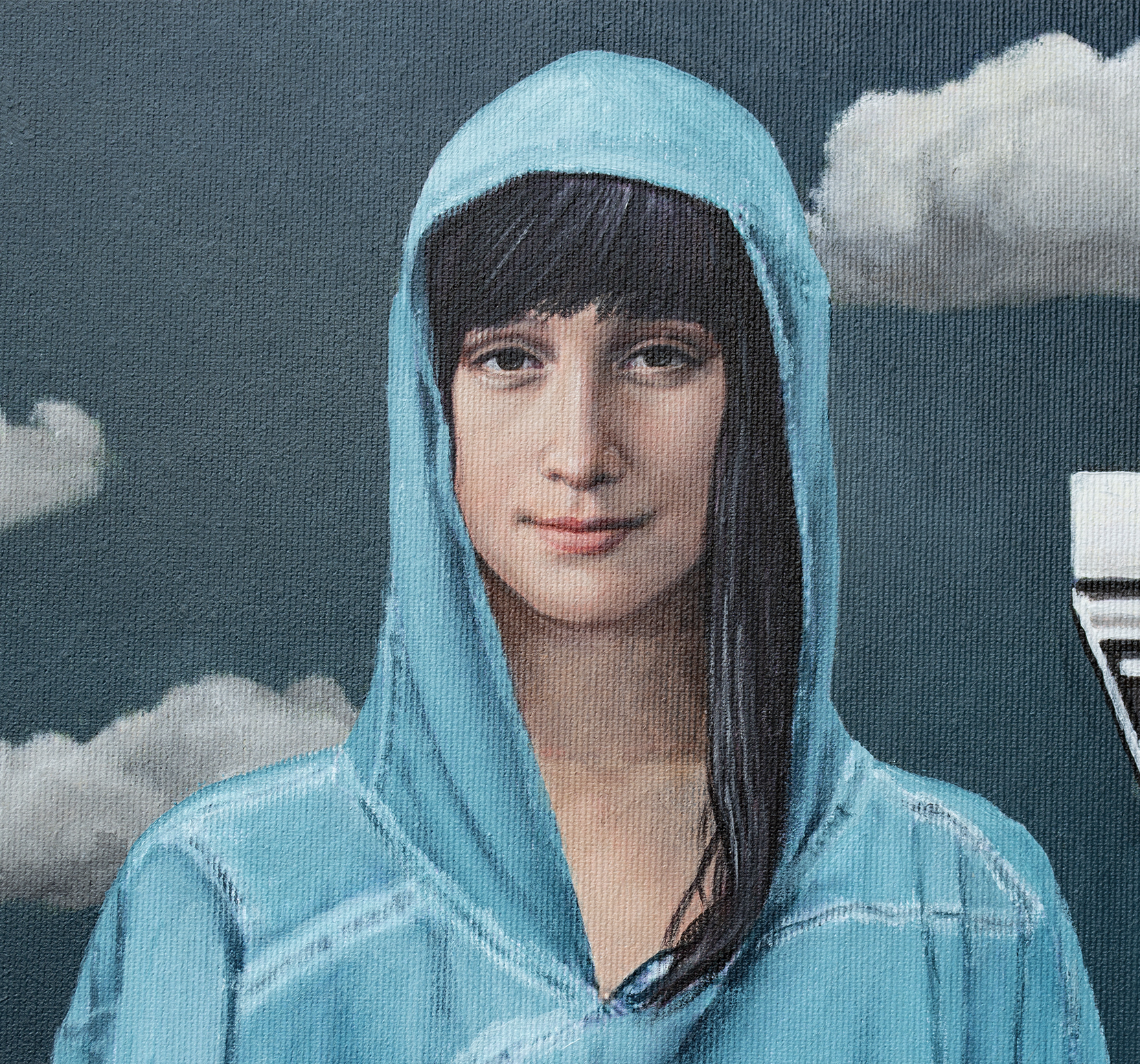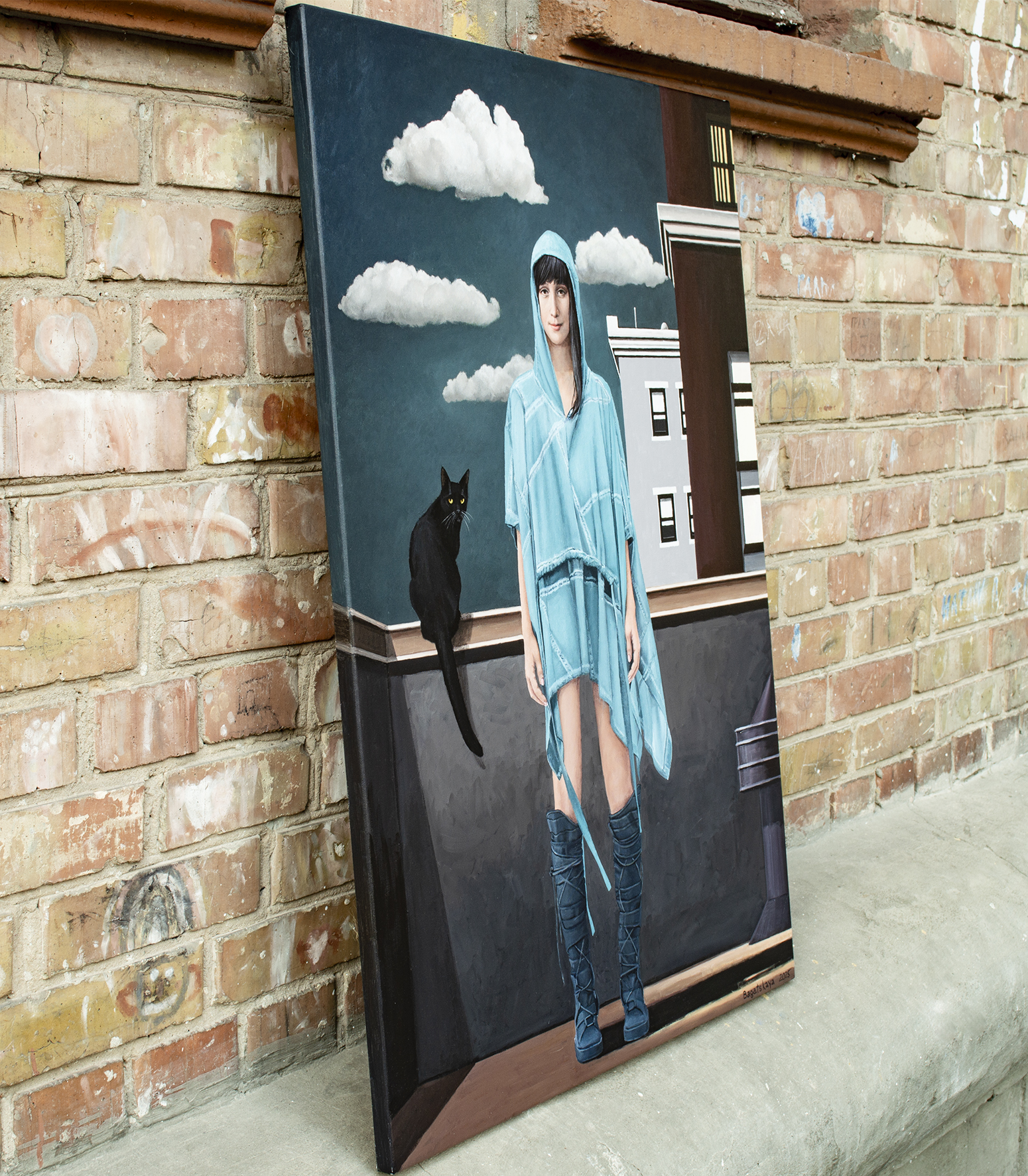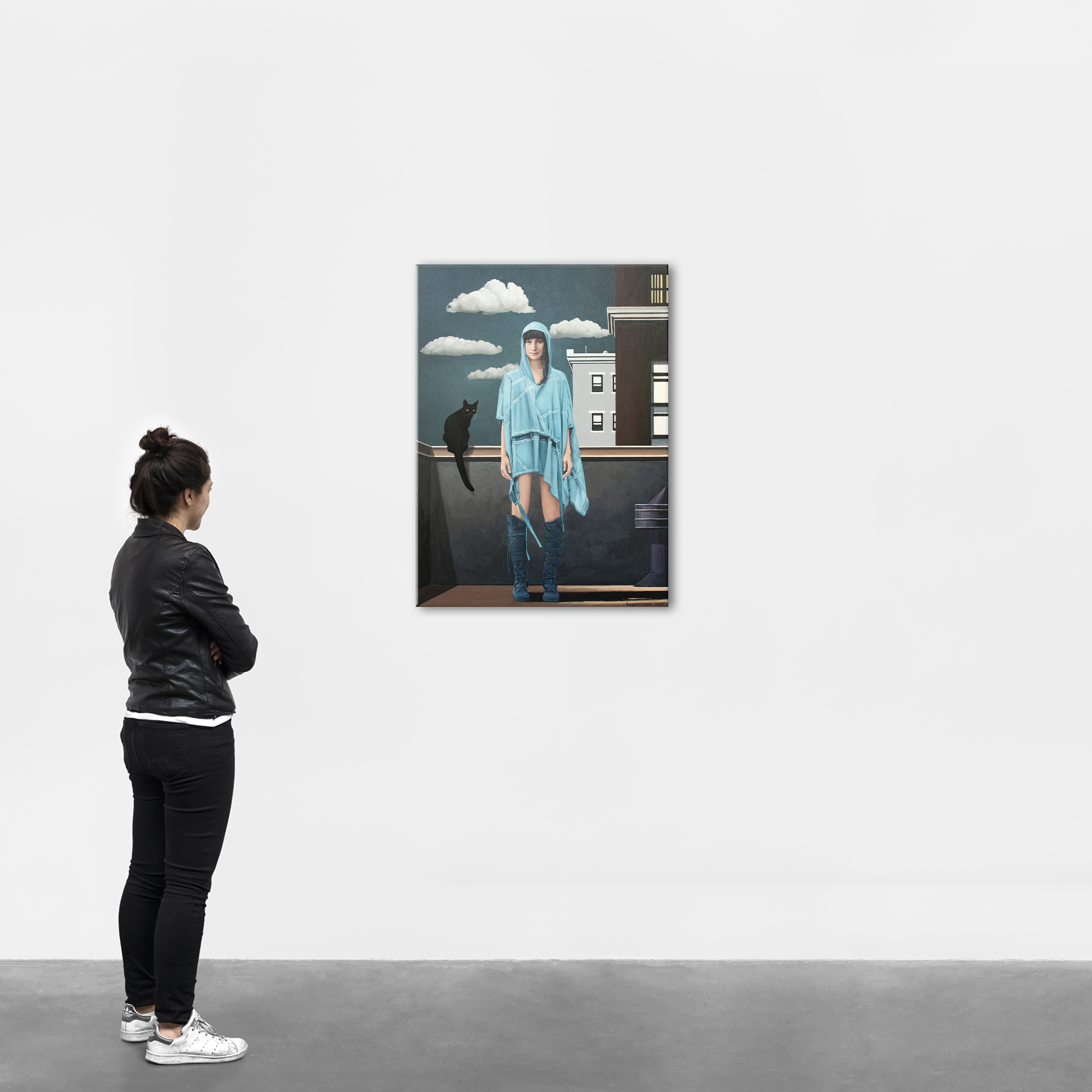 Ta intrygująca praca przedstawia kobietę ubraną w obszerny, zwiewny, jasnoniebieski strój, który urzekająco kontrastuje z jej sięgającymi do kolan, pasującymi niebieskimi butami. Jej spokojne zachowanie wyróżnia się na tle surrealistycznego otoczenia dachu, na którym stoi wyprostowana. Obok niej, czarny kot pewnie przycupnął na krawędzi, dodając scenie tajemniczej aury. Pokryte chmurami niebo i stylizowane miejskie budynki w tle zapewniają kapryśne, ale surowe tło, podkreślając zestawienie przyziemności z fantastyką. Skrupulatna dbałość artysty o szczegóły faktury i koloru tworzy harmonijną równowagę między nowoczesnością a surrealizmem, zapraszając widzów do eksploracji głębi charakteru i kontekstu. Spokojna, ale enigmatyczna atmosfera kompozycji kwestionuje konwencjonalne perspektywy, czyniąc ją wyraźnie niezapomnianym dziełem.