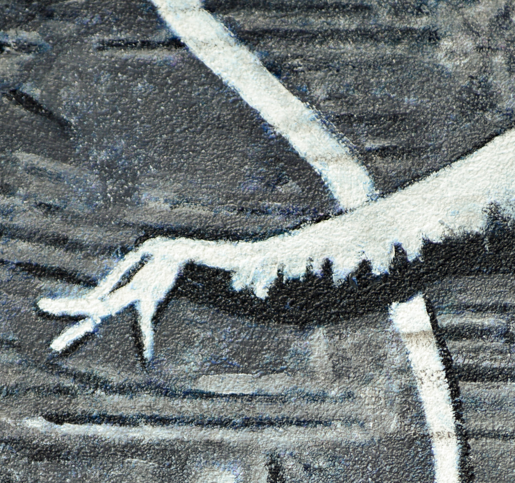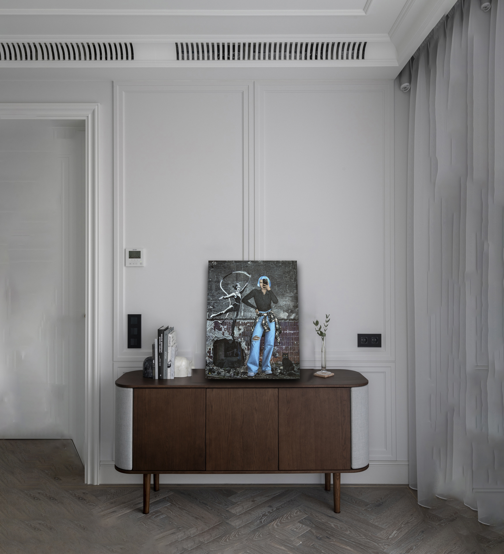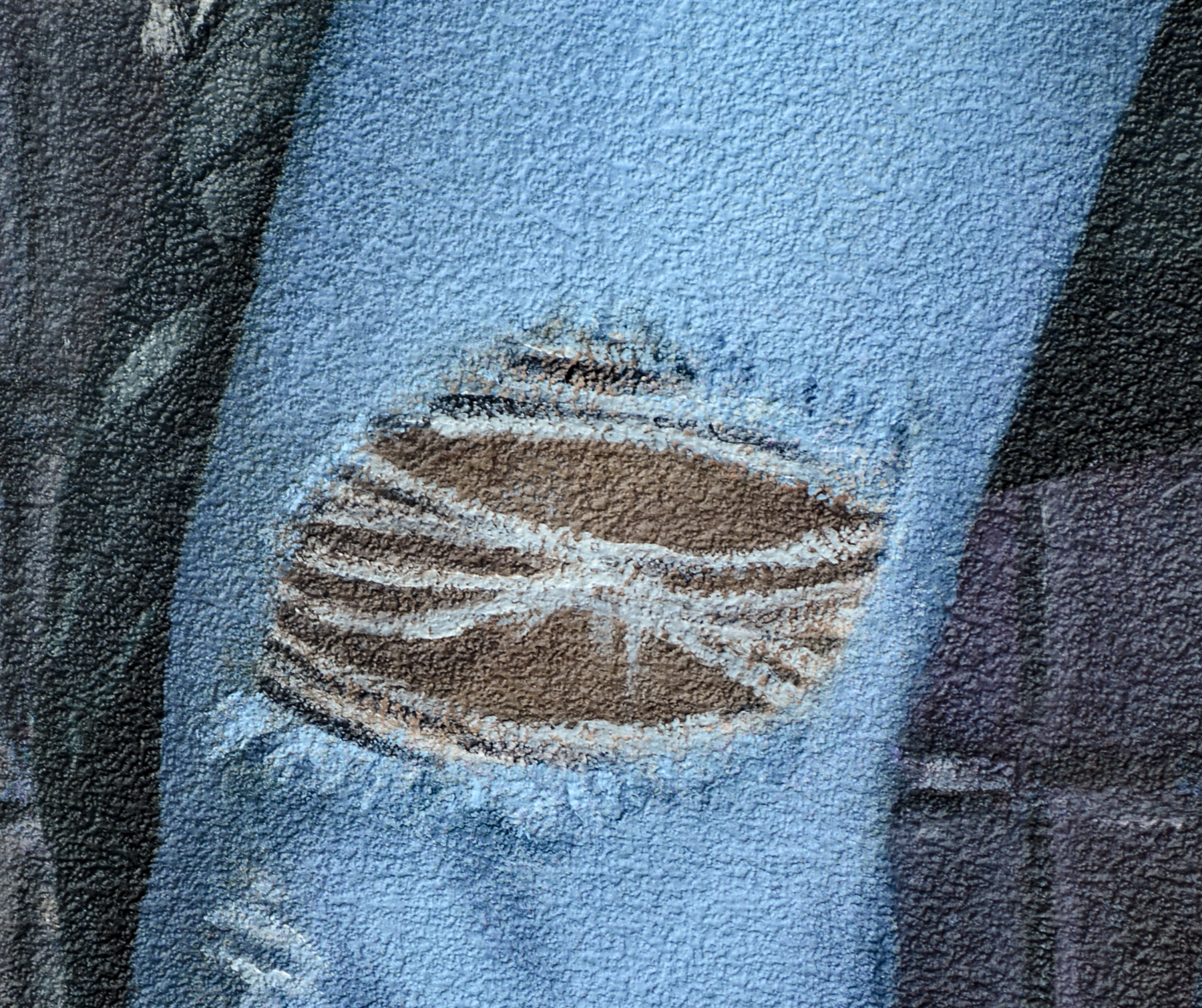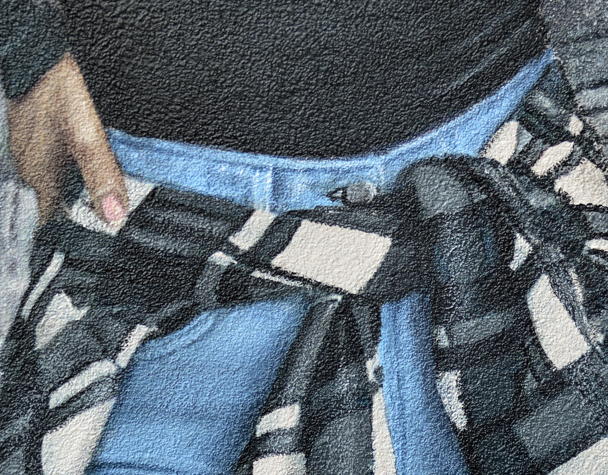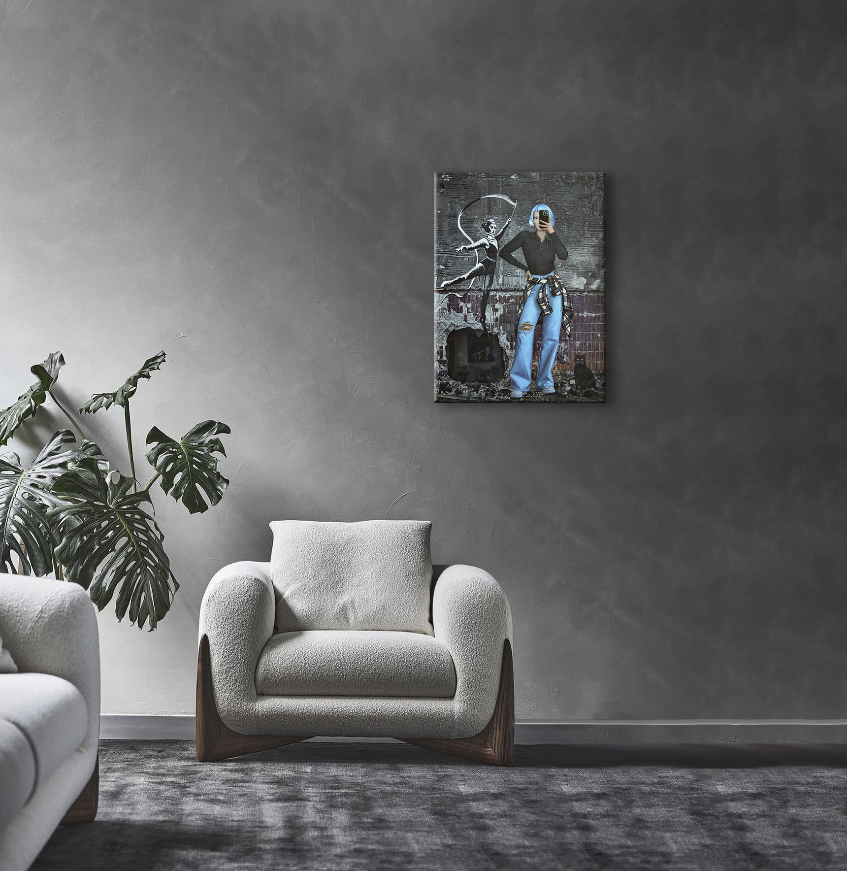 Obraz emanuje tajemniczą atmosferą, łącząc nowoczesność ze sztuką uliczną. Na pierwszy plan wysuwa się postać z błękitnymi włosami, trzymająca smartfona. Ubrana w ciemny golf, podkreśla kontrast pomiędzy tłem a sobą. W tle graffiti przedstawiające baletnicę dodaje dynamiki i ruchu. Kolory szaro-czarne dominują, ale błękity włosów i dżinsów czynią wszystko bardziej żywym. Ruiny na dole obrazu tworzą nieco nostalgiczną, może trochę postapokaliptyczną scenerię. Obraz wykorzystuje technikę mieszania realistycznego malarstwa z elementami street artu. Styl jest nieco surowy, co dodaje mu pewnego "edge". Kot siedzący przy nogach postaci wzmacnia tajemniczy nastrój. Dzieło wywołuje emocje zbliżone do melancholii z nutą buntu. Można się zastanawiać, co myśli bohaterka tej sceny. Może fantazjuje o innej rzeczywistości, maybe dreaming? Całość jest intrygującą grą pomiędzy światami przełamywanymi przez codzienność i pasję. Czy można poczuć się tak samo? Pewnie tak, bo obraz daje możliwość własnej interpretacji. Ktoś mógłby powiedzieć: a ta pani ma niebieskie włosy!