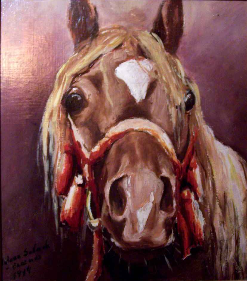 Na obrazie widzimy konia, który zajmuje centralne miejsce kompozycji. Kolory są nasycone, z przewagą brązów i ciepłych tonów, tworzących harmonijny miks z delikatnym fioletowym tłem. Koń ma jasną grzywę, a jego duże, ciemne oczy wydają się niemalże żywe, patrząc prosto na widza. Czerwony kantar przyciąga uwagę swoją intensywnością, dodając obrazowi energii. Artysta zastosował technikę impasto, a grube pociągnięcia pędzla nadają fakturze wyrazistości, co można niemalże poczuć pod palcami. Atmosfera dzieła to mieszanka spokoju i dystansu z nutą magii; koń wydaje się zarówno przyjacielski, jak i pełen charakterystycznej dumy. Styl jest realistyczny, a jednocześnie ma w sobie elementy impresjonistyczne w sposobie, w jaki światło i cień grają na jego sylwetce. Obraz przywołuje wspomnienia z dzieciństwa, gdy marzylo się o własnym koniku, może trochę kręcącym nosem. Dla mnie to "awesome", bo koń zdaje się chwile oddechu potrzebować, może zaraz ruszy galopem. Oczy konia wzbudzają refleksję nad jego myśleniem, emocjami. Jest taka prostota w tym portrecie, która daje do myślenia: co on widział i co widzi w nas. Malarski bałagan pociągnięć pędzla nadaje obrazowi dynamizmu, jak żywe muzeum zatrzymanej chwili. Co to za historia, którą chciał nam opowiedzieć jego twórca? Snując te refleksje, czuję, że każde spojrzenie na obraz przynosi coś nowego, podobnie jak w rozmowie z kimś bardzo bliskim, której nigdy się nie kończy.