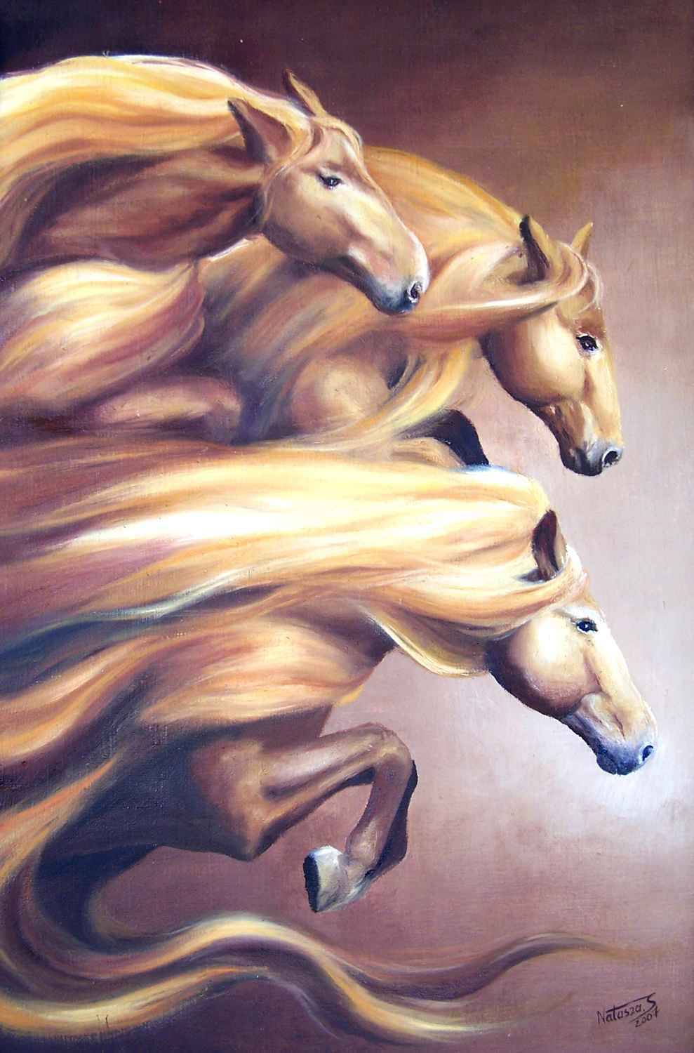 Obraz przedstawia dynamiczne trio koni, których grzywy płyną niczym złote wstęgi na wietrze. Dominują tutaj ciepłe odcienie brązu i złota, które nadają całości niepowtarzalny, energetyczny klimat. Tło jest stonowane, co podkreśla żywiołowość zwierząt i ich niemalże magiczny galop. Atmosfera obrazu emanuje ruchem i wolnością, a konie zdają się wyłaniać z płótna, prawie jakby za chwilę miały przeskoczyć w naszą rzeczywistość. Styl artystyczny opiera się na swobodnych pociągnięciach pędzla, tworzących uczucie płynności i lekkości. Artysta zastosował technikę chiaroscuro, co uwydatnia kontrasty między jasnością grzyw i cieniami ciał, nadając głębię i dynamikę kompozycji. Obraz wywołuje u odbiorcy przeróżne emocje: od poczucia wolności po zdumienie nad majestatycznym pięknem natury. Przypomina o niezależności i sile, jaką symbolizują konie. To także symbol human spirit - nieposkromionej duszy, która dąży do pełni życia mimo przeciwności. Mój brat mówi, że te koniki biegną naprawdę szybko, aż widać wiatr. Osobiście, mogę tylko podziwiać ten wybuch energii i jak wszystko łączy się w harmonijną całość.
