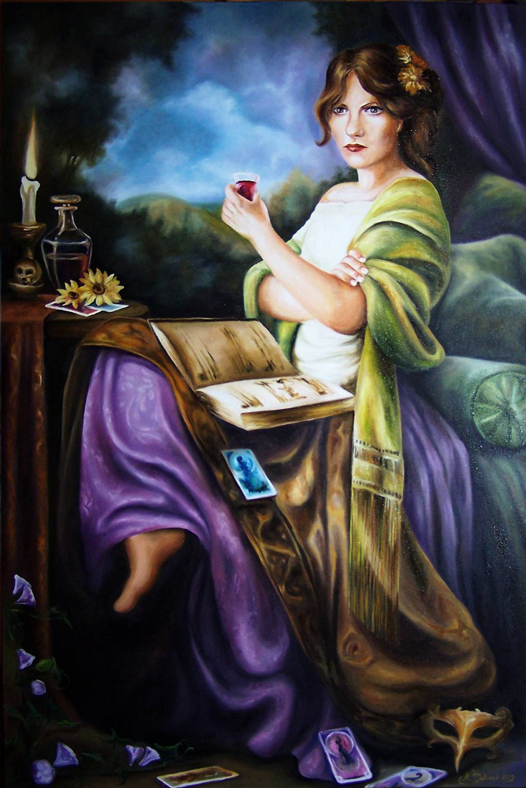 Na obrazie widzimy kobietę zamyśloną, siedzącą w przytulnym kącie pokoju, otoczoną tajemniczymi przedmiotami. Paleta kolorystyczna obejmuje delikatne fiolety, zielenie i złoto, które harmonijnie łączą się, tworząc atmosferę magii i spokoju. Artysta z wielką precyzją kreśli detale - falujące materiały, połyskujące szkło. Kompozycja jest klasyczna, ale z nutką tajemnicy. Nastrój obrazu emanuje cichością i refleksją. Oczy kobiety, główna oś dzieła, zdradzają myśli zapisane w księdze u jej boku. Jest w tym coś jakby z baśni, jak z zamyślnego popołudnia. 7-latek powiedziałby: „Ona wygląda, jakby wiedziała wielki sekret!” Pastelowe barwy nadają dziełu dreamlike quality, subtelnie przemawiając do wyobraźni. Styl jest delikatny, z wpływami realizmu. Artysta użył światłocienia, by wydobyć detale, tworząc głębię. Światło świecy zdaje się pulsować ciepłem i wprowadzać lekki dramatyzm. Pociągnięcia pędzlem mają miękkość, co w połączeniu z wybranymi barwami daje wrażenie intymności. Oglądający może odczuwać fascynację, a może nawet lekki niepokój, próbując odgadnąć historię ukrytą w kartach rozsypanych u stóp kobiety. Widzowie mogą interpretować to jako próbę zrozumienia przyszłości. Refleksja, którą obraz może wywołać, dotyczy zaś tajemnic, które każdy z nas nosi w sercu jak dobrze strzeżone skarby.