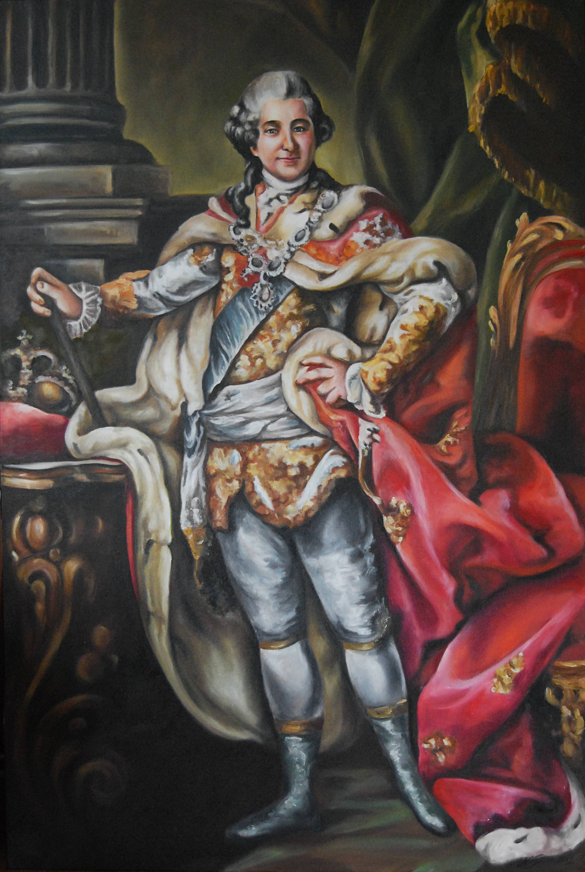 Obraz przedstawia elegancką postać w królewskim stroju, otuloną bogato zdobionym płaszczem. Dominują złote i czerwone barwy, które nadają temu dziełu majestatyczny charakter. Stroje bohatera lśnią złotem, a czerwone akcenty przyciągają wzrok, kontrastując z ciemniejszym tłem. Kompozycja jest tak zwaną formalną – postać stoi wyprostowana, z lekkim uśmieszkiem, co dodaje mu pewnej nonszalancji. Ogólnie rzecz biorąc, klimat jest pełen przepychu i królewskiej dumy. Styl tego portretu można określić jako klasyczny, z nutką barokowego przepychu. Szczegółowe detale, jak połysk tkanin czy mrugnięcie w oku postaci, wskazują na biegłość artysty w oddawaniu szczegółów i emocji. Widząc to dzieło, odbiorca może poczuć się jakby przeniósł się w czasie, do epoki, w której król i jego dwór był na czołówce estetyki i luksusu. Mamy tu poczucie, że postać dominuje nad przestrzenią. Taki "royal attitude", jak to się mówi. Zastanawiam się, co sobie myślał malując to artysta. Może chciał pokazać siłę i władczość króla, albo jego lekkie zapatrzenie w siebie. Wywołuje to mieszankę podziwu i dystansu. "Król ma ładne ubranie!", powiedziałby na pewno jakiś dzieciak, zachwycony widokiem. Mimo formalnego stylu, obraz ma w sobie coś, co sprawia, że myślimy o nim trochę jak o żywej historii.