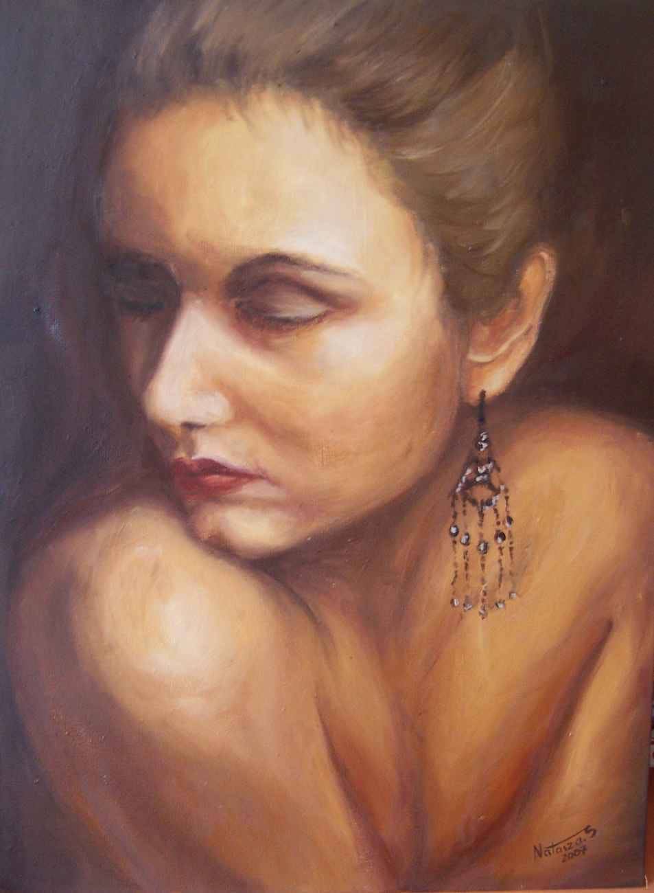 To malarstwo to prawdziwa poezja dla oczu. Dominują tu ciepłe, złociste odcienie, które nadają skórze postaci niemal anielską aurę. Twarz kobiety zwrócona jest w stronę ramienia, oczy przymknięte, jakby zatopiona była w głębokiej zadumie. Kompozycja skupiona jest na twarzy i ramionach, wszystko inne ginie w delikatnym cieniu. Naszyjnik na uchu dodaje głębi i jest jedynym ciemnym punktem, odbijającym resztę światła. Nastrój dzieła jest nostalgiczny, a może nawet lekko melancholijny. Czujemy spokój, jakby czas na chwilę się zatrzymał. Stylem nawiązuje do klasycznego malarstwa, a jednocześnie jest w nim coś nowoczesnego, szczególnie w sposobie, w jaki ukazane są detale. Stosowana tu technika olejna dodaje portretowi miękkości i subtelności. Ten obraz porusza emocje i sprawia, że zastanawiamy się nad tym, o czym myśli ta dziewczyna. Może to tęsknota? Może marzenie o lepszej przyszłości? Mamo, ona wygląda jak księżniczka! Ciekawe, czy kiedykolwiek mi ją spodoba. To jest takie "wow", co? Osobiście czuję ciepło patrząc na ten portret. Taki lekki smutek, ale i nadzieję w jednym. Coś w rodzaju artystycznego relaksu.