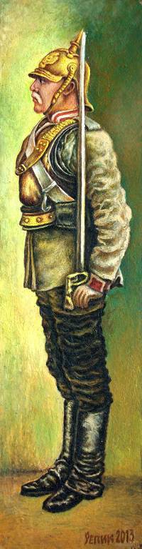 Obraz przedstawia żołnierza w pełnym rynsztunku, skąpanego w ciepłej palecie złota i zieleni. Postać zdominowana jest przez zbroję, której metal mieni się blaskiem, przyciągając wzrok widza. Jego sztywnie wyprostowana sylwetka nadaje kompozycji harmonię i porządek. W tle delikatne przejścia między kolorami tworzą aurę tajemniczości. Nastrój? A bit nostalgic. Czujemy powagę i dostojeństwo przeszłości. Artysta zastosował technikę olejną, dzięki czemu obrazy emitują głębokość i teksturę. Pociągnięcia pędzlem są wyraźne i dynamiczne, co nadaje scenie życia. Przyglądając się detalom, można odczuwać podziw dla precyzji i oddania szczegółom. Coś jak: "Ten rycerz wygląda, jakby zaraz miał opowiedzieć historię swoich przygód!" Właśnie tak mogłoby powiedzieć dziecko fascynujące się rycerzami. Obraz wywołuje emocje związane z męstwem i odwagą, a patrząc na niego, czujemy się przeniesieni w czas wielkich bitew i zamków. Wyjątkowe doświadczenie dla każdego miłośnika sztuki i historycznych opowieści.