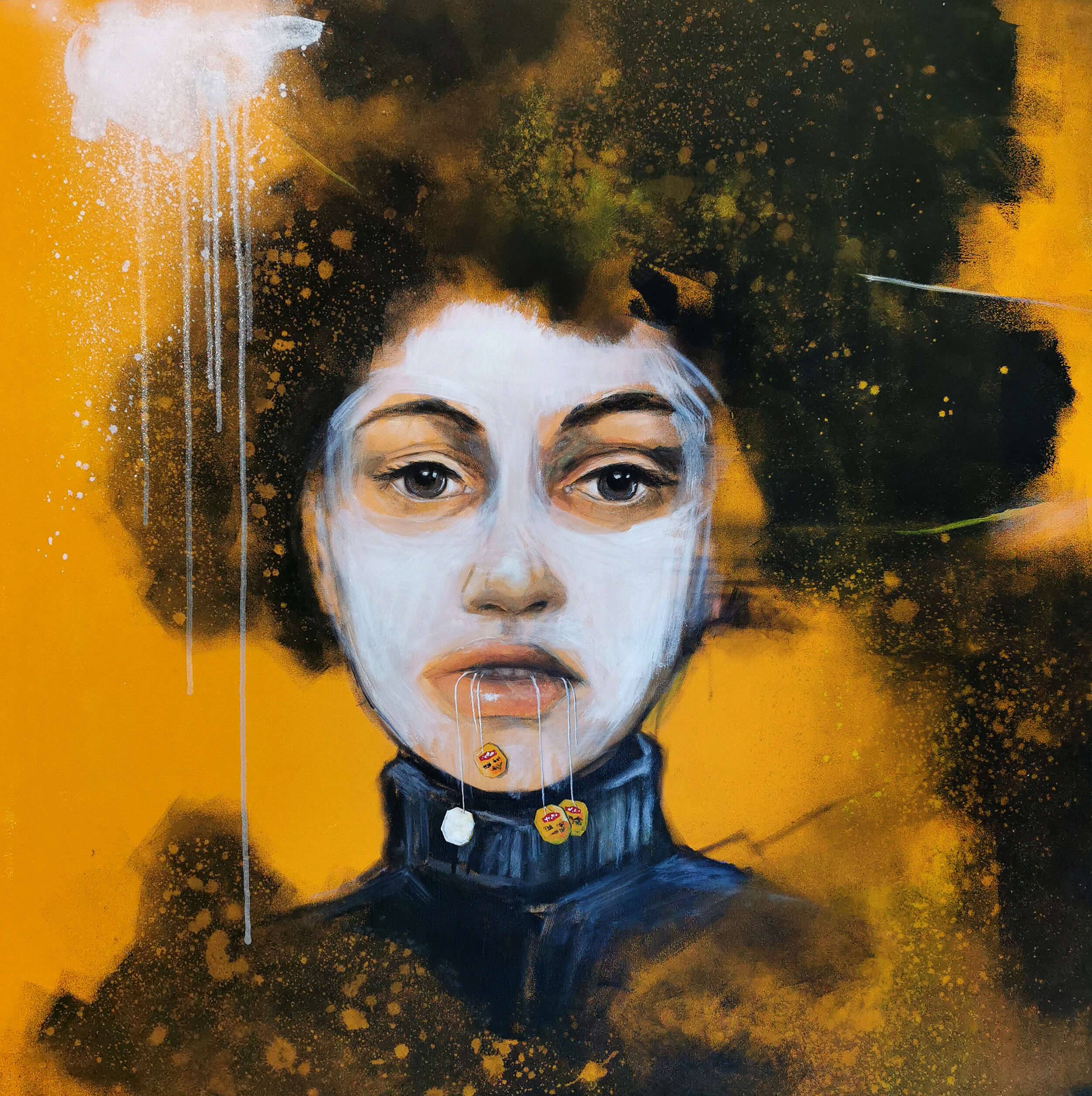"Noś maseczkę, herbata jest zdrowa, pij mleko będziesz wielka" Obraz namalowany farbami akrylowymi na płótnie formatu 100x100cm. Obraz oprawiony w czarną, prostą ramę.