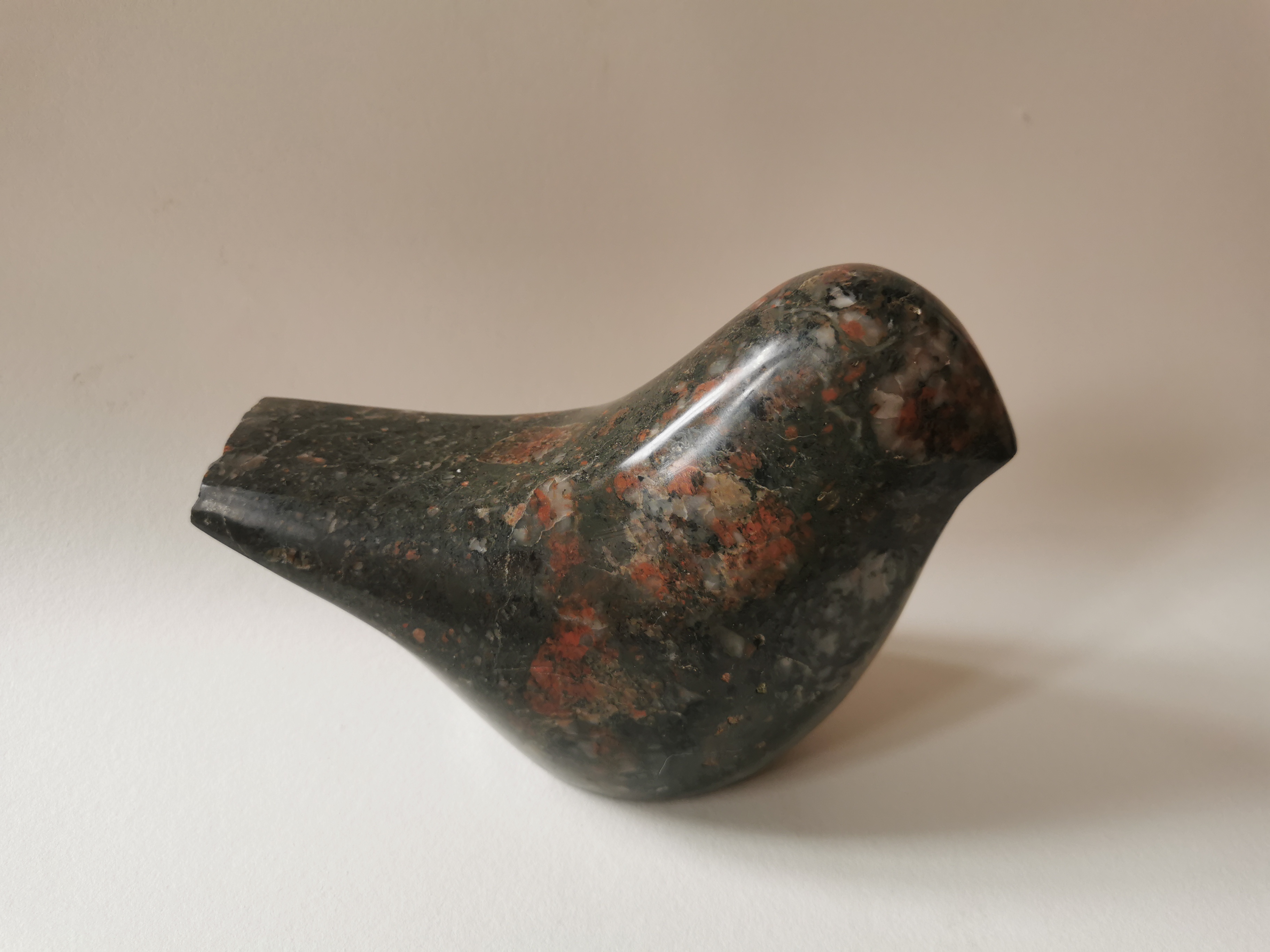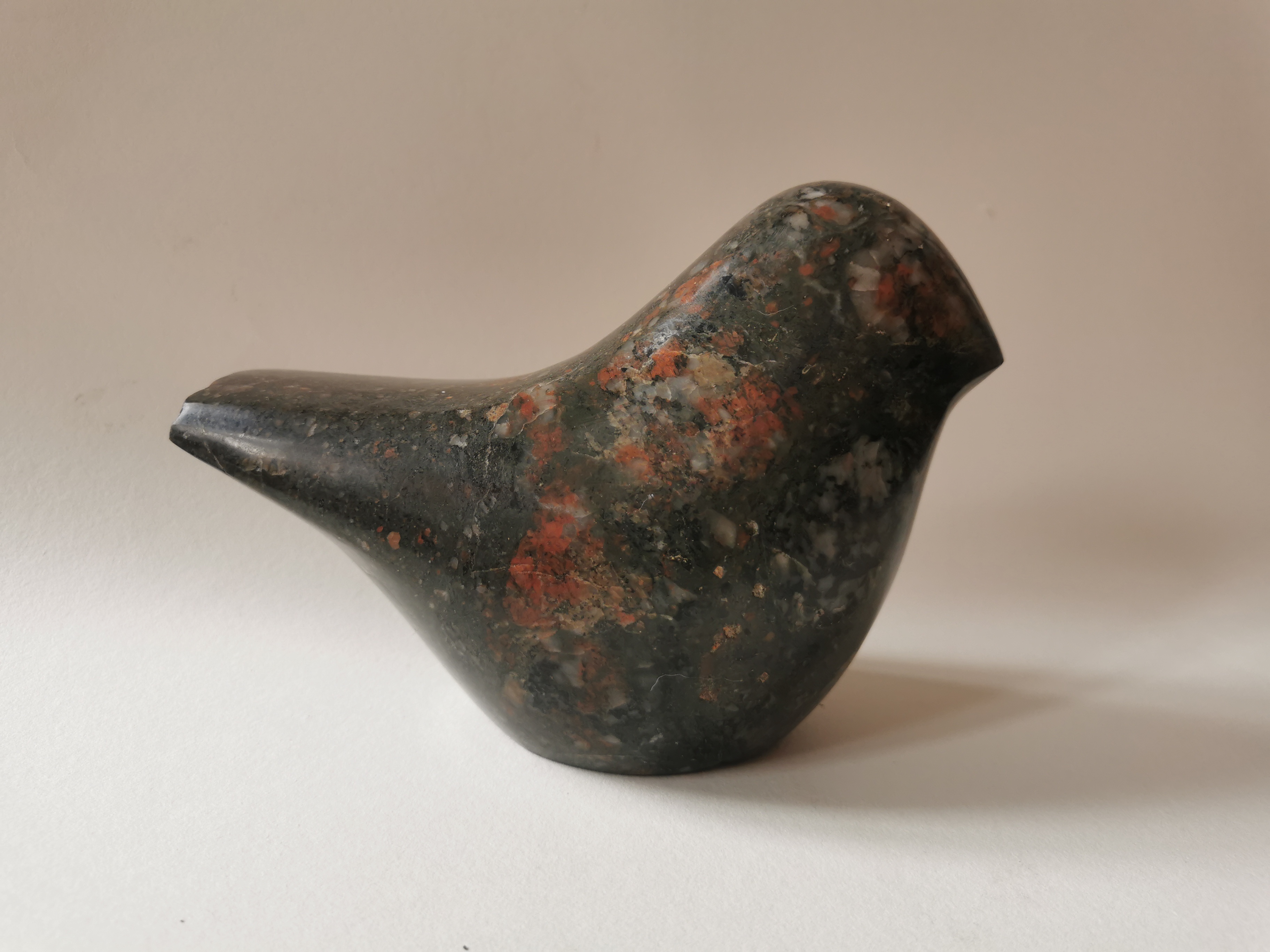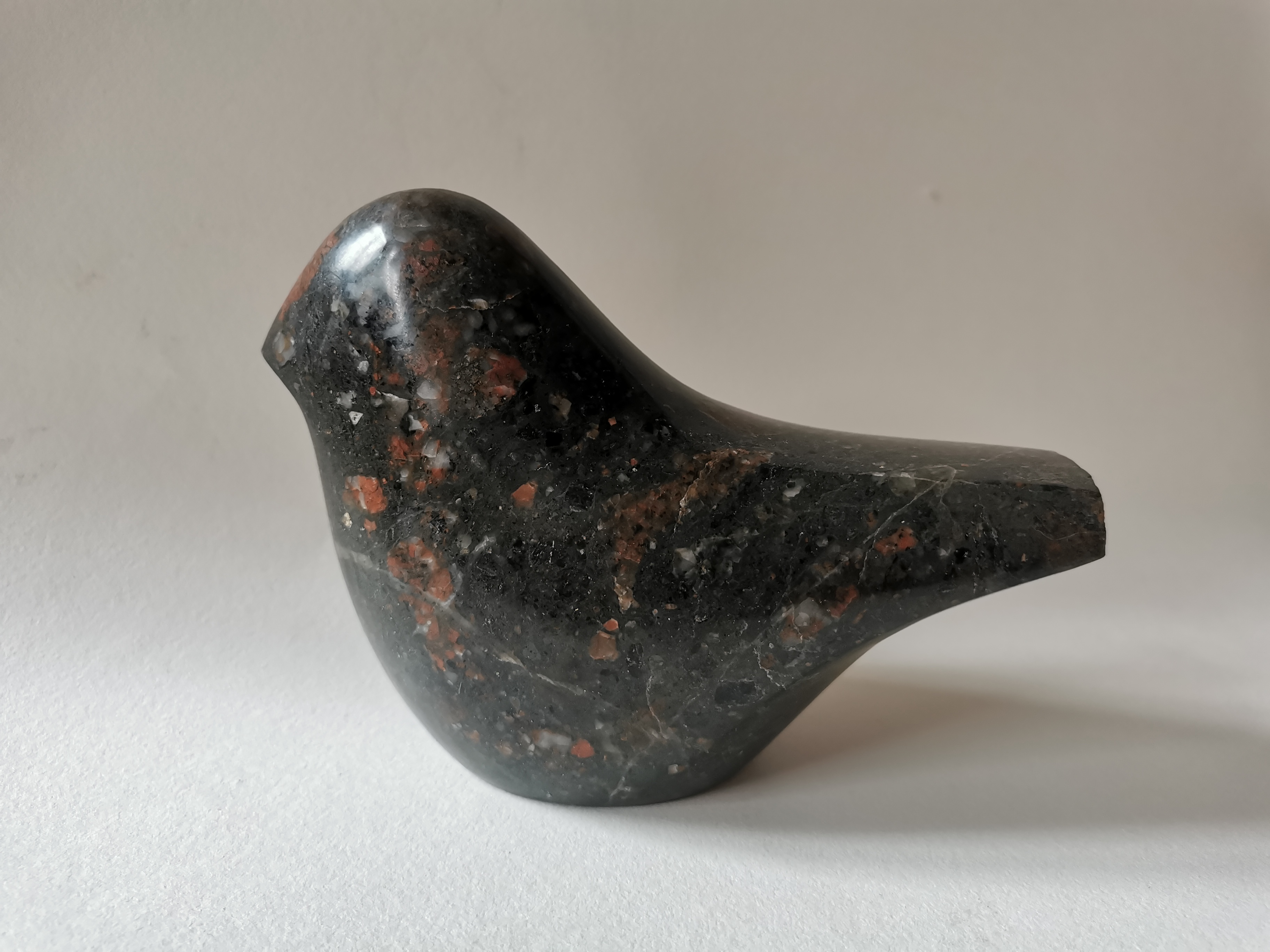 Na fotografii widzimy kamienną rzeźbę w kształcie ptaka. Przeważającym kolorem jest głęboka czerń przeplatana ciepłymi, rudoczerwonymi plamkami. Całość utrzymana jest w minimalistycznym stylu, z gładkimi liniami i delikatnymi zaokrągleniami. Kompozycja przykuwa uwagę swoją prostotą i doskonałym wyważeniem formy. Mozna by rzec, że ten ptak przynosi na myśl spokój i harmonię. Wydaje się, jakby mógł odfrunąć w każdej chwili. Patrząc na tę rzeźbę, można poczuć się tak, jakbyśmy przenieśli się w świat zen. Jest coś magicznego w tej spokojnej obecności kamienia. Artysta zastosował technikę, która podkreśla naturalne piękno materiału i uwypukla teksturę marmuru. Wygląda to almost magical. Mówi się, że mniej znaczy więcej, i w tym przypadku to prawda. Ta rzeźba wywołuje u mnie uczucie zadumy nad przemijaniem i prostotą życia. Mój brat powiedziałby, że ten ptaszek jest jak z bajki. Ten ptak to esencja lekkości i spokoju, a jednocześnie solidności a siły. Wzbudza poczucie ciszy znanej tylko z porannego świtu i daje chwilę na refleksję nad miejscem, w którym jesteśmy.
