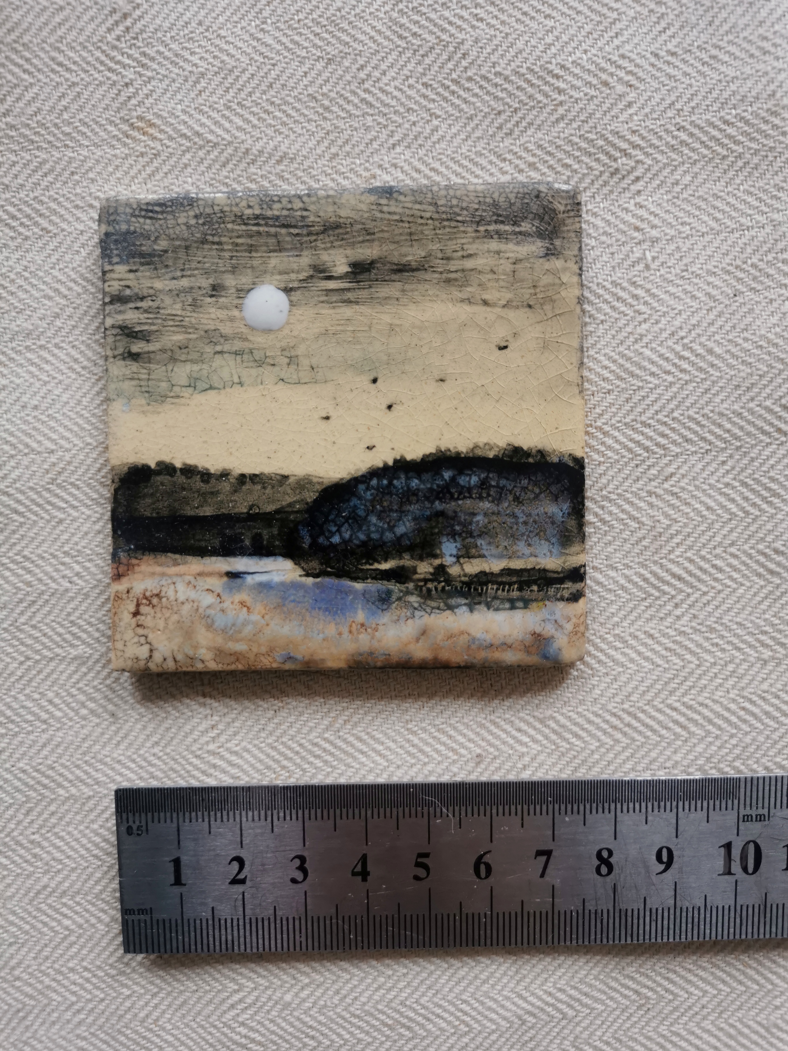 Na obrazie widzimy płytkę ceramiczną o nieregularnej teksturze, która przypomina miniaturowy pejzaż. Kolorystyka jest stonowana – dominuje beż, czerń i subtelne odcienie niebieskiego, tworząc wrażenie odległego horyzontu. Małe, białe koło w górnej części przypomina księżyc zawieszony na mglistym niebie. Cała kompozycja emanuje spokojem, jakby zatrzymała chwilę ciszy tuż przed nadchodzącą burzą. Styl dzieła przywodzi na myśl techniki zaczerpnięte z abstrakcji, gdzie faktura i kolor grają główne skrzypce. Artysta skupił się na niuansach, tworząc efekt crackle, co dodaje głębi i surowości. Płytka ma w sobie coś z artystycznej biżuterii – jej mały rozmiar kryje bogactwo detali. Wow, takie coś mógłby zrobić kosmita na wakacjach! Obraz budzi w odbiorcy refleksje nad nieuchwytnością czasu. Patrząc na niego, można poczuć się jak w małej podróży przez własne myśli. Czy to tylko eksperyment z kolorem, czy opowieść o samotnej nocy? Sam się zastanawiam. Patrząc na tą płytkę, myślę sobie "peaceful" – taki mały, ale wielki jej sukces.