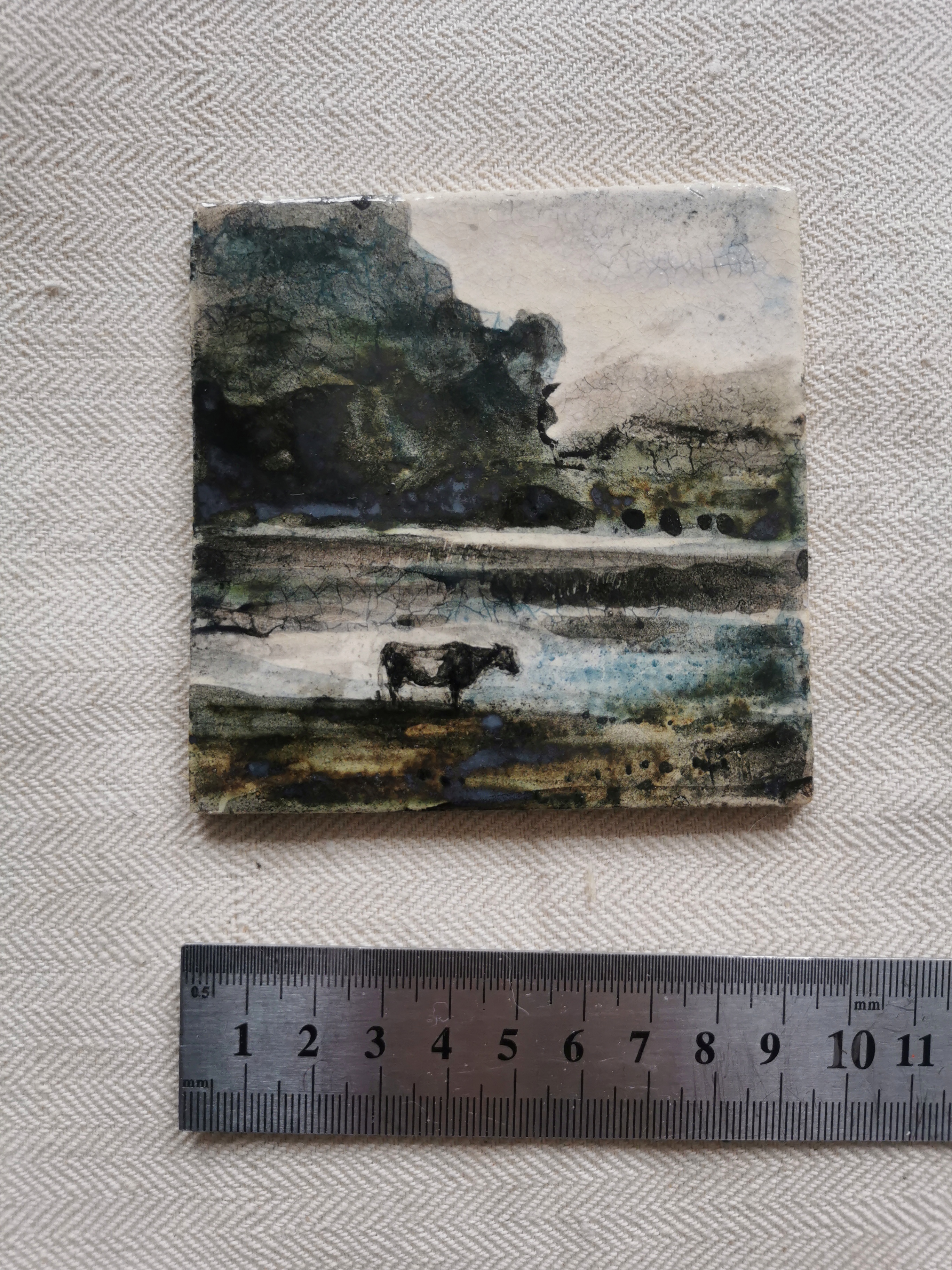 Obrazek przedstawia mały, malarski fragment natury, gdzie dominują stonowane odcienie zieleni, szarości i niebieskiego. Krajobraz zdaje się być spowity lekką mgłą, która nadaje mu tajemniczy, nieco nostalgiczny klimat. W centralnej części obrazu widoczna jest sylwetka krowy, stojącego spokojnie na tle łagodnie zarysowanego zbocza. Kompozycja jest dość minimalistyczna, ale w tym właśnie tkwi jej siła. Artysta posłużył się techniką akwareli, co widoczne jest w subtelnych przejściach kolorów i delikatnych plamach. Obraz ten emanuje spokojem, a jednocześnie zachęca do refleksji nad prostotą chwili zatrzymanej w czasie. Wywołuje to delikatne uczucie tęsknoty za niezmąconą przyrodą. Dzieło można by opisać jako "nostalgic art", bo przenosi nas do świata, gdzie liczy się moment i detale. Gdy patrzę na ten obraz, czuję subtelną harmonię i przypomina mi się dzieciństwo, kiedy krowa na wsi była przyjacielem. Myślę sobie, że nawet dziecko powiedziałoby: "Patrz, krowa w deszczu!" Sam styl pisania artysty to połączenie realizmu z abstrakcją, co pozwala odbiorcy na własne interpretacje i zrozumienie tego, co poza ramą. Czasem warto zatrzymać się na chwilę i po prostu być, jak ta krowa na łące.