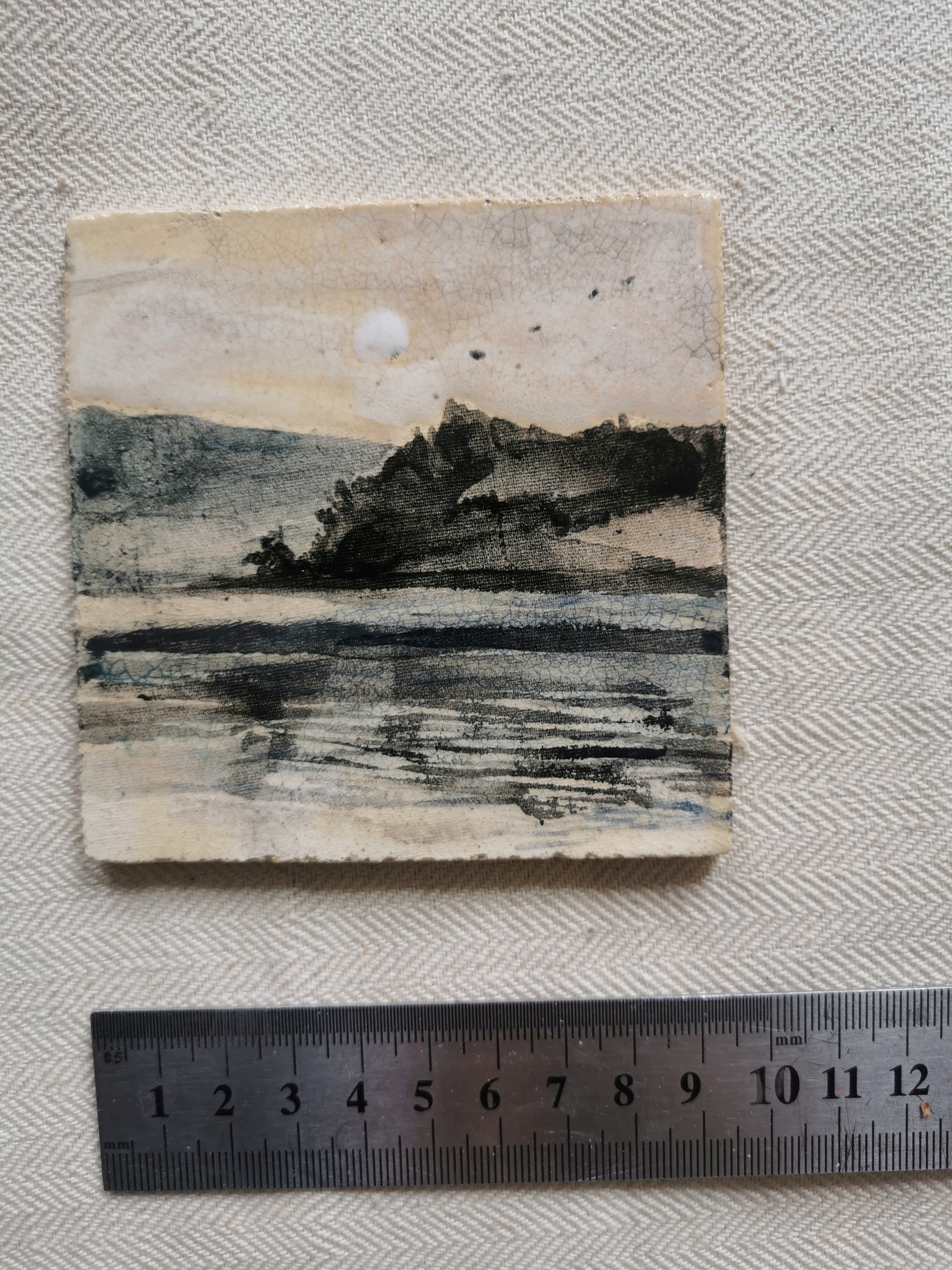 Na obrazie widać delikatny krajobraz w tonach szarości i beżu, który przywołuje na myśl mglisty poranek nad jeziorem. W centralnej części znajdują się ciemne, nieco rozmyte kontury drzew, które stoją jakby na straży nad spokojną wodą. Cała kompozycja jest zanurzona w atmosferze tajemnicy i melancholii. Jakby świat wstrzymał oddech. Może to być moment o wschodzie słońca, gdy światło delikatnie prześwituje przez chmury, tworząc subtelne gradienty. Technika akwareli dodaje obrazowi ulotności, a prostota formy sprawia, że jest on jednocześnie skromny i pełen głębi. Dziecko mogłoby powiedzieć: „To wygląda jak poranek nad płynącą rzeką!”. Każdy pociągnięcie pędzla jest jak szept natury, co wciąga w refleksję nad ciszą i spokojem. Ten obraz to taki „calm oasis” dla duszy. Wzbudza on tęsknotę za chwilą zatrzymania w codziennym biegu. Idealne tło do medytacji czy zamyślenia nad prostotą i pięknem otaczającego świata.