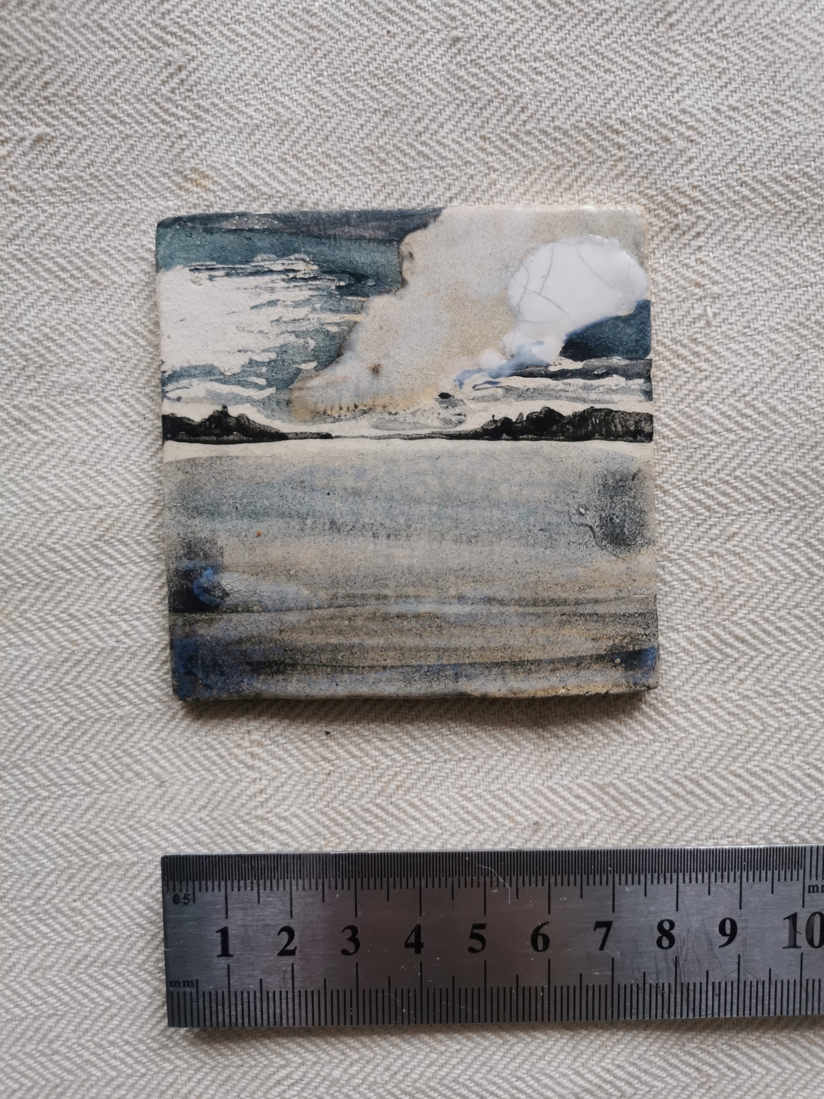 Na obrazie widoczny jest mały, kwadratowy kafelek, który wydaje się być miniaturowym pejzażem. Kolory są stonowane, dominują odcienie niebieskiego, szarości i bieli, tworząc spokojną, nieco melancholijną atmosferę. Widać poziome linie przypominające horyzont, a ciemniejsze akcenty podkreślają kontury pejzażu, jakby to była daleka linia drzew albo wzgórza. Gdy patrzę na ten obraz, czuję takie "wow", jakby to była przygoda minionego lata, zaklęta w drobnej formie. Artysta skorzystał z techniki akwareli, delikatnie rozmazanej, co dodaje lekkości. Wygląda to jak pejzaż namalowany na mokrym papierze, który daje efekt subtelnych, rozlewających się plam. Czy to deszcz, czy mgła? Obraz emanuje spokojem, ale też czymś nieuchwytnym, może tęsknotą. Patrząc na to ma się ochotę usiąść i po prostu popatrzeć na morze w ciszy. "I wtedy przyleciał ptak!". To jest to, obraz pozostawia odbiorcy przestrzeń do własnej interpretacji, pozwala na chwilę zatrzymać się i poczuć "freedom". Mierząc to dzieło, widzimy obok linijkę, co dodaje zwyczajności w tym małym arcydziele codzienności.