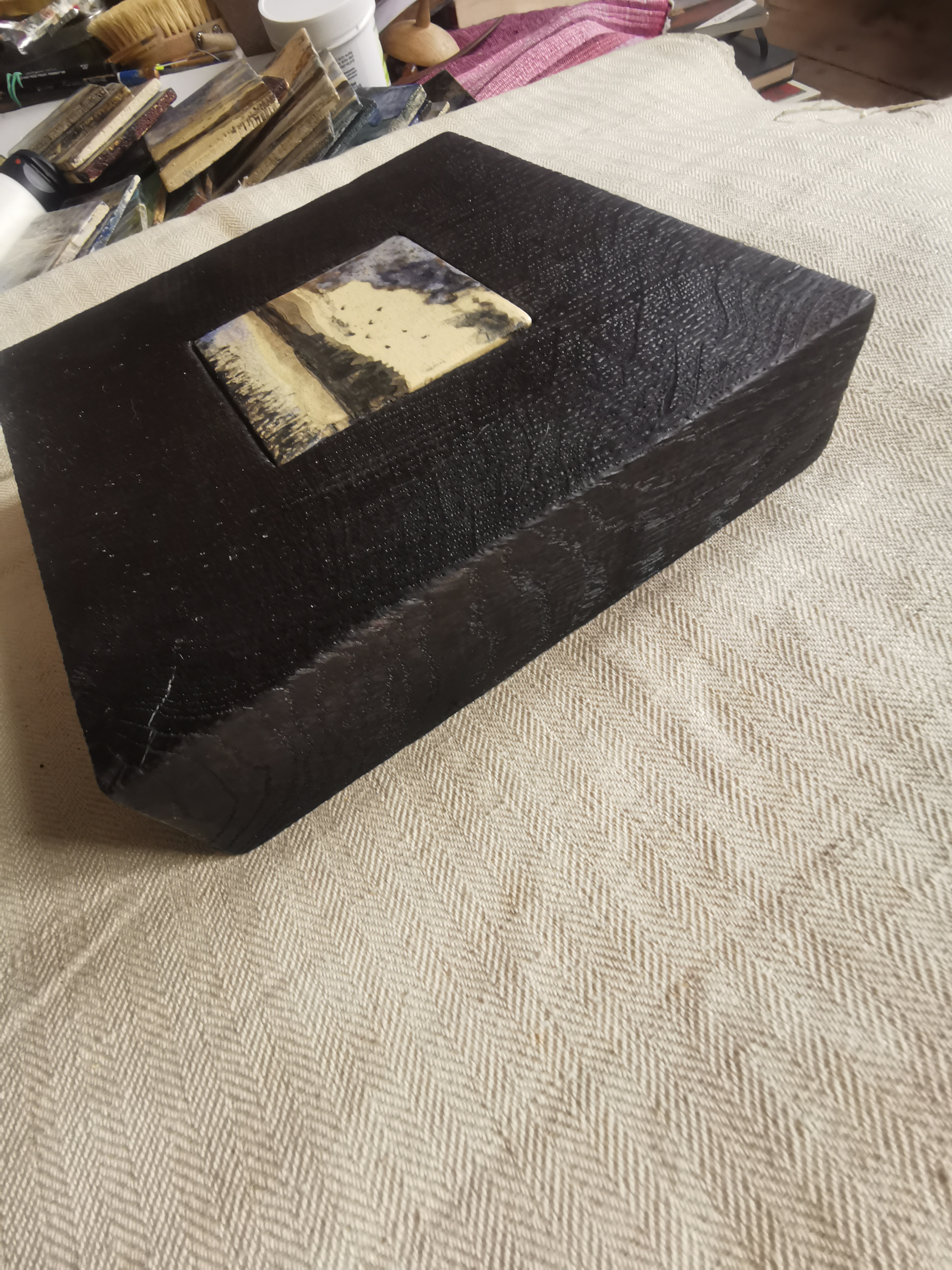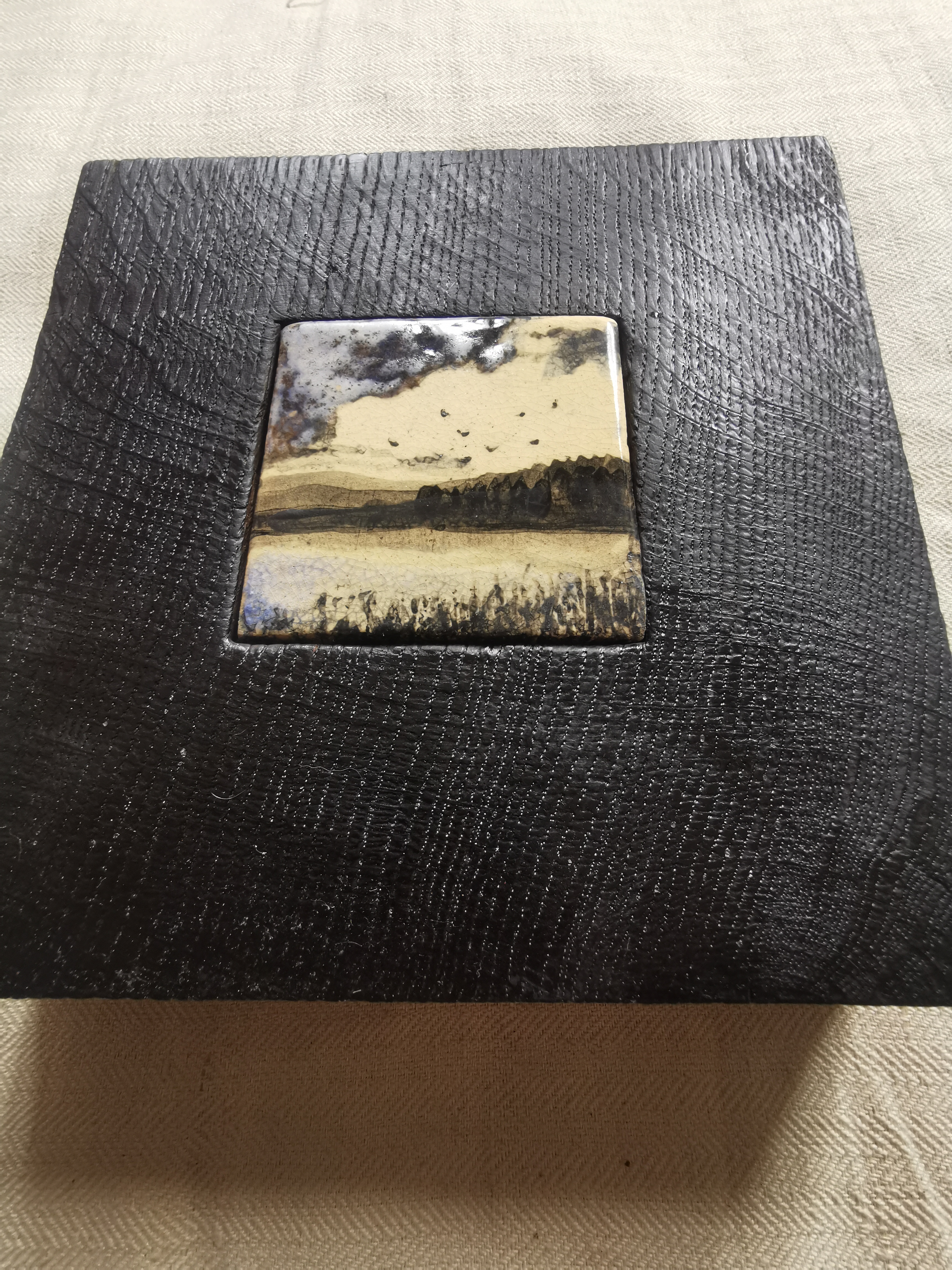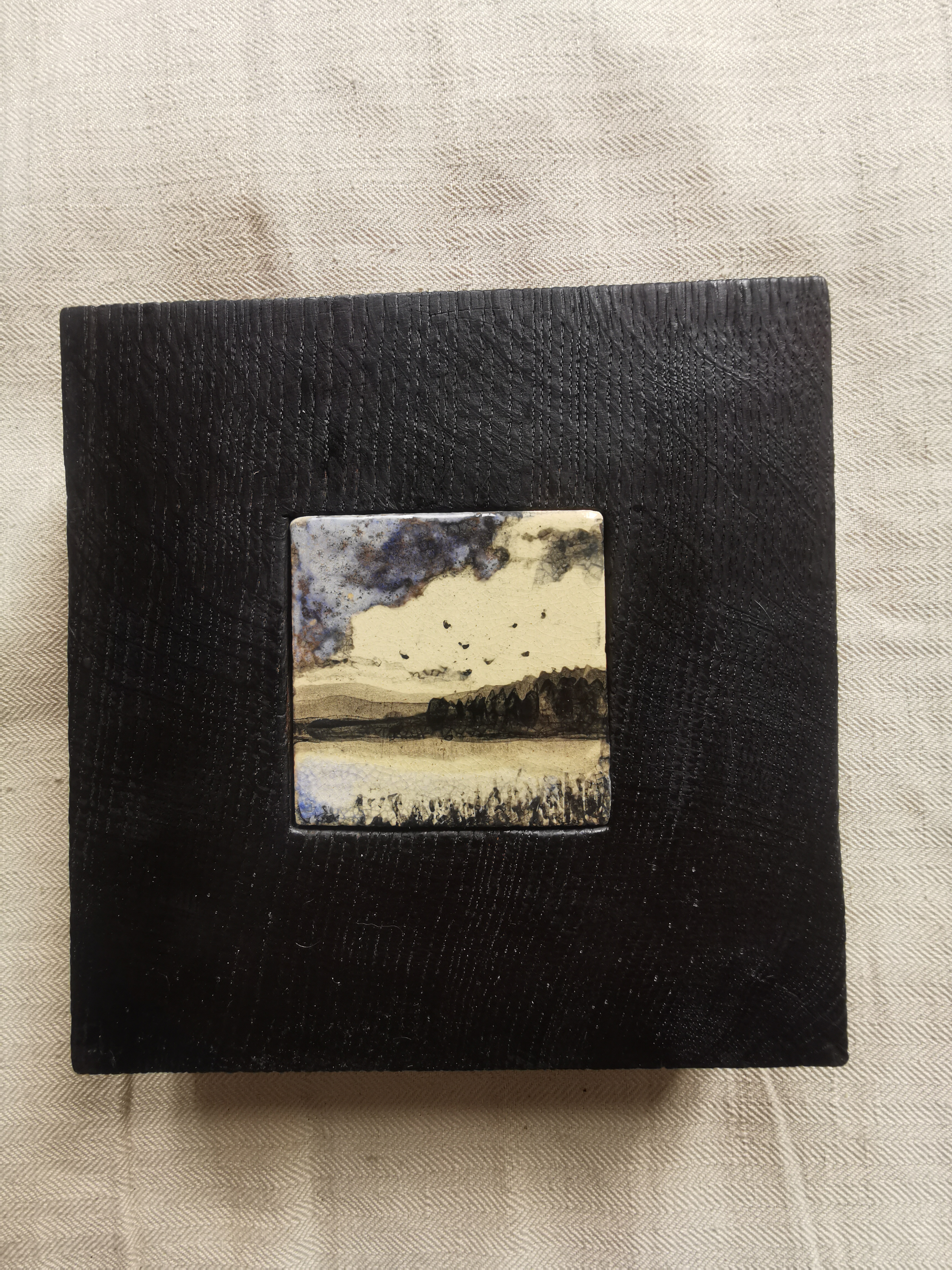 Na obrazie widzimy niewielką ceramiczną płytkę, umieszczoną na ciemnym, drewnianym tle. Kolory tej płytki to delikatne odcienie niebieskiego, beżu i czerni, które tworzą pejzaż przypominający subtelny szkic. Niska linia horyzontu podkreśla szerokość krajobrazu, a unoszące się w powietrzu czarne ptaki dodają dynamiki całej kompozycji. Obraz emanuje spokojem, może nawet odrobiną melancholii, jakby przypominał o kończącym się lecie i nadchodzącej jesieni. Artystycznie, to połączenie ceramiki i drewna jest oryginalne. Można poczuć, że artysta eksperymentował z mixed media, łącząc różne faktury i materiały, aby osiągnąć unikalny efekt wizualny. Jasne i ciemne kontrasty tworzą delicate balance, który przyciąga wzrok i zachęca do refleksji. Obraz wywołuje różnorodne emocje. Może przypominać o podróżach po wiejskich drogach o zmierzchu. Jeden obrazek w głowie, wiesz? Ptaki patrzące na ciebie z nieba. Dla mnie osobiście jest coś magicznego w sposobie, w jaki te proste kolory i kształty tworzą tak bogaty świat. Could be a piece of a dream captured in a frame. Czy to nostalgia? Może uczucie ucieczki do cichego zakątka świata. To dzieło to dialog między sztuką a naturą. Połączenie nowoczesności z tradycją. Patrząc na nie, czuć, jakby na chwilę zatrzymał się czas. Oprawiona ceramika w dębowy klocek .
