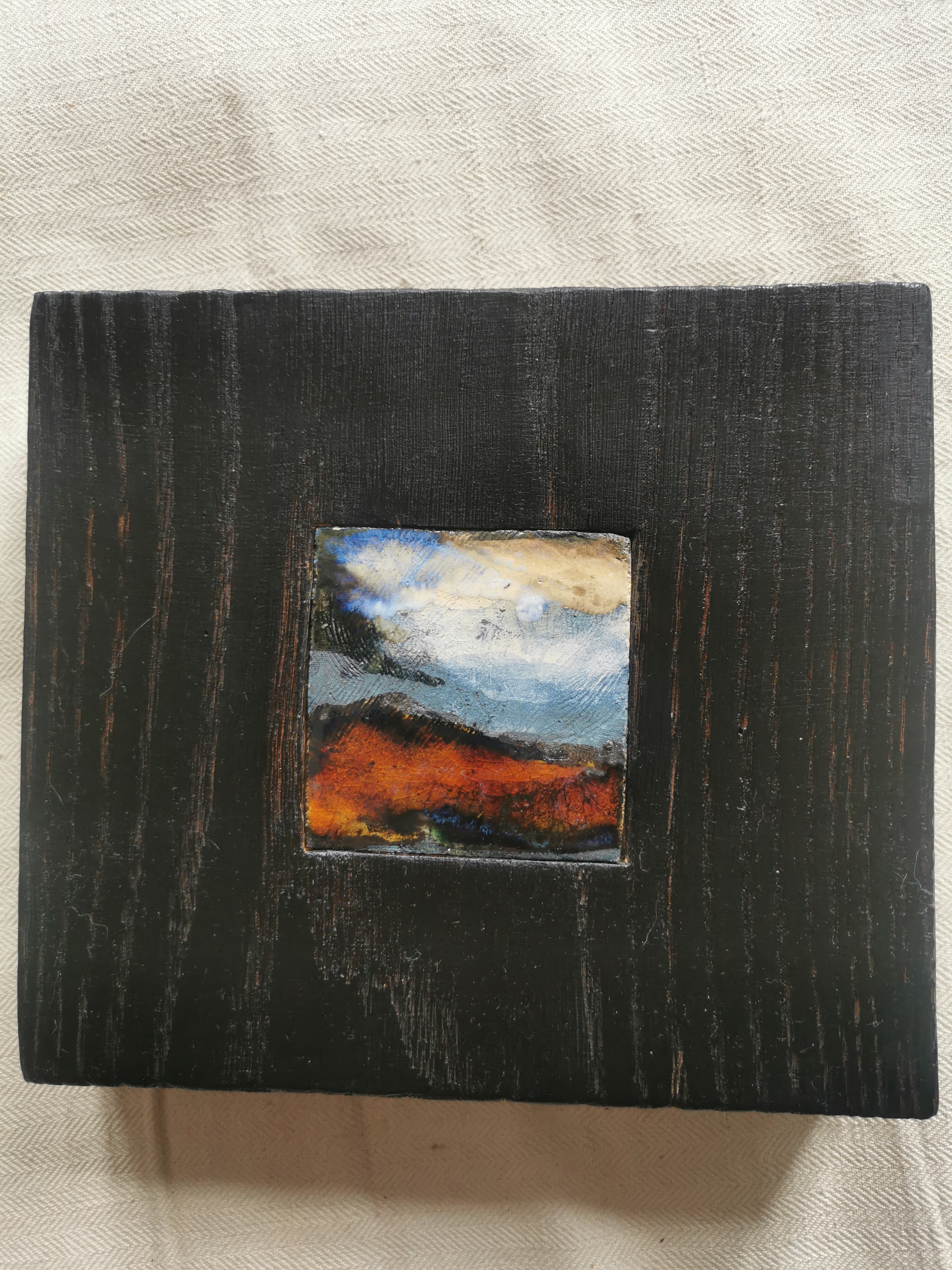 W centrum obrazu przyciąga wzrok mały, kwadratowy fragment pełen intensywnych kolorów. Dominują tam czerwień i pomarańcz, kontrastujące z głębokim błękitem i delikatnymi beżami. Te odcienie tworzą niezwykłą, abstrakcyjną kompozycję przypominającą niekiedy krajobraz o zachodzie słońca. Czerń otaczająca malowidło dodaje mu dramatyzmu. Wygląda to trochę jak okno do innego świata, a może nawet do jakiejś magicznej krainy. Nastrój obrazu jest tajemniczy, ale także odrobinę nostalgiczny. Jakbyśmy patrzyli na jakiś dawny sen. Artysta zastosował grubą fakturę, coś w rodzaju impasto, która sprawia, że kolory wydają się prawie wychodzić z powierzchni płótna. To dodaje mu głębi i specyficznej dynamiki. Można odnieść wrażenie, że obraz żyje własnym życiem, pulsuje energią. Na mój gust, ten obraz jest po prostu fascinating. Czuję, że mogłabym godzinami wpatrywać się w te kolory. Dzieciak mógłby powiedzieć: "To wygląda jak piasek i woda!". I właściwie miałby rację. Ta prostota i złożoność w jednym potrafi wywołać szeroką gamę emocji – od spokoju po niepokój. Fascynuje mnie, jak jeden mały obraz potrafi tak wiele opowiadać. Oprawiona ceramika w dębowy klocek