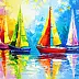 Sailboats in the rainbow dawn, oil painting on canvas 100% handmade high quality oil on canvas, sides painted, for interior or as a gift, will decorate your interior and will please you and your loved ones for a long time. Ready to hang. Na tym obrazie od razu w oczy rzuca się eksplozja kolorów. Żaglówki, które płyną na falach, mienią się odcieniami czerwieni, żółci, niebieskiego i zieleni. Te barwne akcenty tworzą dynamiczną kompozycję, a pastelowe tło rozmywa się w różnych kierunkach. Atmosfera jest pełna życia i energii. Artysta użył techniki impasto, co widać w grubo nakładanej farbie, dodając tekstury i głębi. Obraz jest jak świeża bryza w upalny dzień. Dziecko mogłoby powiedzieć: "Kolorowe łódki płyną jak tęczowe marzenia!" Patrząc na to dzieło, czujesz radość i wolność. Ogólnie, ten obraz to festiwal barw, taki visual feast który zachwyca swą prostotą i bogactwem jednocześnie. Możesz prawie usłyszeć szum wiatru, patrząc na te żagle. Całość jest cudownie impresjonistyczna, budzi skojarzenia z latem, słońcem i beztroską. Emocje jakie wywołuje? Totalny zachwyt i chęć wskoczenia na pokład tej przygody.