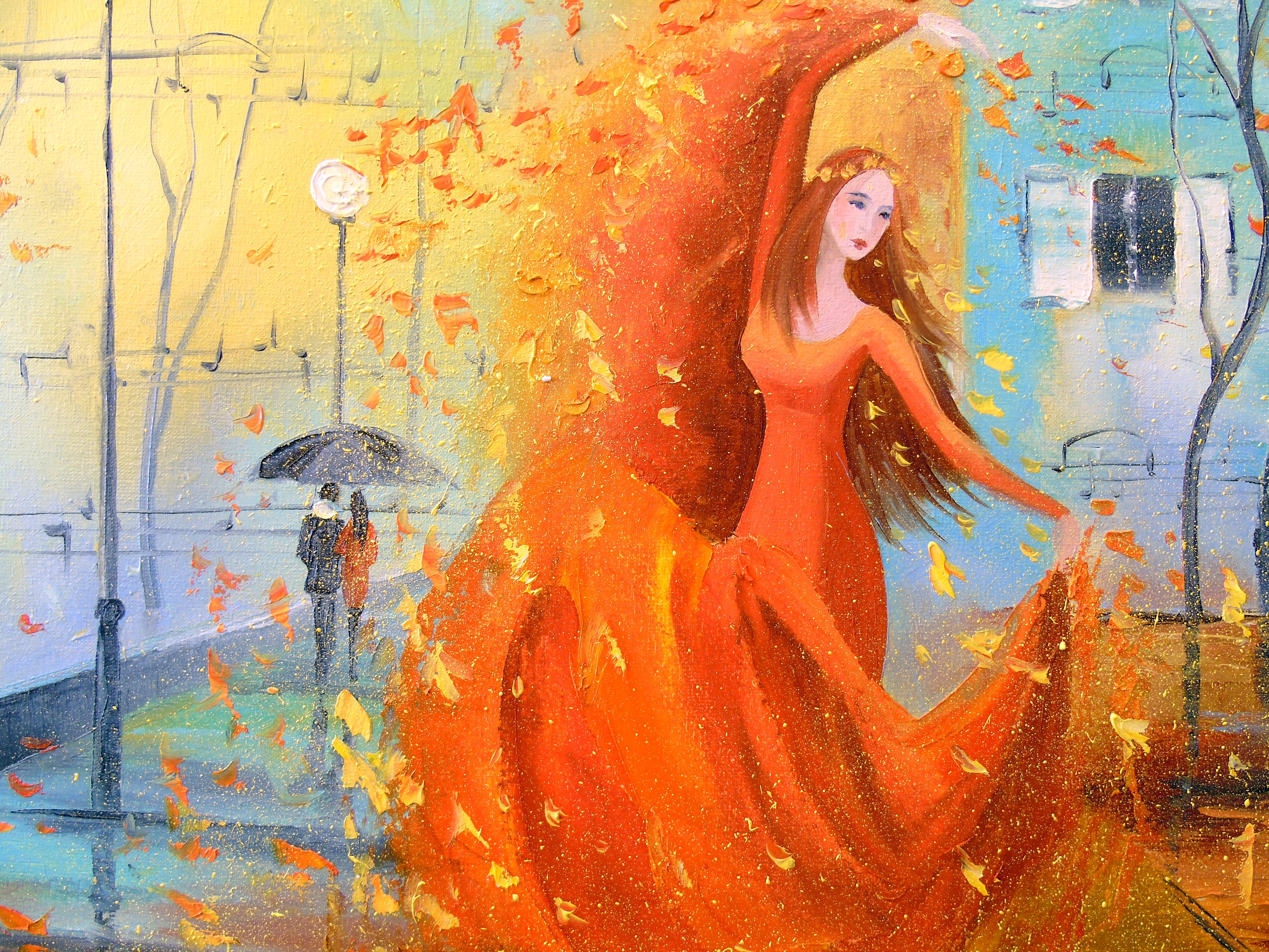 Waltz Boston, without frame as the edges are painted, 100% handmade spatula and high-quality oil, for interior or for a gift. Decorate your interior and make you and your family happy for a long time. Ready to hang. In this painting, I've infused the canvas with the warmth of autumn and the vibrance of movement. A figure clad in fiery hues swirls amidst falling leaves, her skirts blooming like a flower caught in a perpetual dance. The scene is a harmony of nature's change and human grace, an embrace of life's fleeting moments, meant to inspire and energize any space with its dynamic colors and emotion.