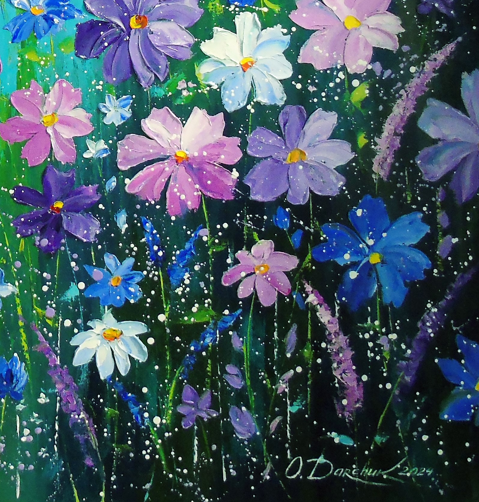 Dance of the morning flowers oil painting on canvas 100% handmade high quality oil on canvas, sides painted, for interior or as a gift, will decorate your interior and will please you and your loved ones for a long time. Ready to hang.Colorful wildflowers in shades of pink, purple, and blue fill the vibrant meadow, creating a lively and lush scene. The background blends soft greens and yellows, enhancing the bright and cheerful atmosphere.