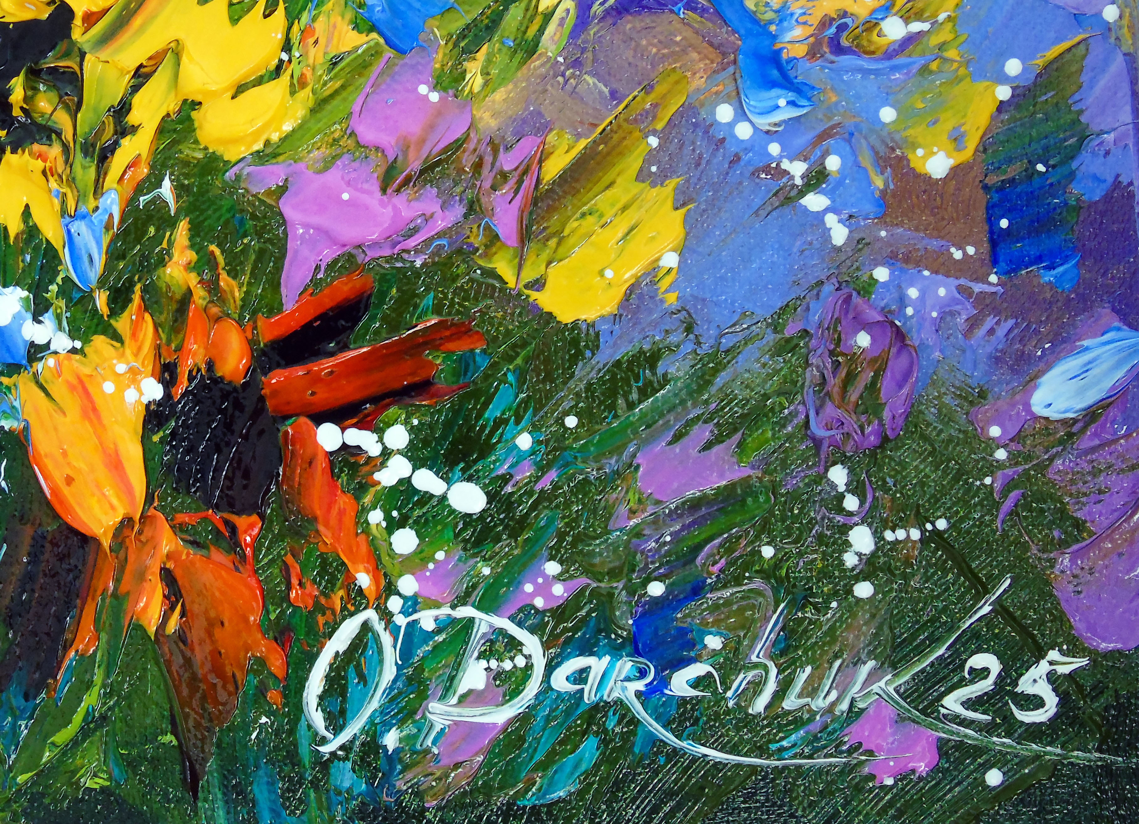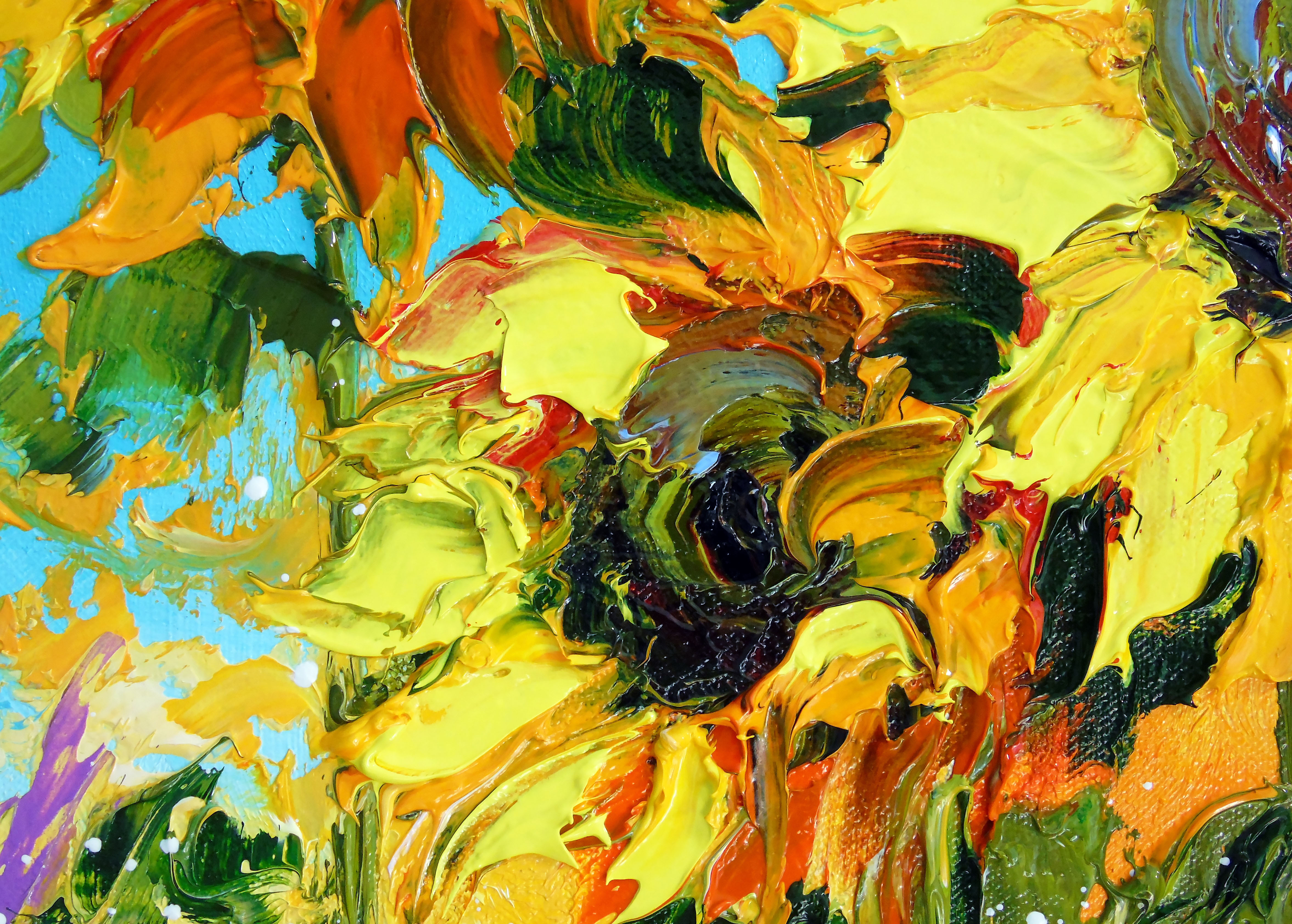 Obraz przedstawia polanę pełną słoneczników, a ich intensywnie żółte płatki rozchylają się ku błękitnemu niebu. Kolory są żywe, niemalże eksplodują z płótna; dominują intensywne żółcie, które kontrastują z głęboką zielenią liści i łodyg. Niebieski kolor nieba przeplata się z białymi, puszystymi chmurami. Kompozycja jest dynamiczna, kwiaty wydają się tańczyć na wietrze, tworząc atmosferę radości i lekkości. Artysta wykorzystał technikę impasto, kładąc farbę grubymi warstwami, co dodaje tekstury i głębi. Każdy pociągnięcie pędzla jest pełen energii, nadając obrazowi wrażenie ruchu. Styl malarski jest swobodny, niemalże kapryśny, jakby artysta pozwolił sobie na chwilę infantylnej zabawy z kolorem i formą. Patrząc na ten obraz, czuję ciepło letniego dnia, słońce na twarzy i delikatny szum traw. To jak magiczny ogród pełen "happiness" i wolności. Może przypominać nam o prostych radościach życia, takich, które dziecko dostrzega w święty spokoju letniej łąki. Siódemeczce na pewno by się to spodobało – "O, zobacz mamo, słonko uśmiecha się do kwiatków!" Obraz emanuje pozytywną energią i przywołuje uśmiech, przypomina, że piękno tkwi w prostocie.