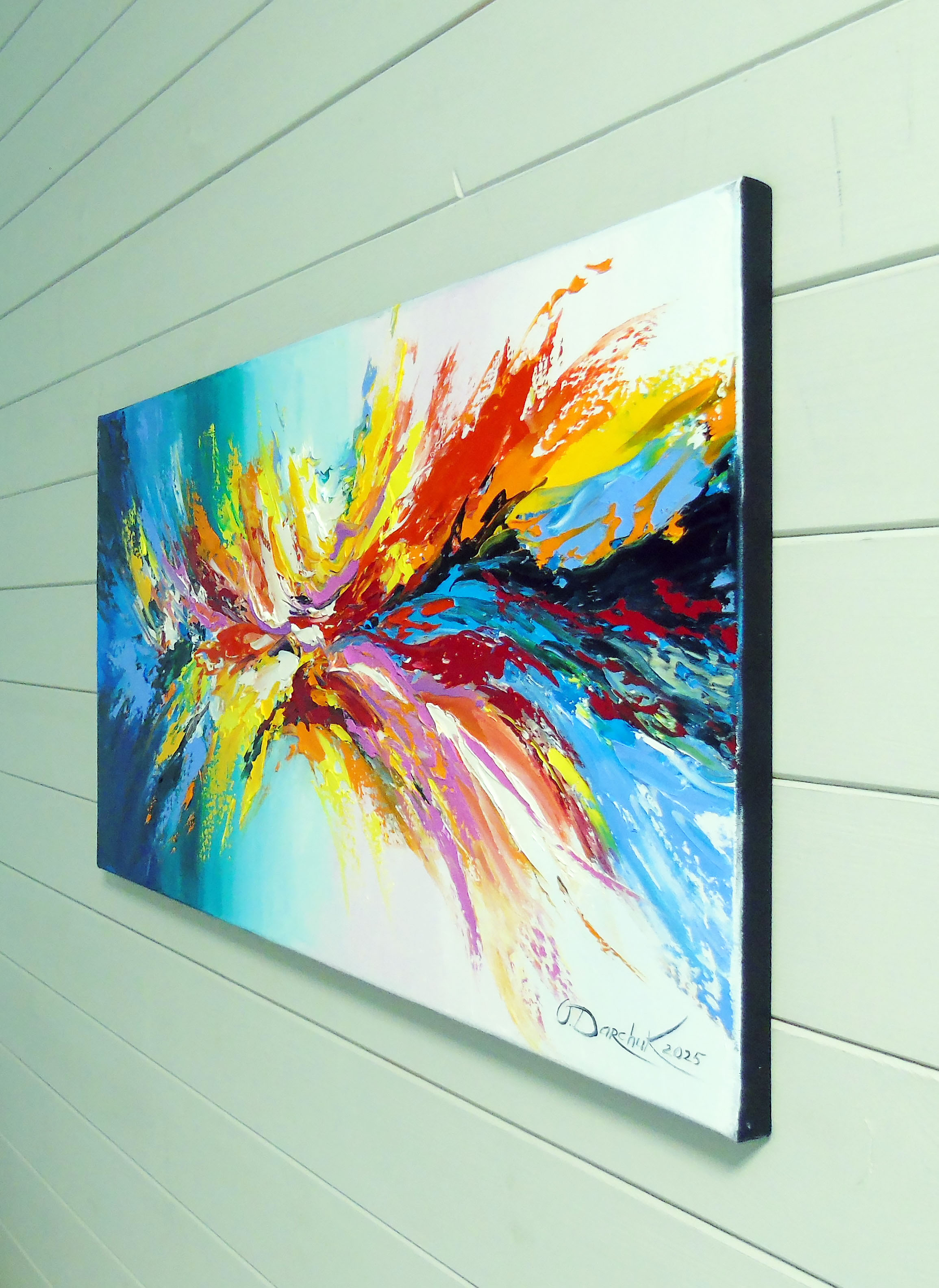 Energy of the Universe, a 100% handmade oil painting on canvas with high-quality oil on canvas, painted sides, perfect for interior decoration or as a gift. It will decorate your home and bring joy to you and your loved ones for a long time. Ready to hang. Dynamic swirls of color blend seamlessly across the canvas, creating an intense sense of motion. The mix of blues, reds, and yellows catches the eye with a striking visual impact.Na tym obrazie królują wybuchowe kolory, które przypominają erupcję wulkanu zamkniętą w niebieskiej otchłani. Intensywne czerwienie, żółcie i pomarańcze przeplatają się z niebieskościami oraz zieleniami. Całość przypomina płynny ruch, niemalże taniec kolorów na płótnie. Atmosfera dzieła jest pełna dynamiki i życia, niczym letnia burza, która wzbudza w widzu poczucie ekscytacji. Styl artystyczny można opisać jako abstrakcyjny ekspresjonizm, w którym gesty pędzla są pełne pasji. Artysta użył techniki impasto, co zobaczymy w trójwymiarowej teksturze farby. Obraz może wywoływać różne emocje, od radości po zachwyt, jakby ktoś krzyknął "Wow!". Patrząc na to dzieło, mam wrażenie, że mogę dotknąć tych kolorów i poczuć ich energię. Dzieciom mogłoby się wydawać, że to tęczowy wybuch. Czyż to nie cudowne? To takie energiczne i vibrant, niemalże słychać, jak kolory ze sobą rozmawiają. W takich chwilach czuję, że sztuka naprawdę potrafi ożywić duszę.
