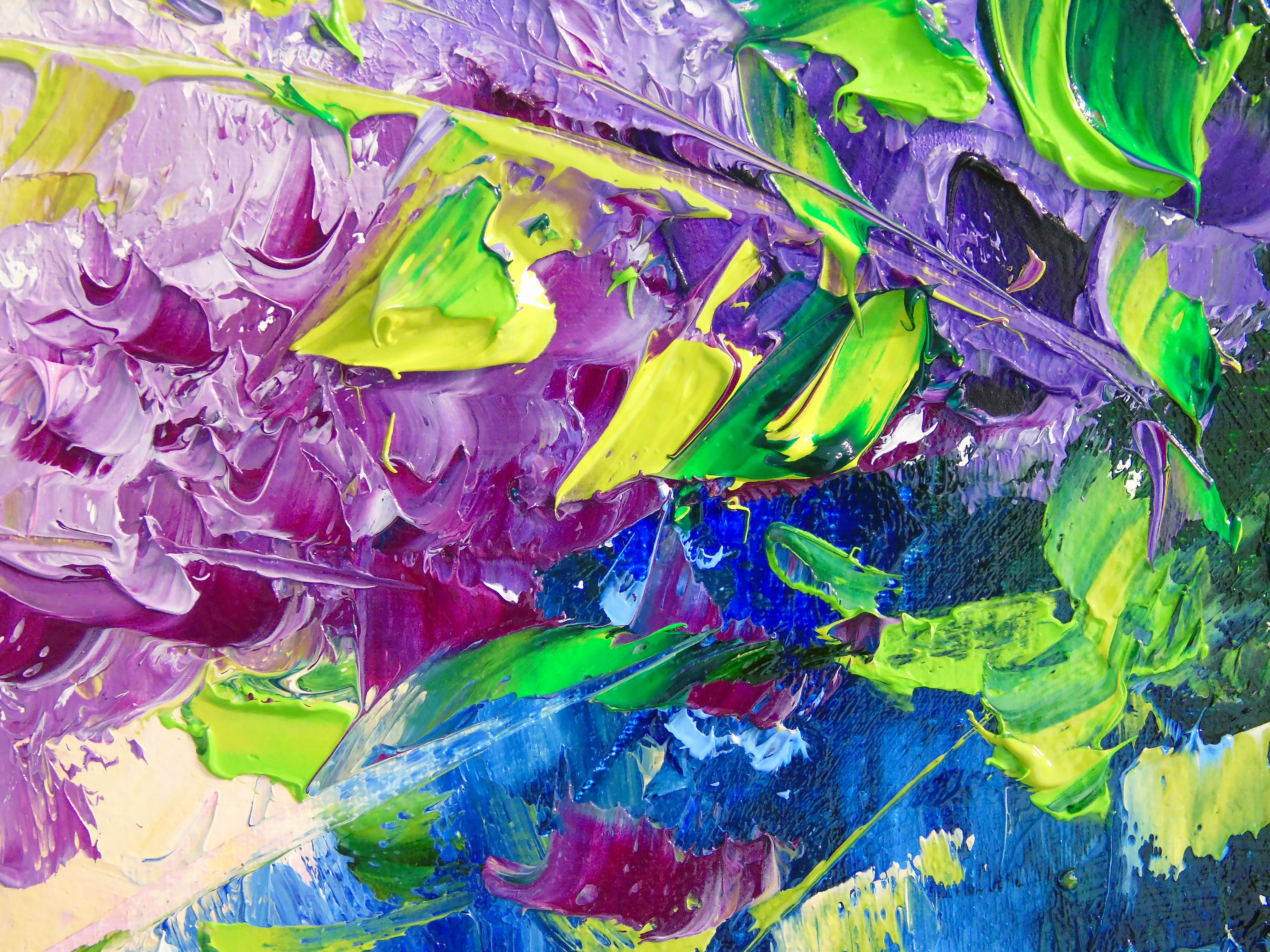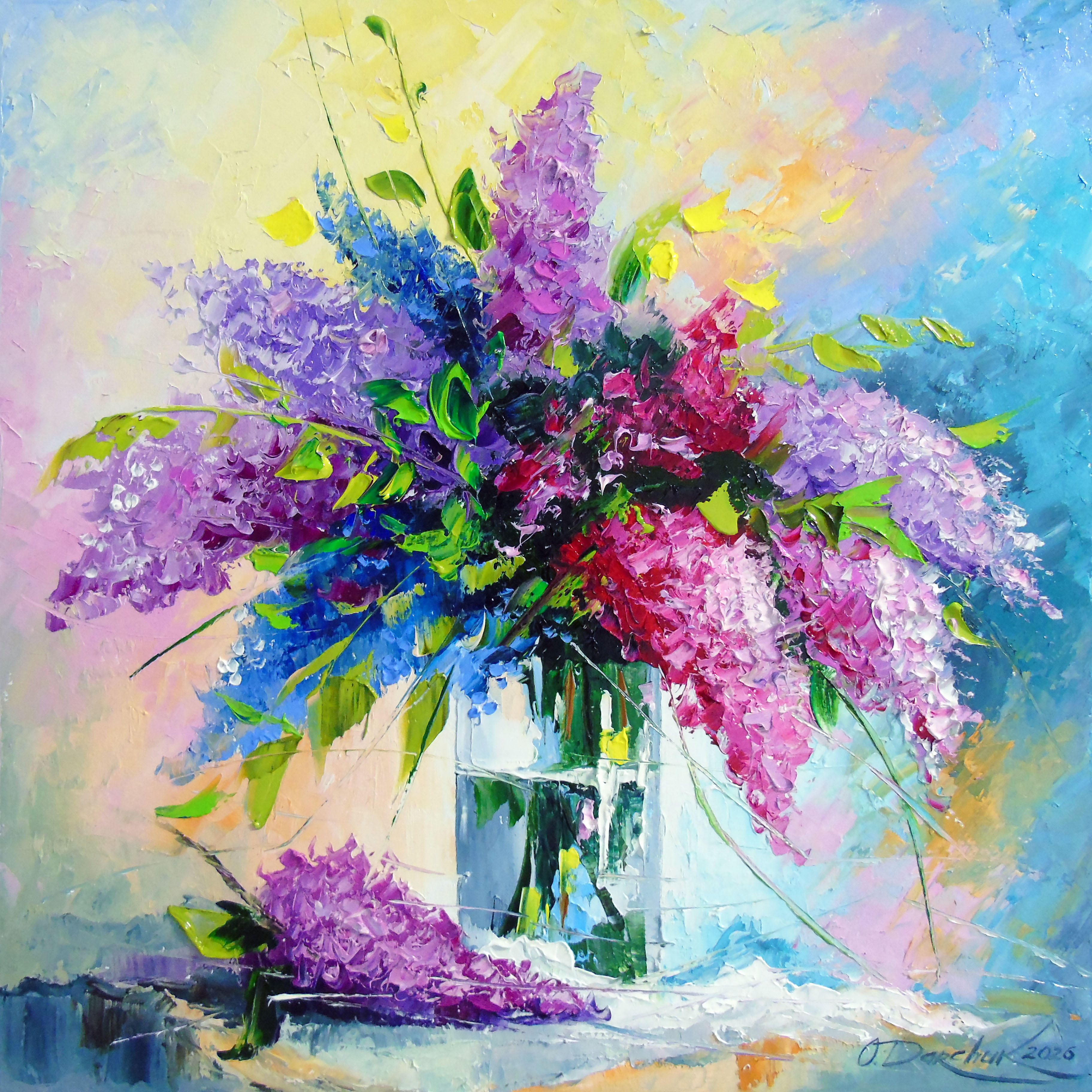 Lilac Bouquet in a Glass Oil Painting on Canvas. 100% handmade, high-quality oil on canvas with painted sides. For interior decoration or as a gift. It will decorate your space and will bring joy to you and your loved ones for a long time. Ready to hang. In this vibrant oil painting, I poured my passion into every brushstroke, capturing lilacs bursting with life and color. The energetic blend of expressionism and impressionism breathes emotion and movement into the bouquet, inviting warmth and joy into any space. This piece radiates freshness, transforming your home with its uplifting spirit and the delicate beauty of nature's fleeting moments. A stunning arrangement of lilacs in a glass vase bursts with color.