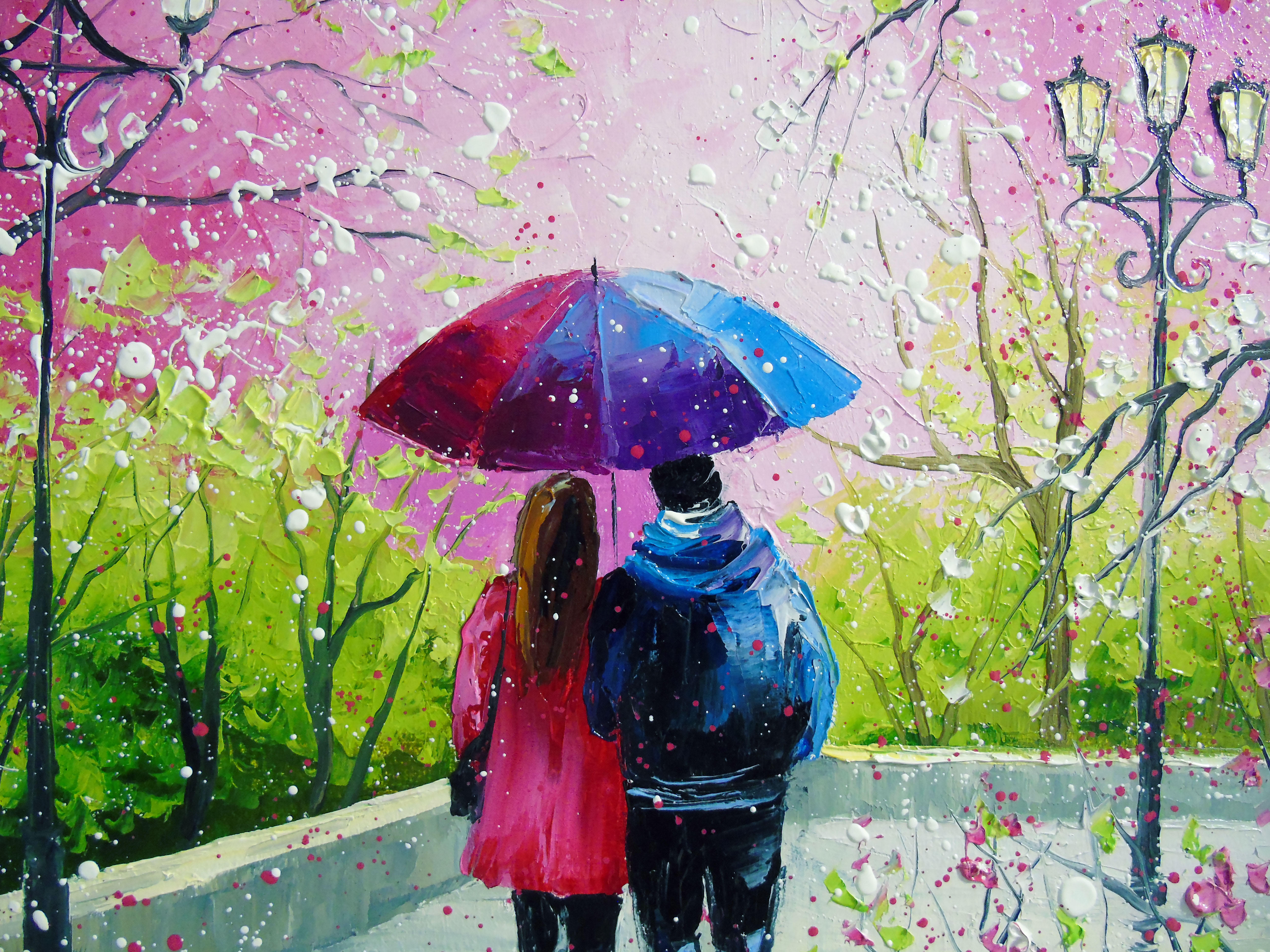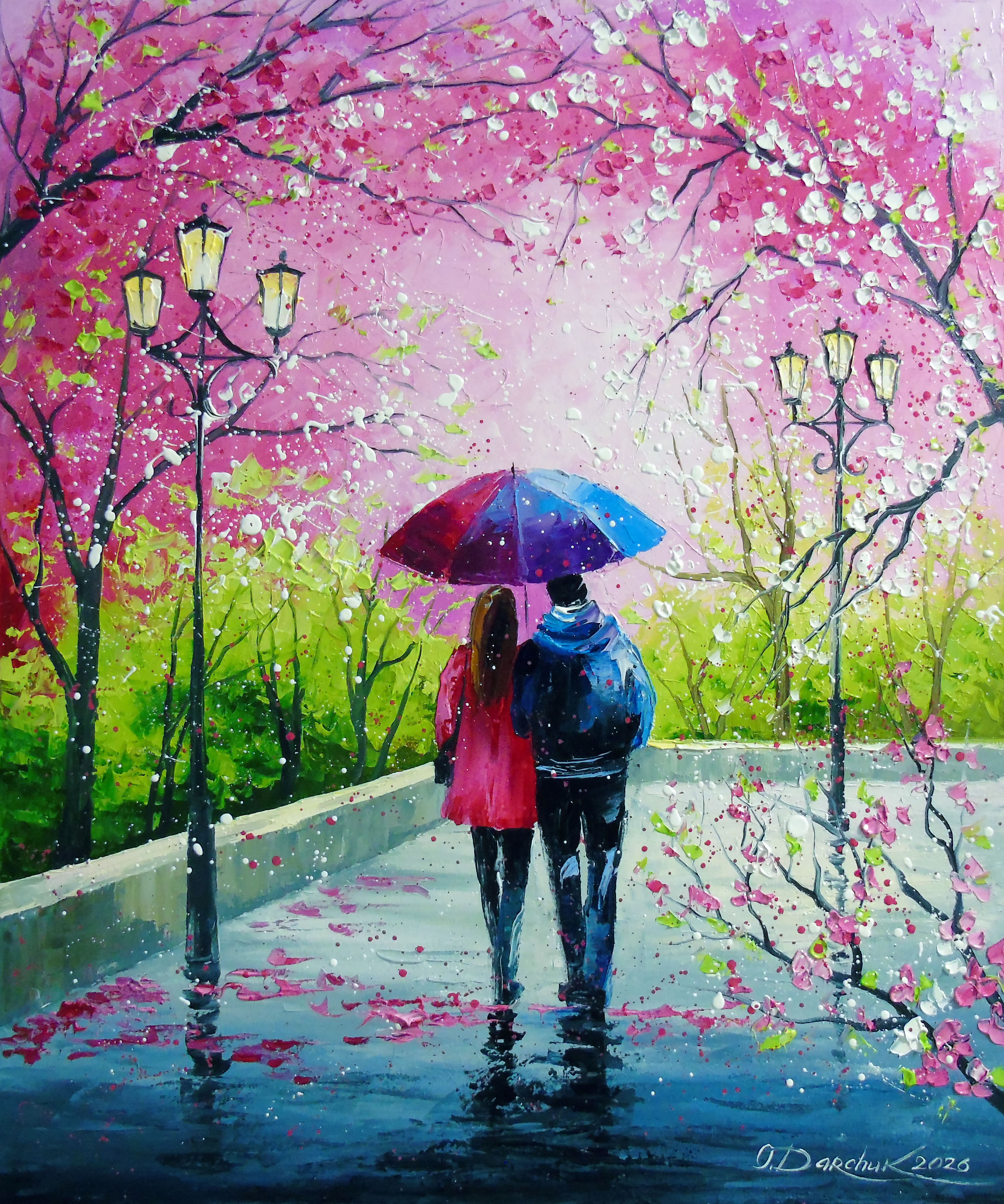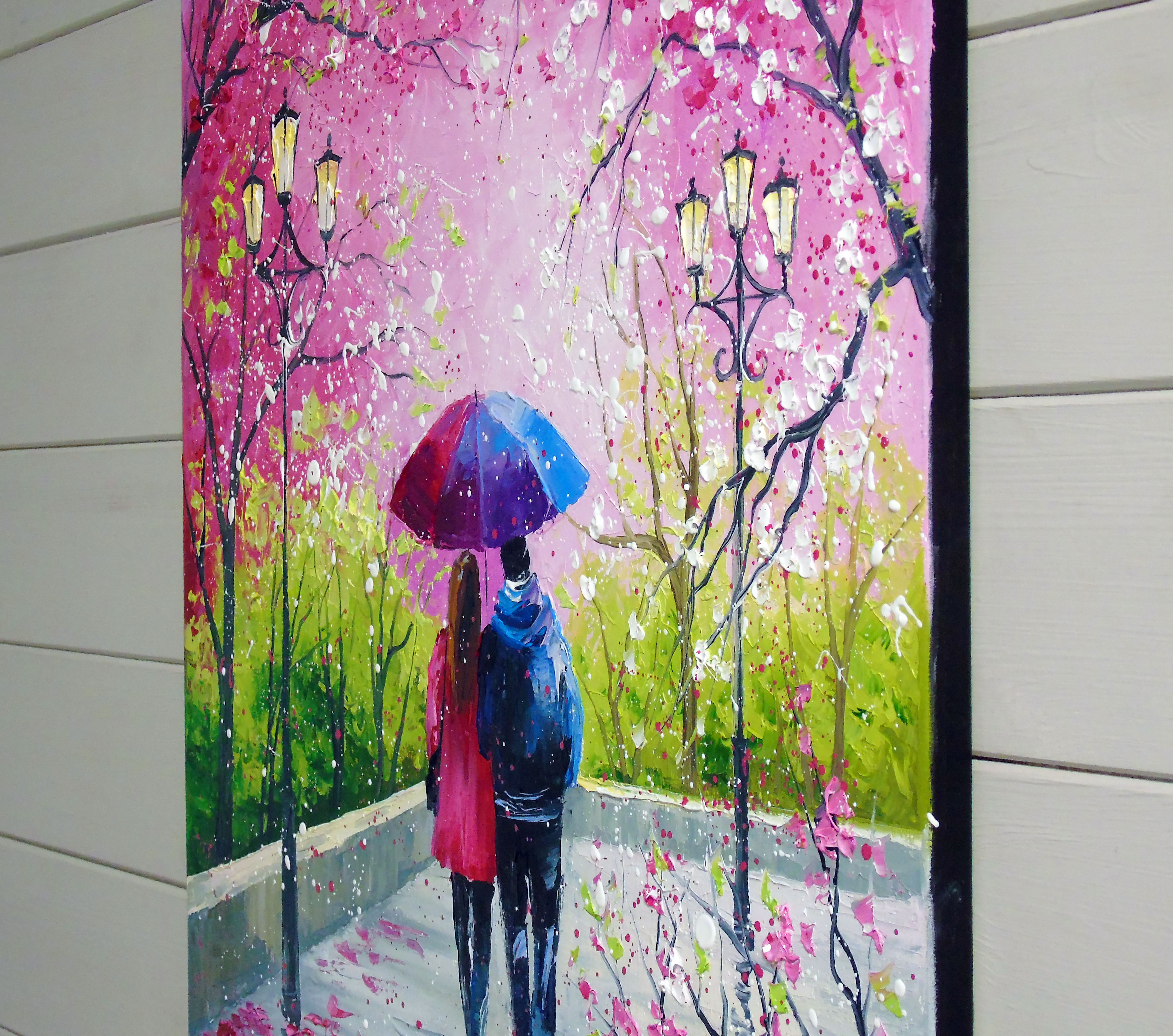 Under the Umbrella of Spring oil painting on canvas. 100% handmade, high-quality oil on canvas with painted sides. For interior decoration or as a gift. It will decorate your interior and will delight you and your loved ones for a long time. Ready to hang. A couple shares an umbrella while walking along a path framed by cherry blossom trees. The scene captures the vibrant colors of spring. In this piece, I poured my heart into capturing a tender moment of connection beneath blooming trees. Using oil paint, I spread vibrant pinks and lush greens to evoke spring's joyful renewal. The gentle rain and shared umbrella symbolize warmth and unity, inviting you to feel love's calm energy whenever you glimpse this scene in your home, filling it with hope and serenity.