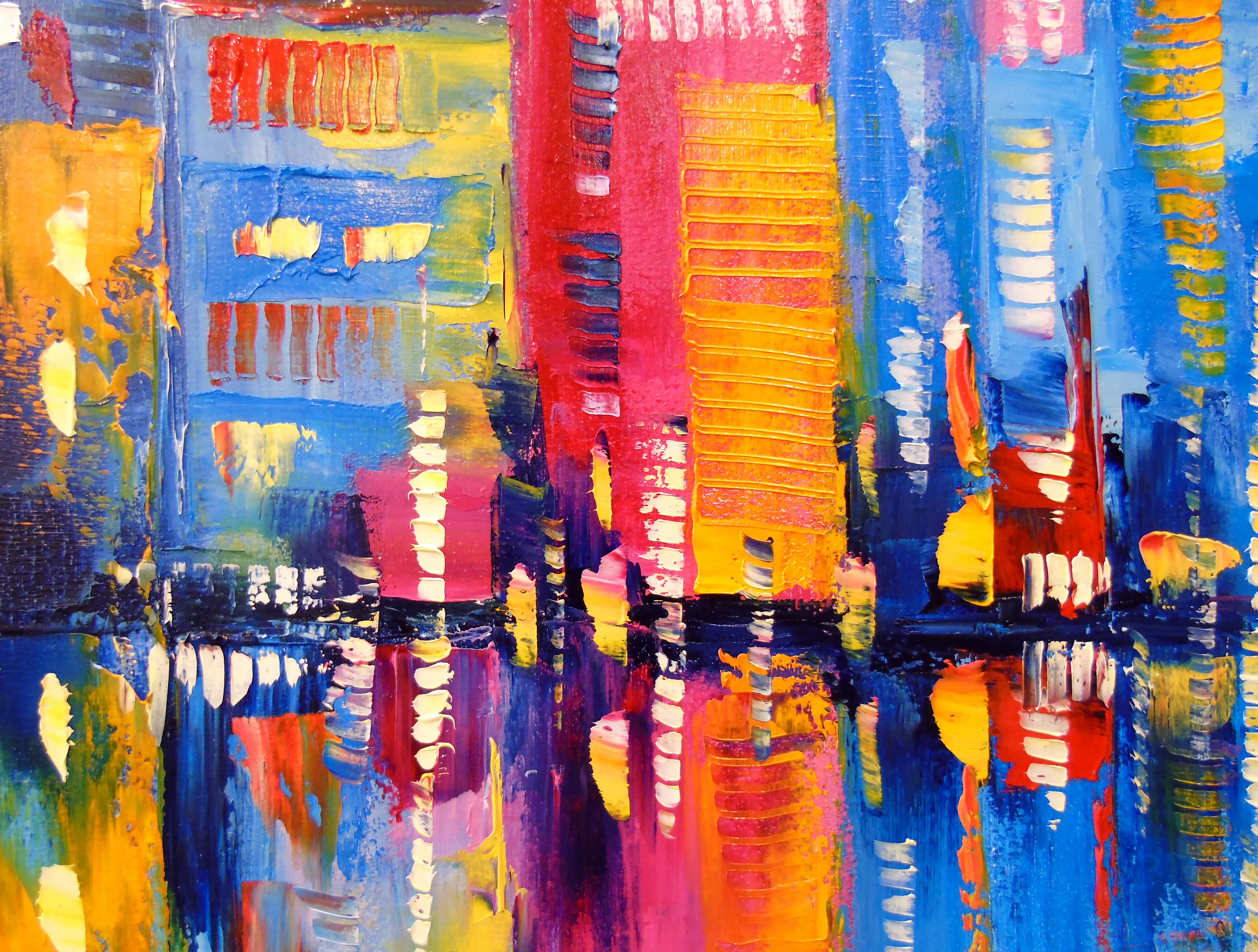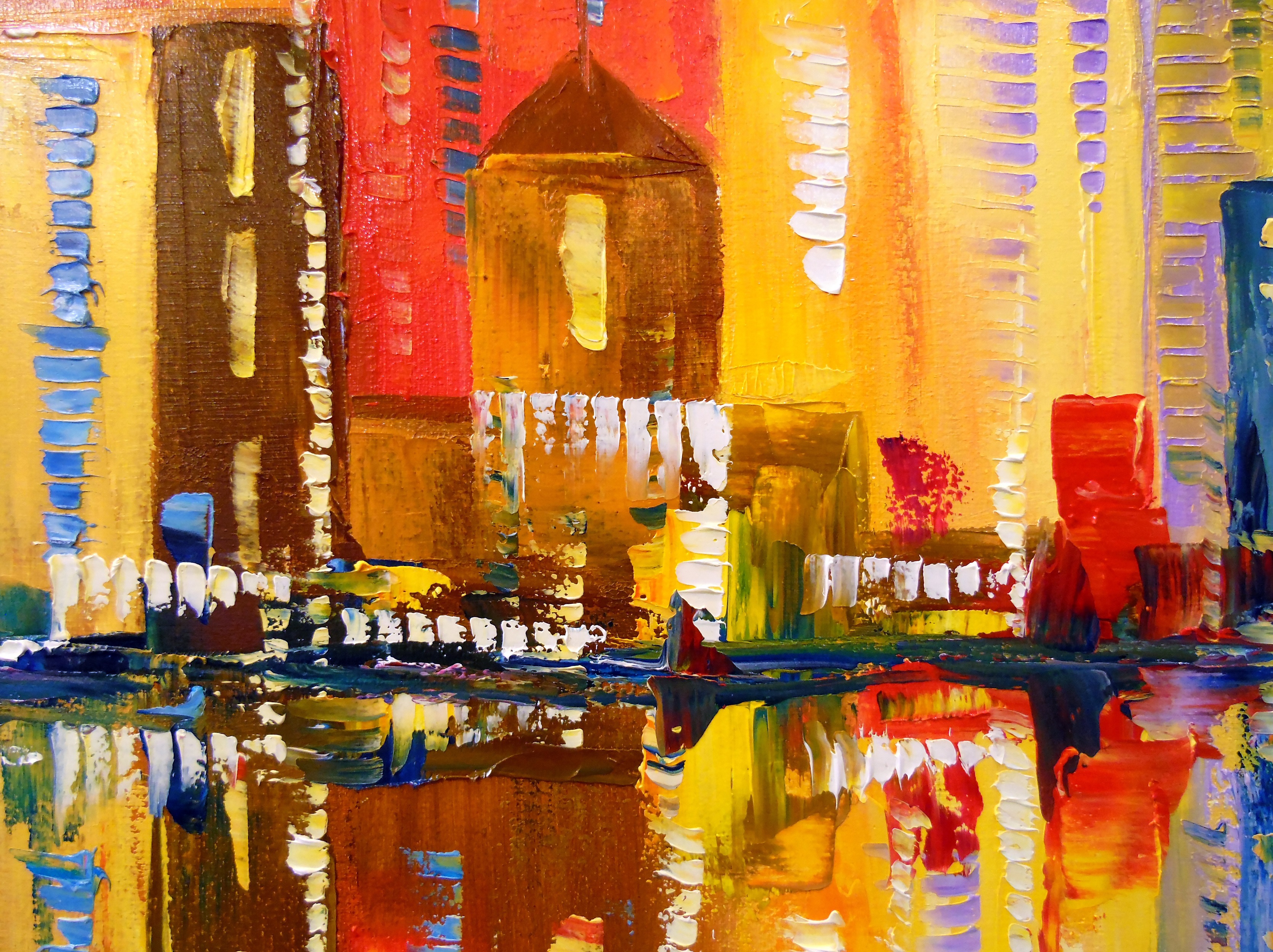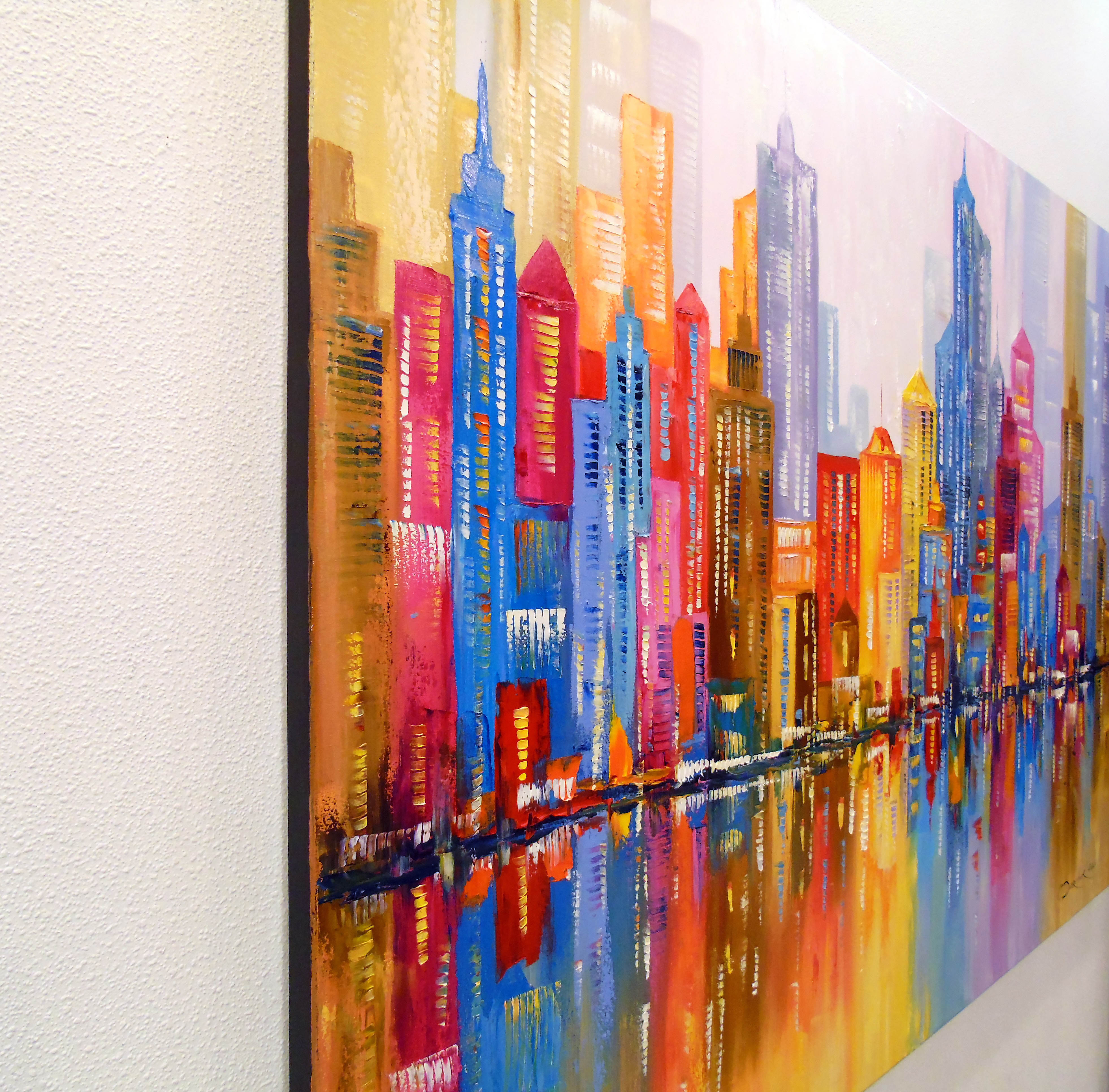 Rainbow city oil painting in a single copy on canvas without a frame as the edges are painted, 100% work with high-quality oil and palette knife, a picture for the interior of your home and positive emotions for the whole family . Ready to hang.