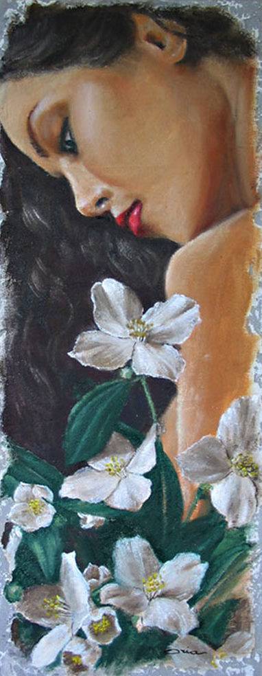 Obraz przedstawia subtelną scenę, gdzie w centrum uwagi znajduje się profil kobiety. Jej delikatne rysy twarzy kontrastują z intensywnie czerwoną szminką. Otaczają ją kwiaty, przypominające jaśmin, o śnieżnobiałych płatkach i żółtych środkach, które emanują spokojem i elegancją. Dominują tu ciepłe odcienie brązów i zieleni, które tworzą harmonijną paletę kolorów. Trochę tak, jakby natura i człowiek stapiali się w jedno. Atmosfera obrazu jest sielska, jak chwila zatrzymana w czasie. Styl artysty jest realistyczny, ale z nutą impresji. Detalicznie oddane elementy przyciągają wzrok. Technika, być może pastelowa, nadaje miękkość i delikatność. Obraz może budzić w widzu uczucie nostalgii. Wiesz, takie ciepłe uczucie spokoju. Czuję, jakby mówił: "Take a breath." Dzieciak mógłby powiedzieć: "Pani patrzy na kwiatki, jak ja na cukierki." Osobiście, obraz skłania mnie do refleksji nad ulotnością chwil. Czuć tu też nutę tajemnicy, jakby kryła w sobie historię kobiety. Zatracamy się w spojrzeniu, szukając czegoś więcej niż zwykła codzienność.