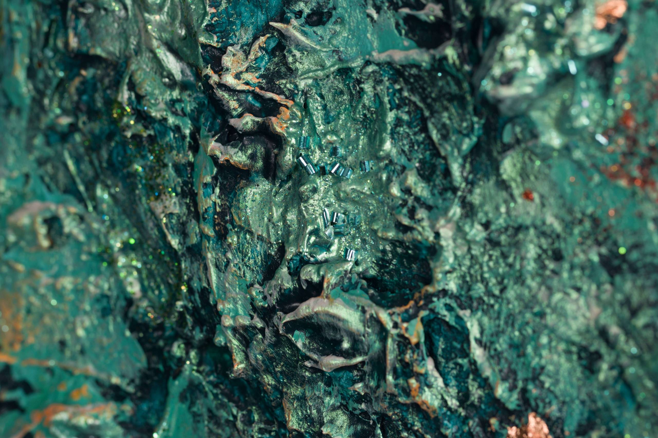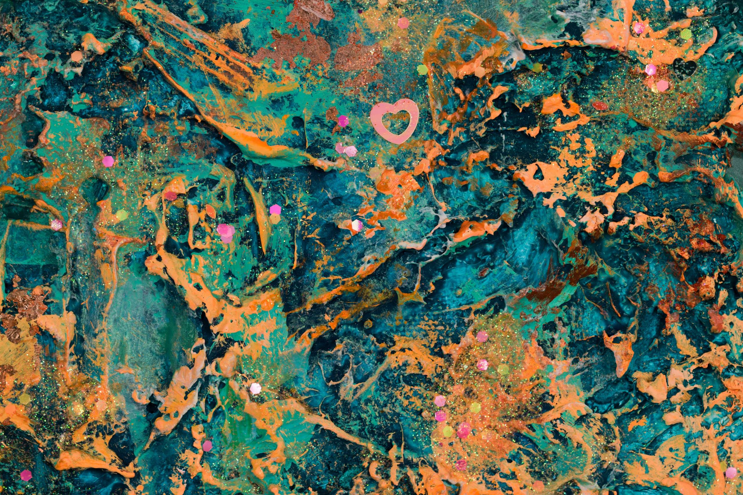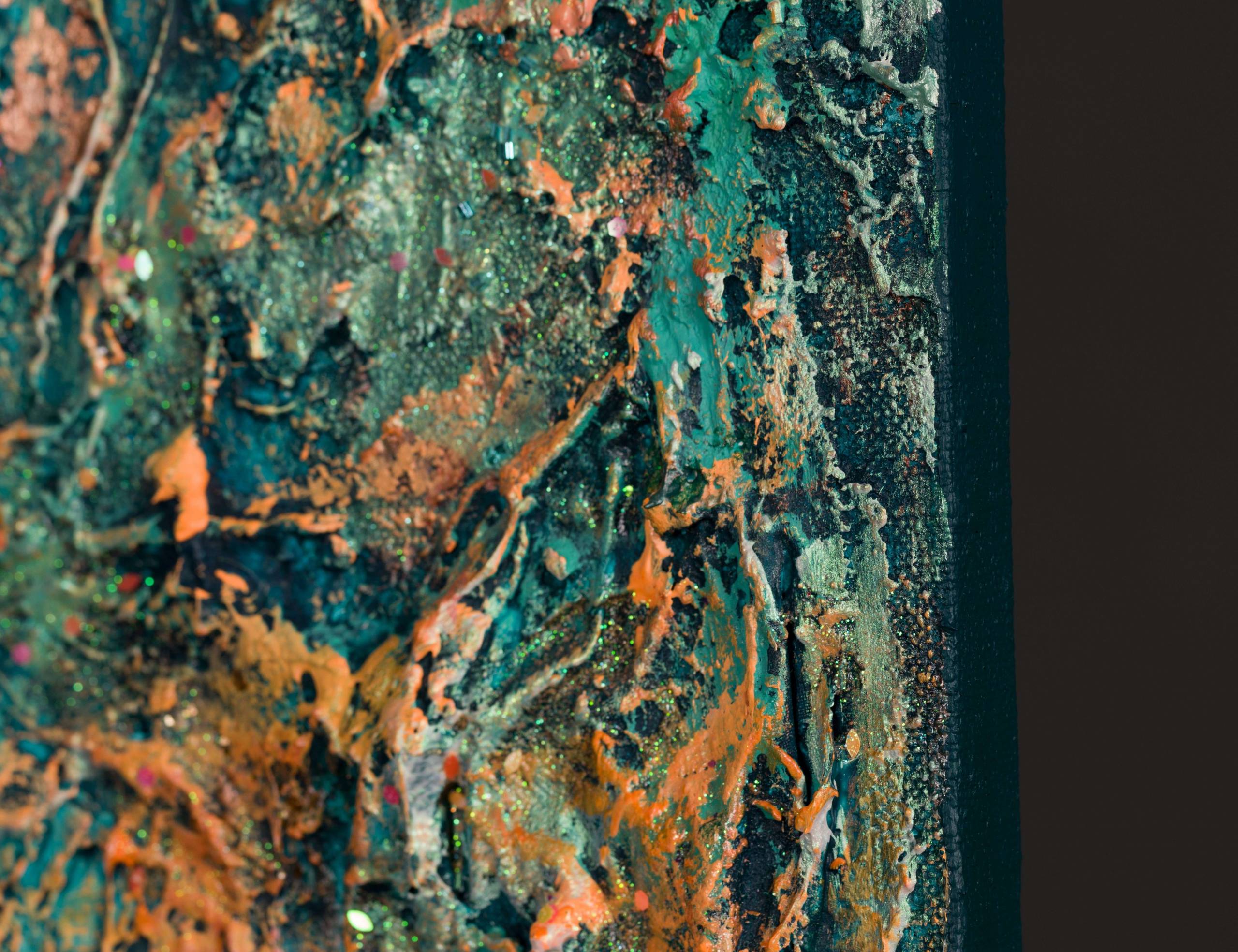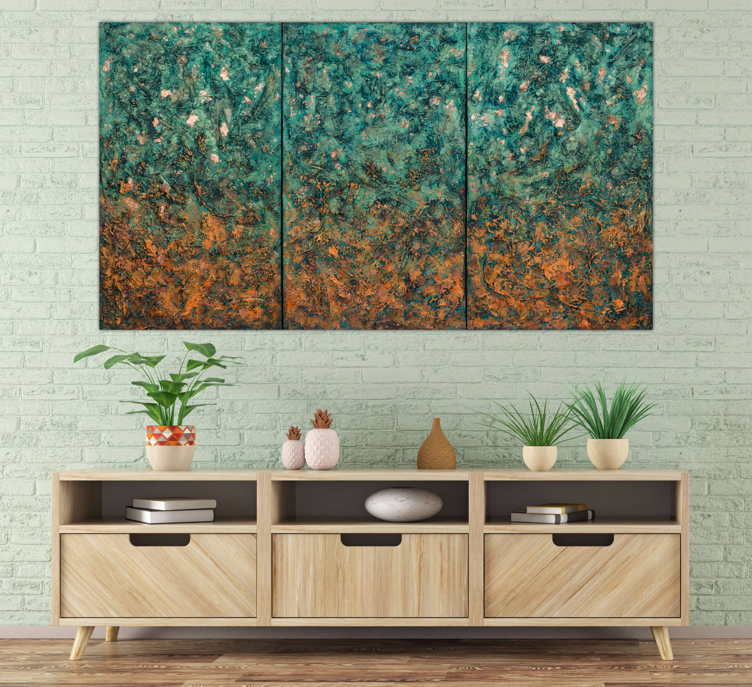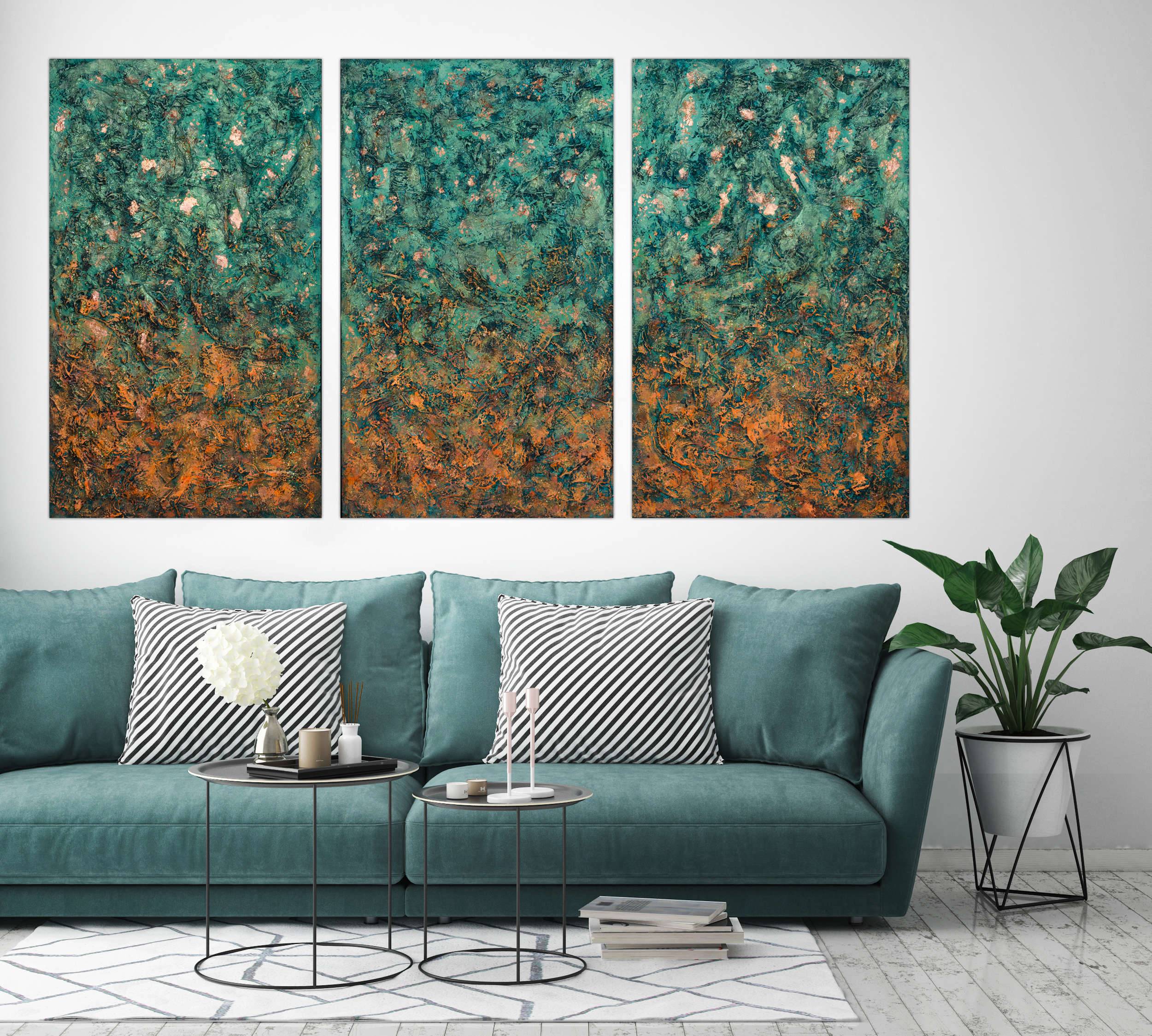 This is acrylic, glitter and copper leafs painting on high quality linen and custom made canvas. The style is defined by sculptural use of paint. It is 3-D, built-up mixture of many layers of thick gesso, paint, sand and other materials. Finished with a glaze of UV varnish to protect against sunlight and dust damage. The colors may look a little bit different depending on the screen. This artwork is signed and dated on the back. A signed Certificate Of Authenticity will be included with the artwork. Edges are painted so it doesn't require any frame. Size: triple canvas, 104 H x 186 W x 2 cm 41" x 73" x 0.8" Please feel free to contact me if you would like to ask any questions. __________________________________________________ © Pamela Rys