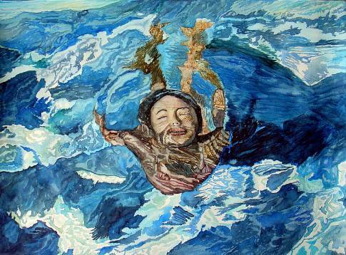 Obraz pełen energii i radości, przedstawia osobę z rozkosznie uśmiechniętą twarzą, swobodnie dryfującą wśród fal. Niebieskie, wodne tonacje dominują, przechodząc od jasnych błękitów do głębokich granatów. Wszystko to tworzy dynamiczną kompozycję, w której woda wydaje się wręcz tańczyć wokół postaci. W centrum całości znajduje się uśmiech, którego szczerość przyciąga uwagę. Styl artystyczny z wyraźnymi akcentami impresionizmu, z charakterystyczną, swobodną i żywą techniką pędzla. Jest coś w tym obrazie, co przypomina surfing w kalifornijskim słońcu. Popatrzyłem na to i aż się uśmiechnąłem! Gdzieniegdzie można poczuć lekki akcent nostalgii, jakby artysta przypominał sobie beztroskie chwile spędzone nad wodą. To takie 'happy place', które każdy czasami chciałby odwiedzić. Uroczy, kolorystyczny chaos fali inspiruje do własnych interpretacji. Mamo, a czy ja też mogę tak pływać z uśmiechem? Myśli krążą wokół wolności i braku jakichkolwiek barier. To dzieło na pewno wywołało reflexje o dzieciństwie i beztroskich latach.