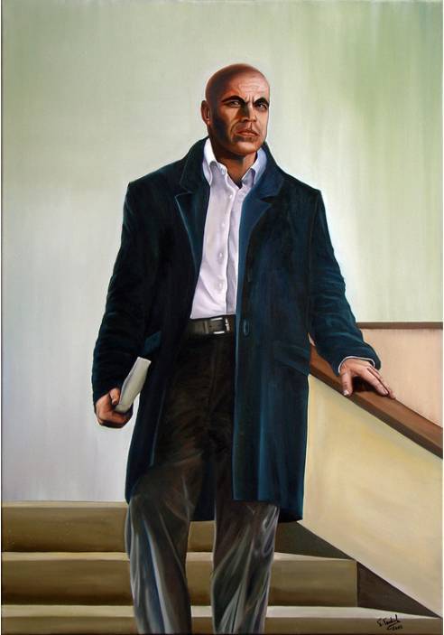 Obraz przedstawia mężczyznę schodzącego po schodach. Jego stylizacja w eleganckim płaszczu oraz białej koszuli przyciąga uwagę kontrastem kolorów. Tło utrzymane w stonowanych, pastelowych barwach przywodzi na myśl spokój i harmonię. Mężczyzna trzyma książkę w dłoni, a na jego twarzy maluje się skupienie. Kompozycja jest przemyślana, wszystkie elementy układają się w spójną całość. Atmosfera obrazu jest nieco tajemnicza. Można poczuć, że postać znajduje się w momencie refleksji, może podejmuje ważną decyzję. Styl dzieła jest realistyczny, artysta z precyzją oddał detale, zwracając uwagę na światłocień i fakturę materiałów. Wygląda to naprawdę "cool". Światło delikatnie podkreśla rysy twarzy, dodając głębi i trójwymiarowości. Widz może odczuwać ciekawość, zastanawiając się, dokąd mężczyzna zmierza i co myśli. Może to profesor idący na wykład, a może bohater powieści właśnie wyszedł z trudnego spotkania. Czuć tu subtelną grę emocji. Taki obraz może wywoływać szeroki wachlarz interpretacji. Albo ten pan idzie do szkoly, tak powiedziałby 7-latek. Obraz przyciąga uwagę swoją prostotą i elegancją, zachęcając do zanurzenia się w świecie przedstawionym.