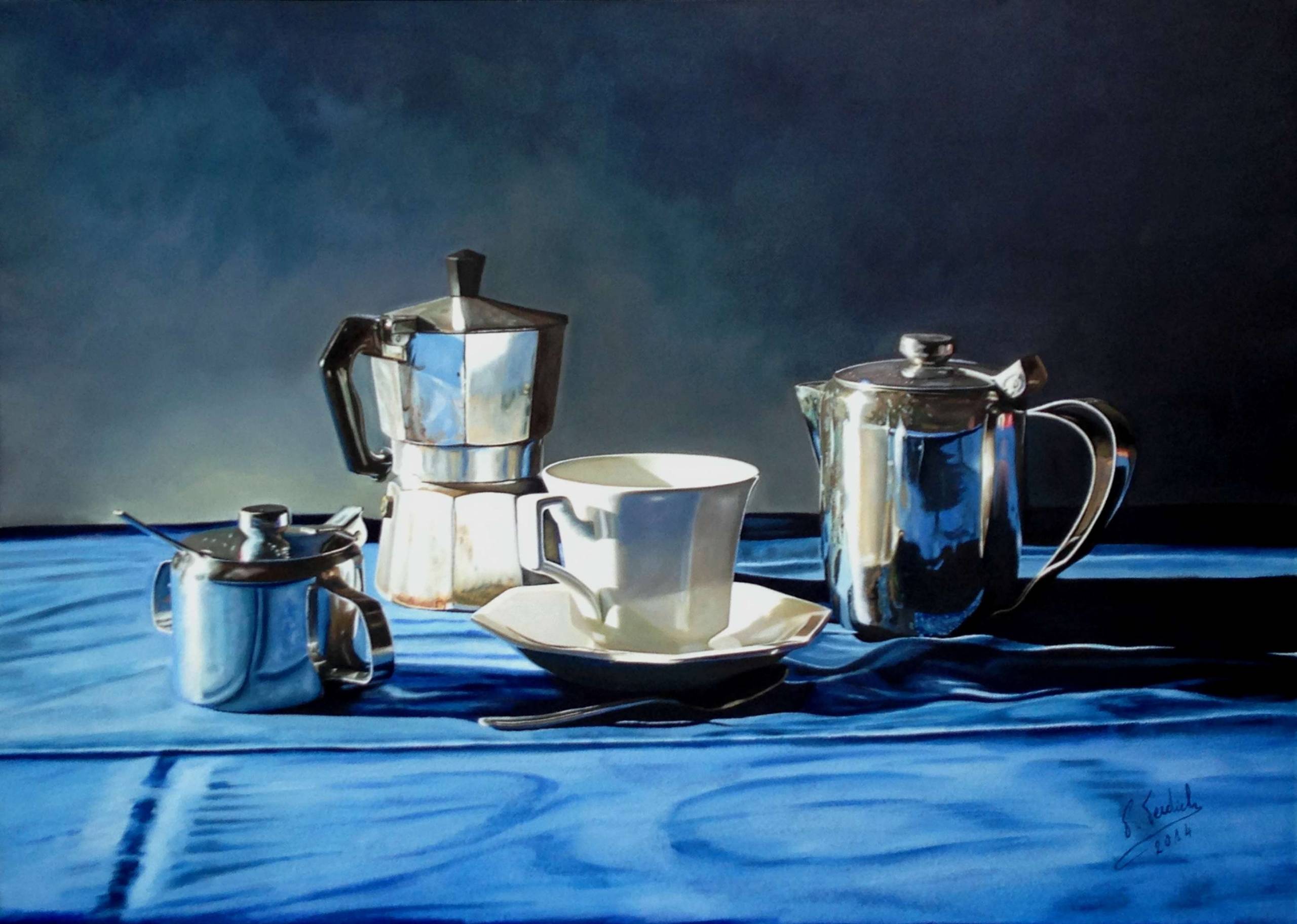 Oto obraz, na którym pierwsze skrzypce grają przedmioty codziennego użytku – metalowy dzbanek, czajnik, filiżanka i cukiernica, ustawione na intensywnie niebieskim tle. Kolorytu dodaje subtelne oświetlenie, podkreślające eleganckie refleksy na powierzchniach naczyń. Praca ta wydaje się być lekko realistyczna, niemal jak zdjęcie. Wygląda to naprawdę cool. Artysta zastosował technikę hiperrealizmu, z dbałością o detal, tłocząc każdy refleks światła dla podkreślenia metalicznego blasku. Nastrój tej kompozycji jest spokojny i refleksyjny, niemal jak poranna kawka w niedzielne, leniwie płynące przedpołudnie. Może pobudzać do refleksji na temat piękna ukrytego w prostocie. Patrząc na to cudo, niemal czuje się chłód stalowych powierzchni i ciszę pomieszczenia, w którym mogłaby się znaleźć ta martwa natura. “Chciałbym się tam pobawić” – powie mały widz. Obraz ten wywołuje poczucie harmonii, ale również trochę tęsknoty za chwilą relaksu w domowym zaciszu. A touch of magic sprawia, że te zwykłe przedmioty nabierają niezwykłego uroku, wciągając odbiorcę w świat zatrzymany w kadrze. Cudowne, prawda?