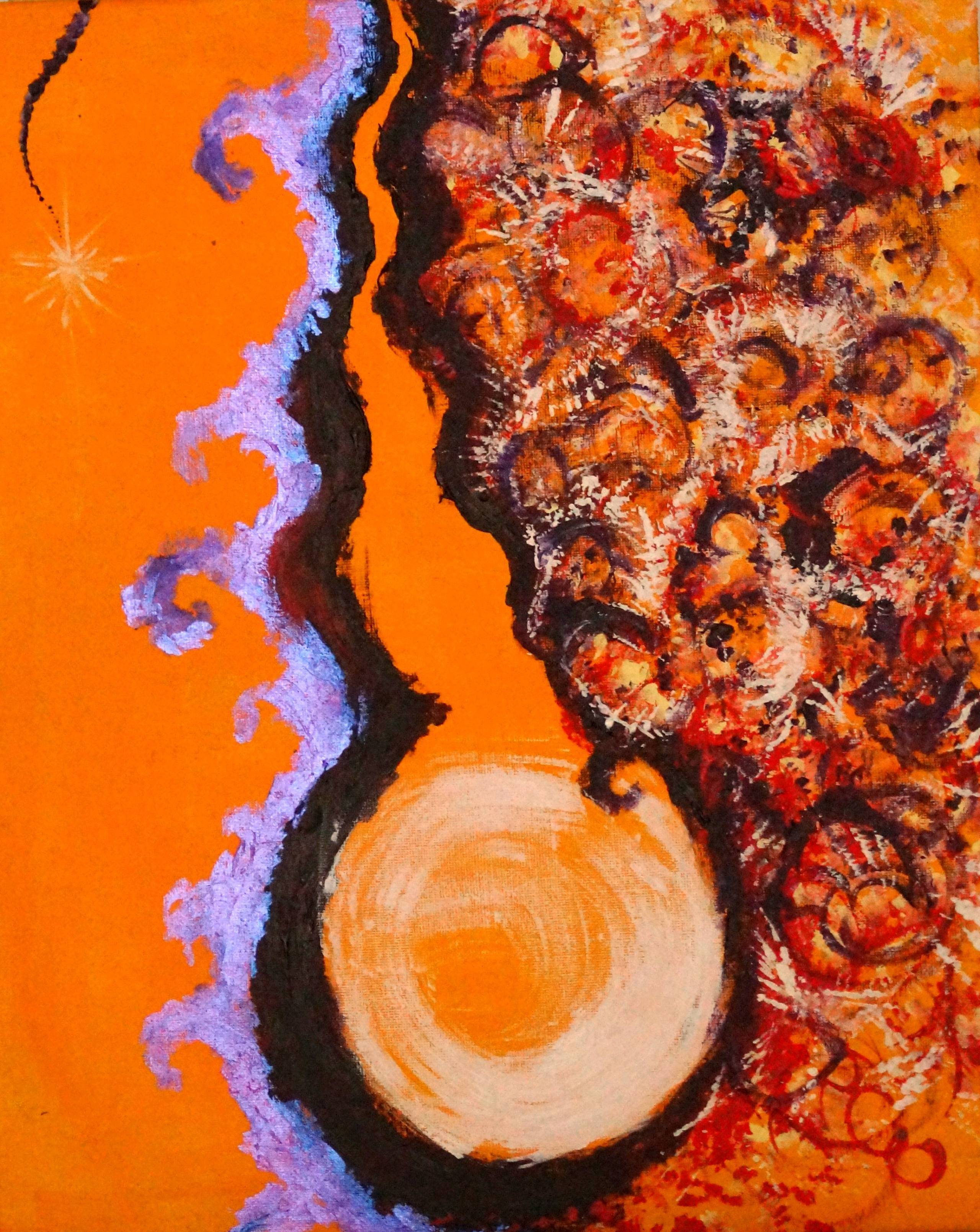 Na obrazie dominuje energetyczny, pomarańczowy kolor, który jest tłem dla dynamicznej kompozycji pełnej kontrastów. Po lewej stronie widzimy ciemny kształt, przypominający rozedrgany cień, otoczony jasnofioletowymi falami. Znajome to? Wygląda jak falująca wstęga tańcząca w powietrzu. Po prawej gorąco czerwono-brązowe plamy tworzą skomplikowany wzór, jakby chaotyczny tłum zatrzymany w ruchu. Środkowe miejsce zajmuje duży, okrągły kształt, jakby zasłona, która ma coś ukryć. Atmosfera tego dzieła jest pełna napięcia, jakby burza zaraz miała wybuchnąć. Styl obrazu przypomina abstrakcyjne ekspresjonizm, gdzie artysta wykorzystuje grube plamy farby oraz bogatą teksturę, by oddać głębię emocji. Co ciekawe, zastosował też technikę impastu, której efektem są wyraźne, niemal trójwymiarowe linie. To dzieło wywołuje mieszankę emocji. Może skłonić do refleksji nad wewnętrznym chaosem, ale i zachwycić swoją energią oraz dynamiką. Można poczuć się jak na rollercoasterze emocji, wciągniętym przez wir kolorów i kształtów. Wow, jak w kalejdoskopie! Takie obrazy nie pozwalają przejść obok obojętnie. I choć trudno ująć w słowa jego pełne znaczenie, art piece pozostawia widza z poczuciem niepokoju, ale i fascynacji.