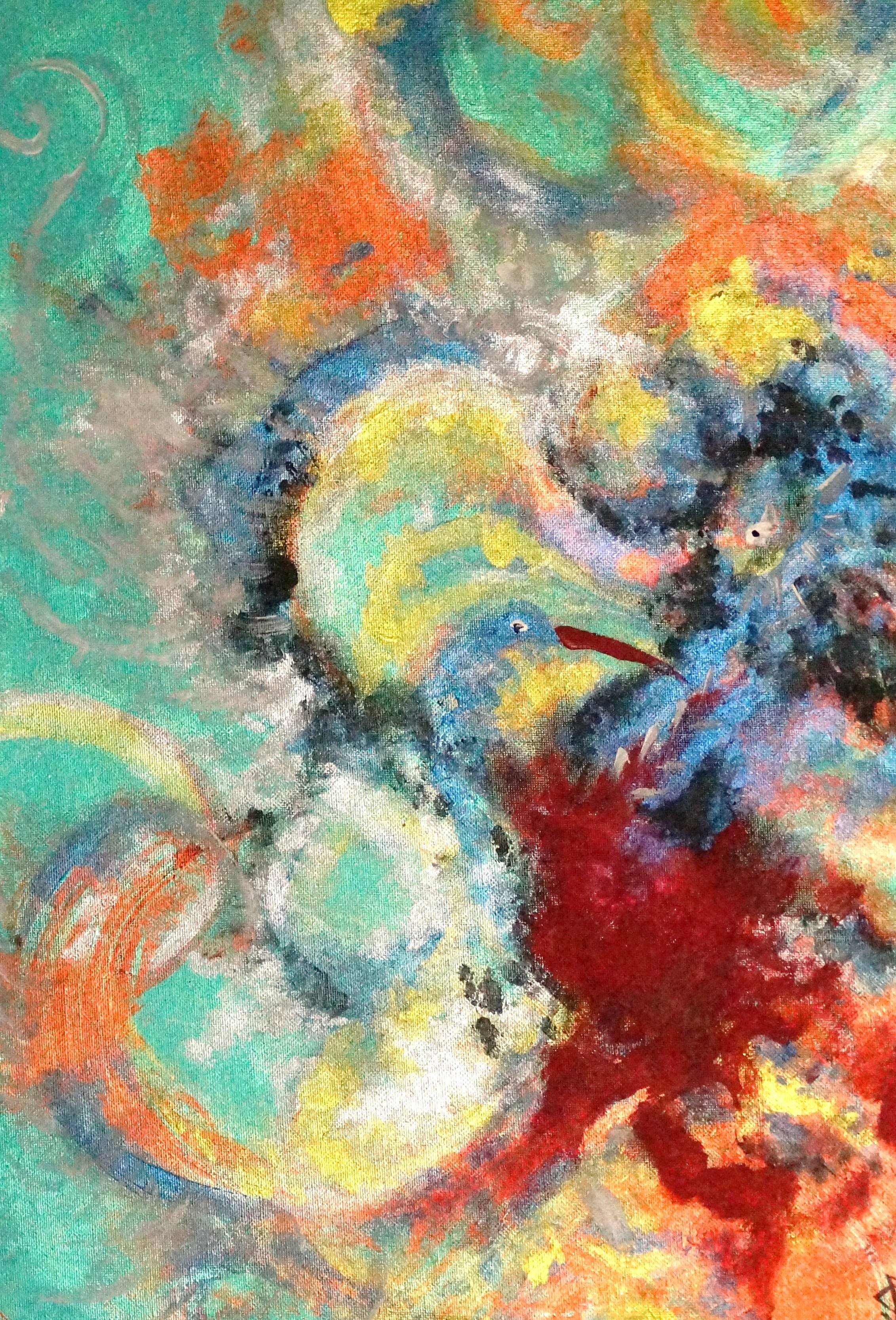 Na obrazie dominują żywe kolory – turkus, pomarańcz, żółcienie i czerwienie, które wirują w chaotycznej kompozycji. W centrum znajdują się wiry kolorów, przypominające abstrakcyjne pióra ptaka, które płynnie przechodzą od jednego odcienia do drugiego. Nastrój obrazu jest dynamiczny, jak szalone tango kolorów tańczących po płótnie. Technika malarska to zdecydowanie wyrazista colorful abstractions, z wyrazistymi pociągnięciami pędzla i impastem, co nadaje pracy teksturę i głębię. Emocje budzą się tu mieszane – od zachwytu po zdezorientowanie. Może ktoś zobaczy drzemiącą w tym chaosie historię, a ktoś inny tylko splątanie myśli. Dla 7-latka to może być po prostu bałagan kolorów namalowany przez niesfornego ptaka. Obraz inspiruje do zagłębienia się w świat wyobraźni, pozwala czytelnikowi odnaleźć w nim własną narrację. Atmosfera wprowadza widza w stan zadumy, ale i subtelnej radości.