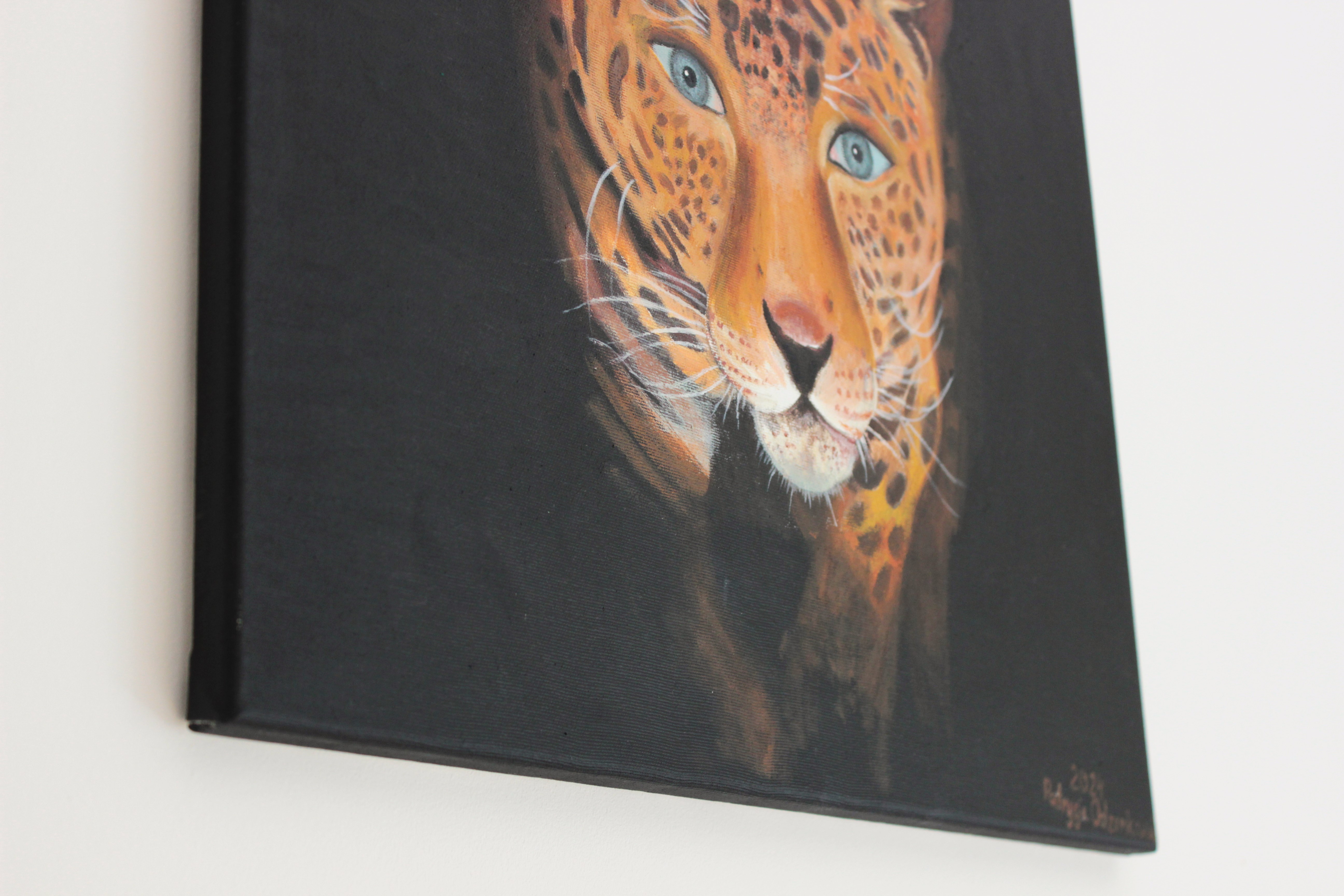 Na obrazie widzimy majestatycznego lamparta, którego spojrzenie hipnotyzuje. Oczy, błękitne jak niebo w letni dzień, kontrastują z jego złocistą sierścią pokrytą cętkami. Kolory są intensywne, ale subtelne, a cieniowanie dodaje mu trójwymiarowości. Kompozycja skupia się na twarzy zwierzęcia, która zajmuje centralne miejsce, wydobywając emocjonalną głębię portretu. Obraz jest jakby zaklęty w ciszy, emanuje spokojem i jednocześnie niewypowiedzianą mocą. Masz wrażenie, że patrzy prosto w duszę. Artysta użył techniki olejnej, co dodaje elegancji. Pociągnięcia pędzlem są płynne i precyzyjne. It's stunning! Czuć wrażliwość i szacunek do natury. Nastrój jest jednocześnie dziki i melancholijny. Wywołuje zachwyt i trochę niepokoju – co kryje się za tymi oczami? Przypomina mi się, jak mój kot patrzy, gdy chce jedzenia. Zwykłe, a magiczne. Pisząc, czuję jakby oddech dzikiej Afryki. Kiedy się przyglądasz, masz ochotę przenieść się w ten tajemniczy świat. Bez względu na wiek, obraz pobudza wyobraźnię i zachęca do zadumy nad pięknem natury.