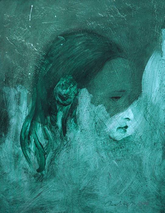 Obraz emanuje mistyczną aurą, zachwycając dominującymi odcieniami zieleni i turkusu. W centrum widzimy subtelny zarys twarzy, delikatnie wyłaniającej się zza mgły. Włosy, o wyrazistych, płynnych liniach, tworzą harmonijną kompozycję z resztą dzieła. Tło jest pełne abstrakcyjnych, dynamicznych ruchów pędzla, które dodają całości tajemniczej głębi. Artysta, stosując technikę impasto, nadał fakturze obrazowi, co sprawia wrażenie, jakby można było zatopić się w jego powierzchni. Nastrój obrazu jest melancholijny, lecz na swój sposób kojący. To jak szept w wietrze, delikatne westchnienie uczuć. Artystyczny styl balansuje między impresjonizmem a surrealizmem, sprawiając, że widz czuje się jak w innym świecie. Dzieło przywołuje refleksję nad ulotnością chwili, a także prowokuje do zadawania sobie pytań o swoje wewnętrzne emocje. It's like a dream—one you don't want to wake up from. Patrząc na obraz, czujesz dziwny spokój, jakbyś przez moment był w świecie ulotnych marzeń. A może nawet troszkę smutku, który jednocześnie daje poczucie piękna. Dla 7-latka mogłoby to być: "Ona wygląda jak wróżka w chmurze". Całość sprawia wrażenie głębokiego zanurzenia, niczym w spokojnym oceanie myśli, gdzie cisza staje się muzyką. Obraz ten to nie tylko gra kolorów i form, ale przede wszystkim emocji, które pozostają na długo z widzem.