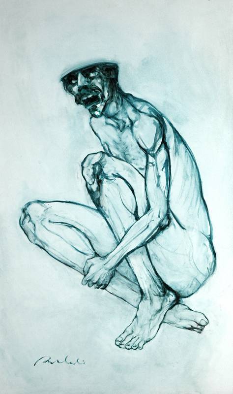 Na obrazie dominują odcienie niebieskiego i szarości, tworząc wrażenie chłodu i pewnej izolacji. Postać w centrum przybiera skręconą pozycję, z rękami splecionymi wokół nóg, co dodaje napięcia całej kompozycji. Kreska jest dynamiczna, niemal szkicowa, co podkreśla ekspresyjność formy. Atmosfera obrazu jest ciężka, nieco melancholijna, jakby artysta chciał uchwycić moment zadumy czy introspekcji. Styl artystyczny nawiązuje do figuralnego ekspresjonizmu, o czym świadczy dramatyczne potraktowanie ciała i emocji. Technika, jaką posłużył się twórca, uwydatnia kontrasty między linią a tłem, tworząc efekt głębi i tajemniczości. To obraz, który może wzbudzać w odbiorcy uczucia niepokoju albo współczucia. Wywołuje refleksję nad kruchością ludzkiej egzystencji. "Hmm, dziwny pan siedzi na podłodze" – tak mogłoby to opisać 7-letnie dziecko. Patrząc na dzieło, można odczuć subtelną grę między sensem a formą, gdzie każde pociągnięcie pędzla jest jak whisper – szept o wewnętrznych zmaganiach człowieka. Wygląda to trochę jak labirynt emocji i myślę, że artysta chciał nas zaprosić do tej osobistej podróży. To coś więcej niż tylko obraz – to okno do ludzkiej duszy, które stawia pytania bez łatwych odpowiedzi.