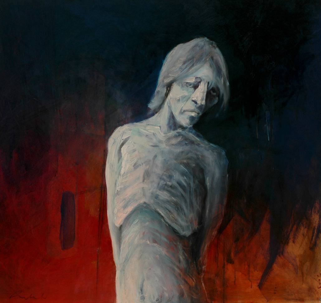Obraz emanuje mrocznym i tajemniczym klimatem. Postać na pierwszym planie, wyrzeźbiona w odcieniach szarości i bieli, kontrastuje z płonącym tłem, gdzie dominują głębokie czerwienie i ciemne, niemal czarne, kolory. Kompozycja jest dynamiczna, a kształty ostre i wyraźne. Tło zdaje się wrzeć, co tworzy atmosferę napięcia. Technika artystyczna sugeruje użycie grubo nałożonej farby i ekspresyjnych pociągnięć pędzla, co dodaje obrazu dramatyzmu. Patrząc na ten obraz, można poczuć smutek i osamotnienie. Postać wygląda na przygnębioną, jakby skubnęła kawałek Night, który ją otacza. Artysta używa technik, które przypominają styl ekspresjonistyczny. Dynamiczność i emocje wyrażone w obrazie sprawiają, że budzi on różnorodne emocje. Może wywołać odczucie niepokoju lub refleksji nad kruchością życia. Dla siedmioletniego dziecka to obraz może wyglądać jak straszna przygoda w ciemnym lesie. Ciemne kolory sprawiają, że jest trochę scary. Dla mnie ten obraz to jak patrzenie w głąb duszy, pełen refleksji i tajemnicy. Emanuje pewnym rodzajem niepewności, ale i fascynującej tajemnicy.
