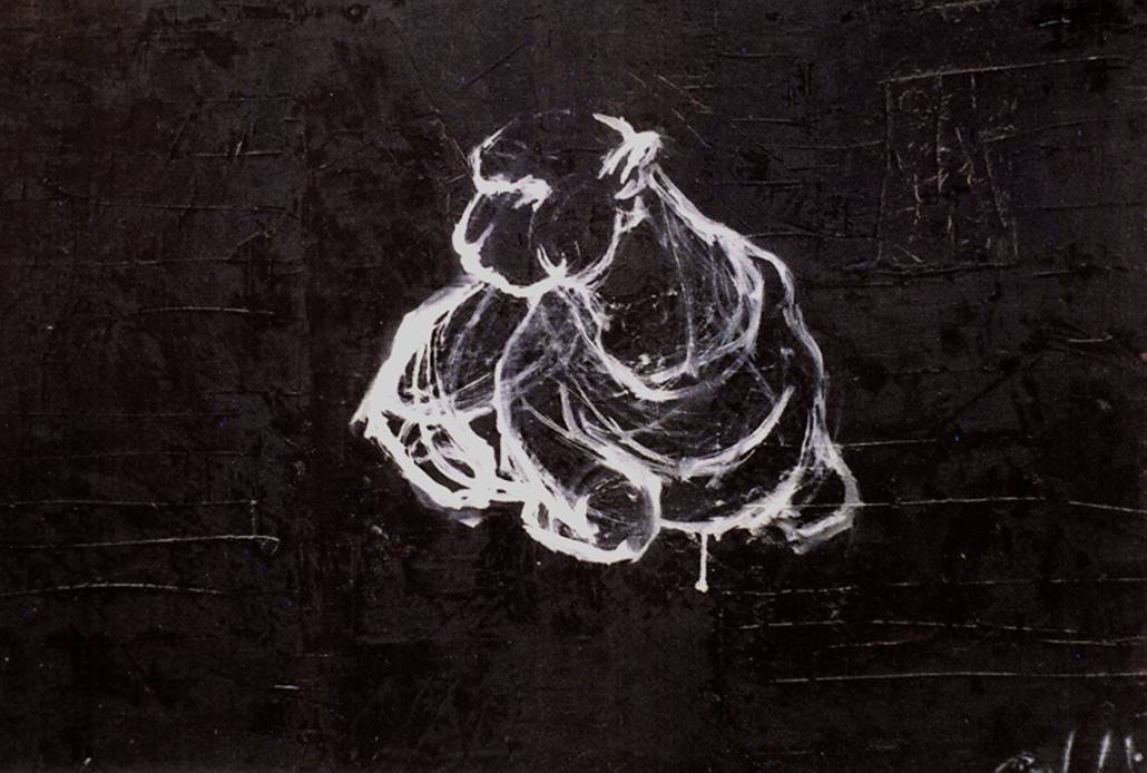 Obraz emanuje tajemniczą i nieco mroczną aurą. Na czarnym tle wykwita biała, abstrakcyjna forma. To jakby duch lub wizja w jednym. Kształty są chaotycznie splecione, przypominają mgłę lub dym unoszący się w powietrzu. Artysta zastosował technikę impasto, gdzie farba naniesiona jest grubą warstwą, co dodaje głębi i tekstury. Biały kolor kontrastuje z ciemnym tłem, podkreślając emocje niepewności i niepokoju. Może to, co widzimy, to zagubiona dusza szukająca spokoju? Dzieciak patrzący na obraz powiedziałby: "To wygląda jak misiek zrobiony z chmurek!" Każdy, kto spojrzy na ten obraz, może poczuć nutkę refleksji nad ulotnością chwil. Ten artwork zdecydowanie ma w sobie coś intrygującego, co przyciąga wzrok na dłużej. Trochę jak sen, który próbuje się przypomnieć. Wrażenie jest takie, że forma zawieszona jest w próżni. Czy czujemy melancholię, czy może fascynację? Może nawet ciekawość, co jeszcze skrywa to ciemne tło.