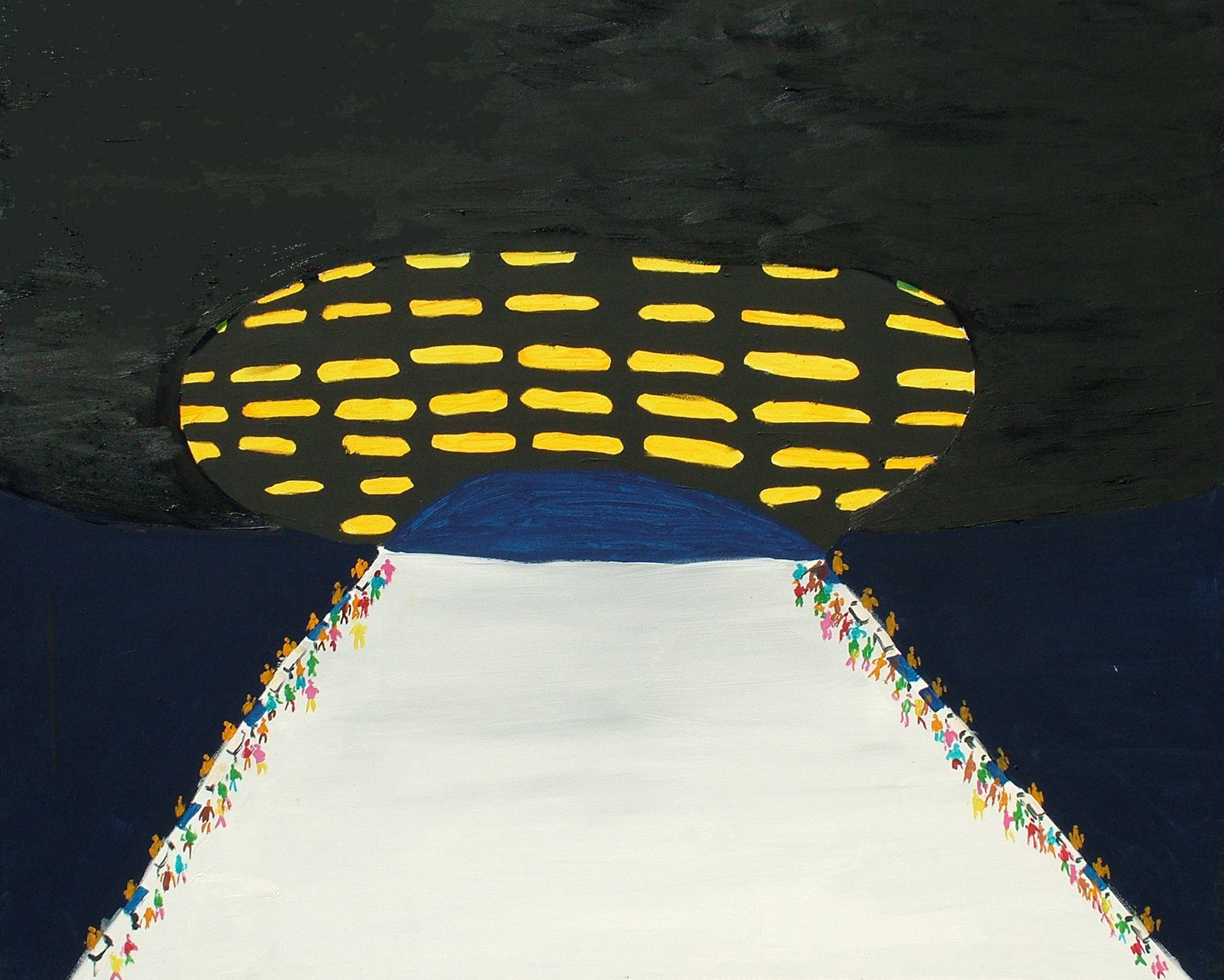 Obraz ukazuje niecodzienną scenę z wyraźnym kontrastem barwnym i formą, która przyciąga wzrok. Na pierwszym planie rozciąga się szeroka, jasna droga, chyba śniegowa. Prowadzi ona do tajemniczego, ciemnego obiektu przypominającego kosmiczny statek z jasnożółtymi światłami, które niby małe księżyce świecą wśród ciemności. Po obu stronach drogi tłum kolorowych postaci - jakby z bajki - ubranych w różnobarwne ubrania, tworzą dynamiczny, cwany kalejdoskop barw. Atmosfera obrazu jest pełna tajemnicy, może trochę niepokoju, ale też fascynacji. Czuć wieczorny chill. Artysta zastosował dość surową technikę, silnymi, odważnymi pociągnięciami pędzla podkreślając kontrasty i przyciągające oko szczegóły. Może nawet trochę prymitywna forma i prostota tego przedstawienia nadaje mu autentyczności i emocjonalnej głębi. A może to statek kosmiczny, który chce podkraść się niepostrzeżenie i porwać ludzi w stronę gwiazd. Takie myśli może wywołać ten obraz u patrzącego. Trafia do mnie ten moment zamyślenia, kiedy wyobrażam sobie, co by było gdyby wszyscy ci ludzie naprawdę lecieli na spotkanie nieznanego. Wow, powiedziałby 7-latek. Ten obraz odrobinę przypomina mi science fiction, jest taki cool. Choć stylizacja przypomina dzieła artystów naiwistów, to nie brakuje w tym odrobiny nowoczesnego twistu. Czyżby artysta starał się połączyć przeszłość z przyszłością w jednym kadrze.