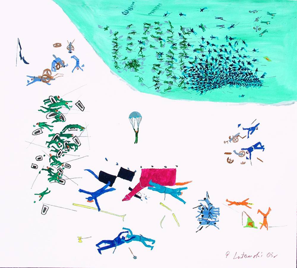 Na obrazie dominuje białość, na której tle pojawiają się skupiska intensywnych kolorów. W lewym górnym rogu widzimy jasnoniebieskie i zielone formy, które mogą przypominać chmurki. Obok nich niebiesko-czerwone postacie jakby tańczyły na bieli płótna. Patrząc na to, można się poczuć jak w magicznym świecie. Atmosfera jest dynamiczna, z pewnym chaosem — jak w parku zabaw pełnym dzieci. Styl artysty wydaje się balansować na granicy abstrakcji i figuralności. Być może to jest mix, który intryguje. Charakterystyczne kreski i kształty sugerują użycie techniki markerów lub akwareli. Elementy są rozrzucone, przez co można interpretować ten obraz jako metaforę życia — pełnego niespodzianek i przypadkowości. Daje to poczucie spontaniczności, co przypomina wielobarwny kolaż wspomnień. Na pierwszy rzut oka myślisz sobie, wow, ile tu się dzieje. Patrzę na to wszystko i zastanawiam się, czy artysta próbował uchwycić ulotne chwile zabawy. "To wygląda jak wyścigi cukierków!", powiedziałby mały Jaś. Obraz zawiera coś nieuchwytnego, co może wzbudzać nostalgię i radość zarazem. It has that whimsical touch, który sprawia, że chce się do niego wracać.
