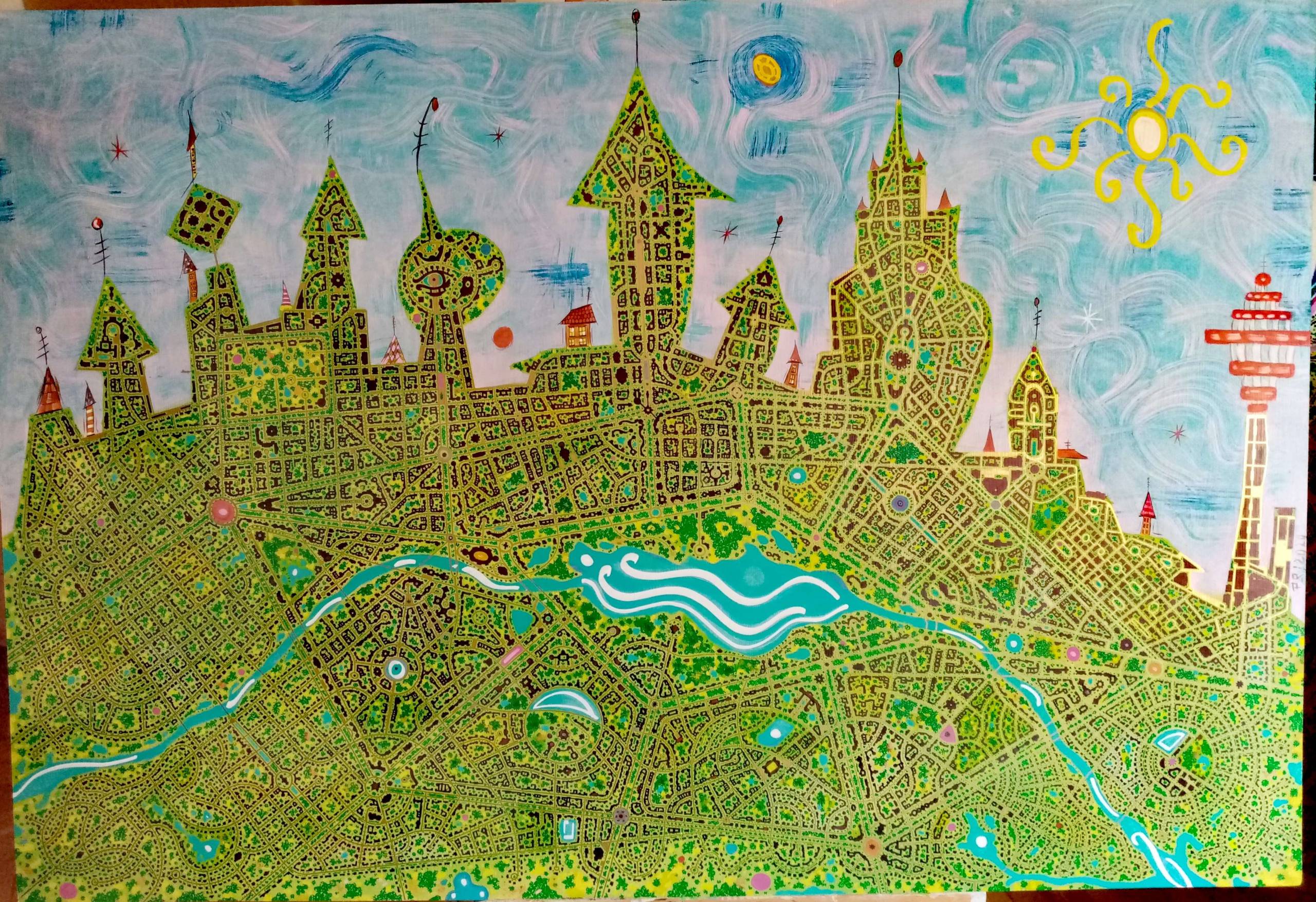 Obraz przedstawia bajeczne, zielone miasto pełne krętych uliczek i fantazyjnych budynków. Kształty są niezwykle geometryczne, przypominające labirynt lub rysunek techniczny, ale ubrany w żywe barwy. Zieleń dominuje, tworząc poczucie harmonii z niebieskim niebem, nad którym unoszą się wiry chmur. Taki pejzaż potrafi przenieść nas w zupełnie odrealniony świat. Atmosfera jest radosna, a w powietrzu czuć beztroskę i dziecięcą radość. Artysta posługuje się techniką pointylizmu, co widać w dokładnym rozmieszczeniu kolorowych kropek tworzących struktury miasta. Różnorodność elementów sprawia, że widz odnajduje nowe szczegóły, za każdym razem odkrywając coś nowego. Czujesz się jak odkrywca w nieznanym, kolorowym świecie. Kiedy patrzę na ten obraz, przypomina mi się moje dzieciństwo i marzenia o nieznanych krainach. To, co najbardziej przyciąga uwagę, to niesamowicie “vivid” kolory, które od razu wpadają w oko. To takie fajne, jakby ktoś narysował miasto, które istnieje tylko w snach. Obraz przywołuje uśmiech i uczucie nostalgii, sprawiając, że chcesz zostać tam na dłużej.