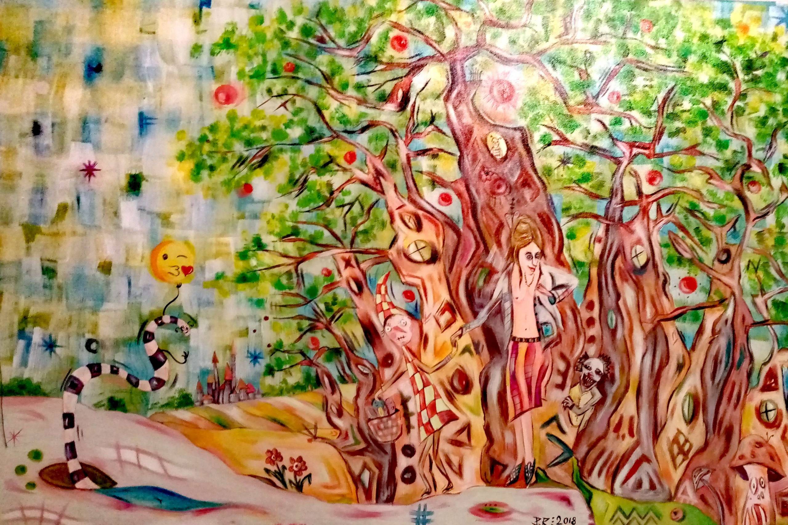 Obraz tętni życiem i fantazją. Na pierwszym planie widzimy tajemnicze drzewo o pokręconych gałęziach, które emanuje kolorami: zielenie, brązy i czerwienie łączą się w magiczny sposób. Wśród gałęzi kryją się postacie, w tym uśmiechnięty klaun i osobliwie wyglądający człowiek w pasiastych spodniach. Ich twarze pełne są emocji – od lekkości do niepokoju. Tło to delikatne pastele nieba, z unoszącymi się balonami w kształcie uśmiechniętych buziek, które dodają obrazu lekkości i humoru. Drzewo wygląda jak z bajki – jak z opowieści, którą opowiada się dzieciom przed snem. Atmosfera obrazu jest pełna magii i surrealizmu, balansując między radością a lekko niepokojącym snem. Styl przypomina coś w rodzaju naiwnego art, z odrobiną abstrakcji i surrealizmu. Kiedy patrzysz, czujesz pokusę, aby tam wejść, zgubić się w tym kolorowym świecie. Obraz może wywołać w odbiorcy szeroki wachlarz emocji – od zadziwienia po refleksję nad dziecięcymi marzeniami. Widzisz, te postacie wyglądają jak z książki, którą mogłoby napisać 7-letnie dziecko – pełne beztroski i wolności. Artysta posłużył się techniką swobodnych pociągnięć pędzla, co dodaje dynamiki i energii. Jest tu taki vibe, jakby całe to przedstawienie chciało ci powiedzieć, że świat jest miejscem pełnym niespodzianek. Obraz zostawia przestrzeń dla indywidualnej interpretacji i może inspirować do osobistej refleksji nad tym, co w życiu naprawdę ważne.